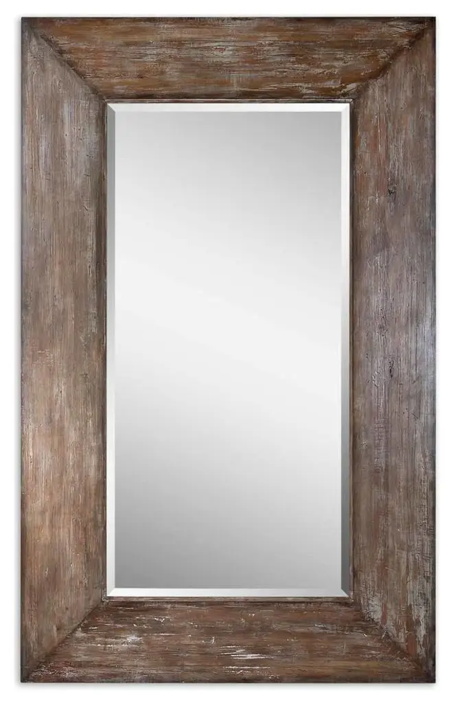 The Langford Floor Mirror from Uttermost features a bold 10-inch-wide frame with antiqued hickory undertones, a light gray wash, and burnished distressing for a rustic modern appeal. The generously beveled mirror adds depth and dimension, while the versatile design allows for horizontal or vertical hanging. Designed by Carolyn Kinder, this simple mirror complements both contemporary and rustic interiors with its signature charm.