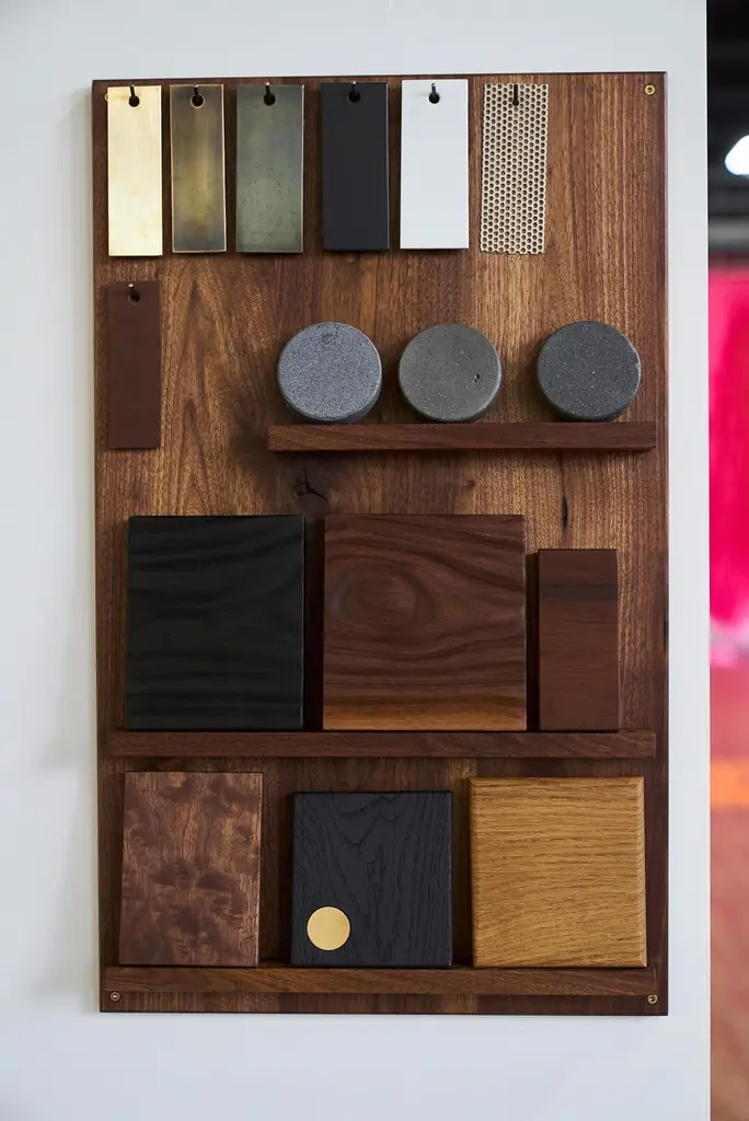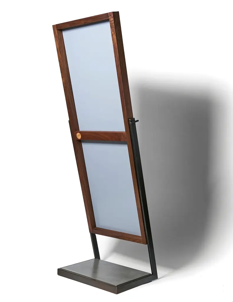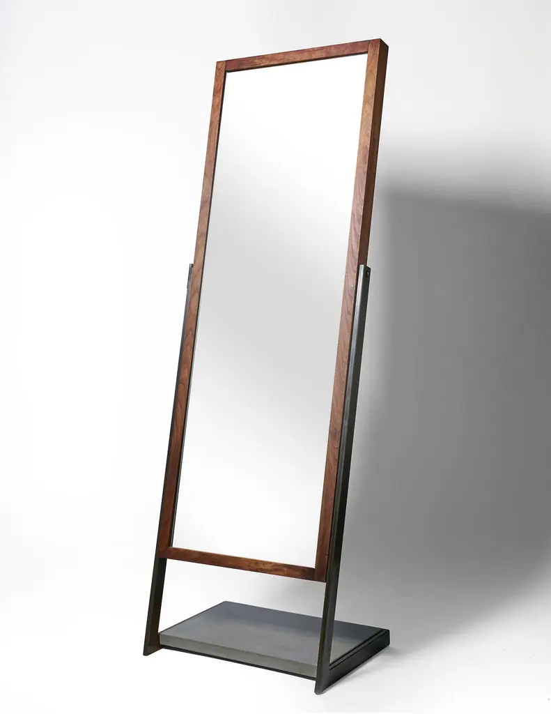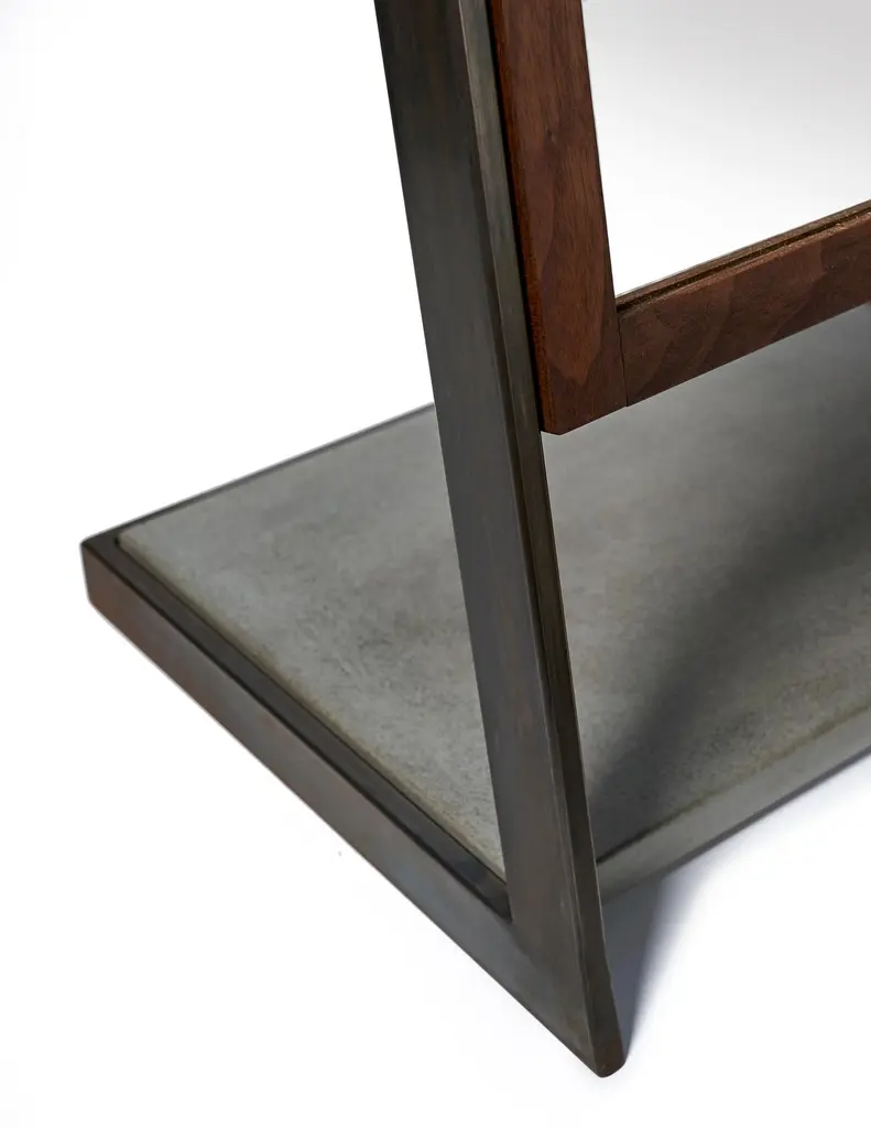 Full length mirror imagined in a new way with a perfect balance in both materials and lines. A wrap around hand blackened steel frame holds a lower platform section of charcoal concrete at the base. Suspended in this frame is a full length mirror surrounded by a black walnut frame. Although the mirror is designed and held at an optimal viewing angle when aligned with it's frame it also boasts a handmade set knob to allow the user to adjust the angle when desired. Can be customized with metal and hardwood options and finishes to fit your needs.