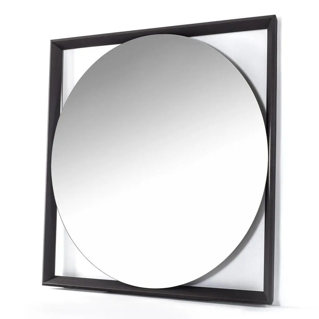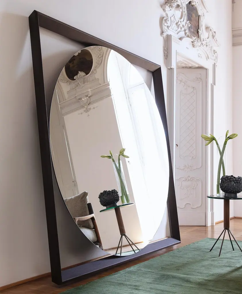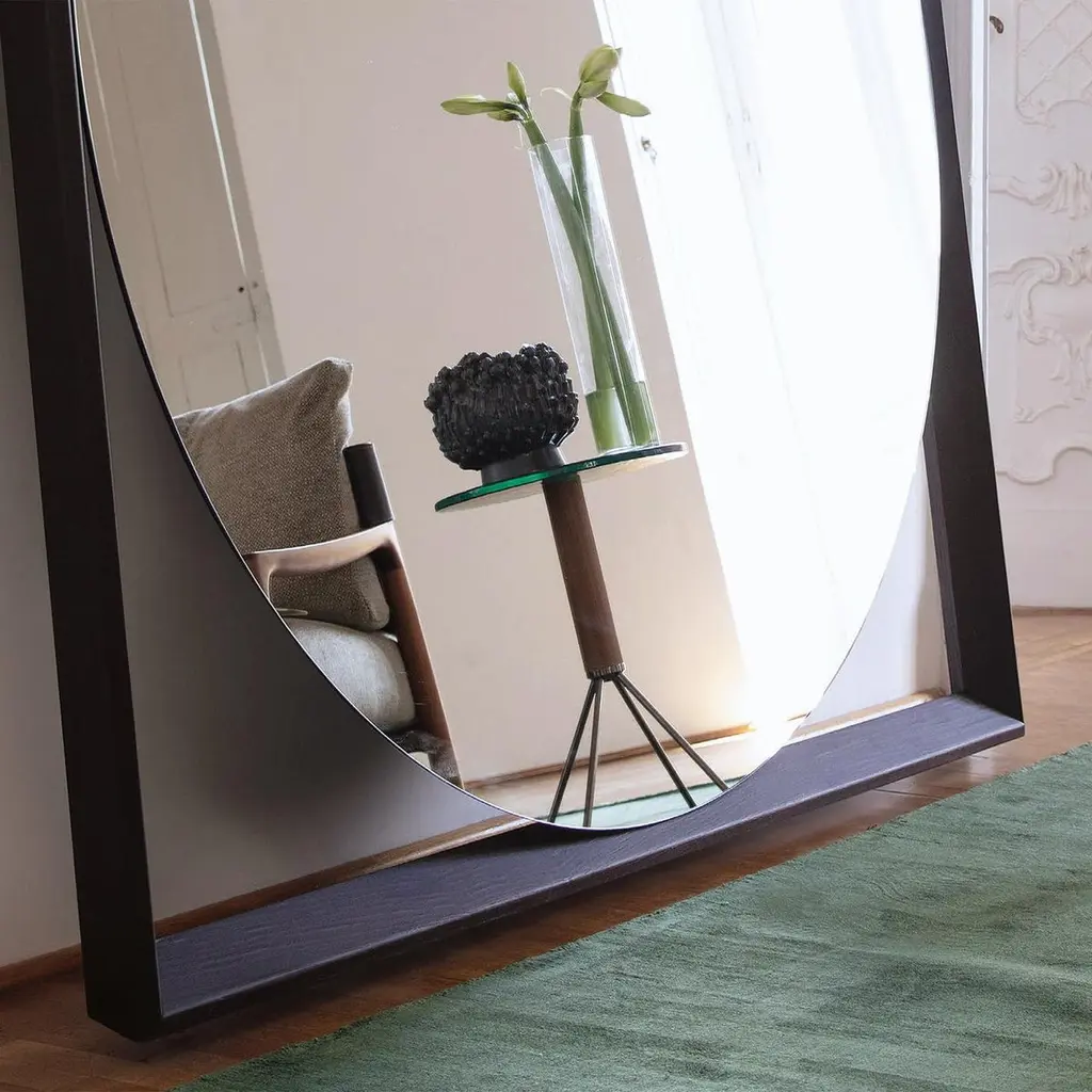 Mirror Loma Gate with solid ash frame in blackenedstained finish. With round mirror glass. Loma Gate Mirroris a floor mirror or a wall mirror. Also available with framein walnut wood in natural finish, on request.