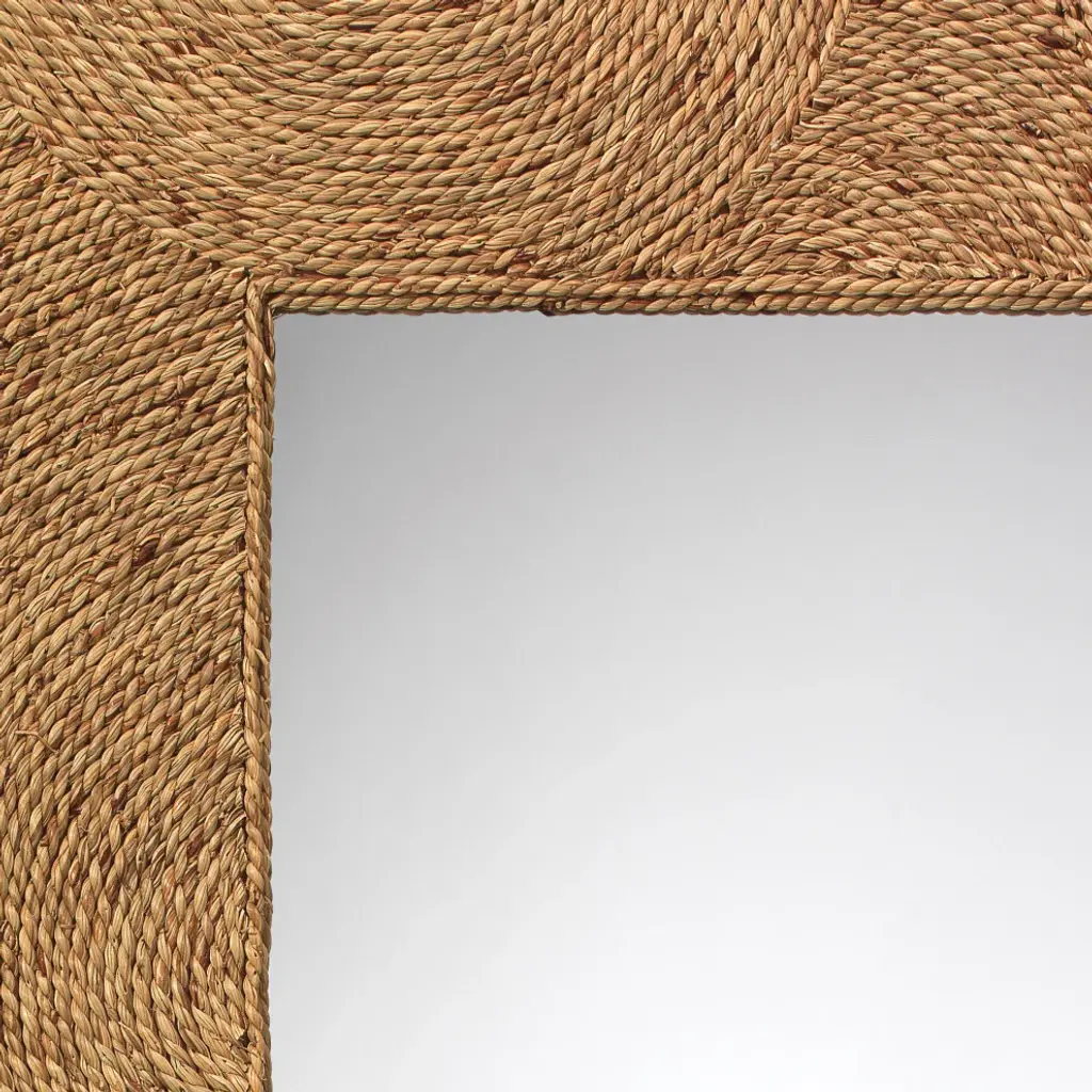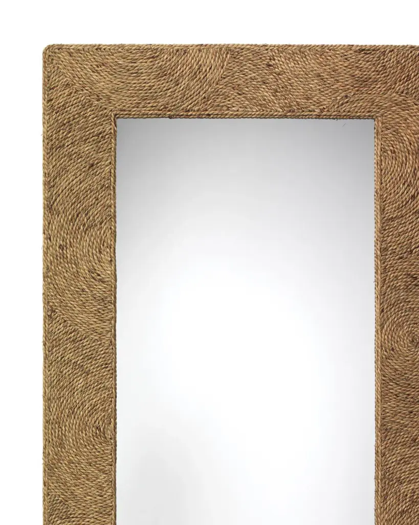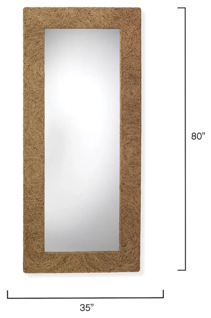 This grand scale, natural twisted seagrass floor mirror is reminiscent of the seaside and perfect for bringing a nautical charm. Its large size makes it perfect as a dressing mirror in the bedroom, or to add light and space to a living area. Coordinating seagrass decor available separately.• 80"H x 35"W. Weighs 77 lbs.• Hand Finished Natural Seagrass• Designed as a leaning mirror only. Tilt kit included for easy installation.• Heirloom Quality - Expertly hand crafted and hand finished. Due to the hand crafted nature of this piece, each piece may have subtle differences.