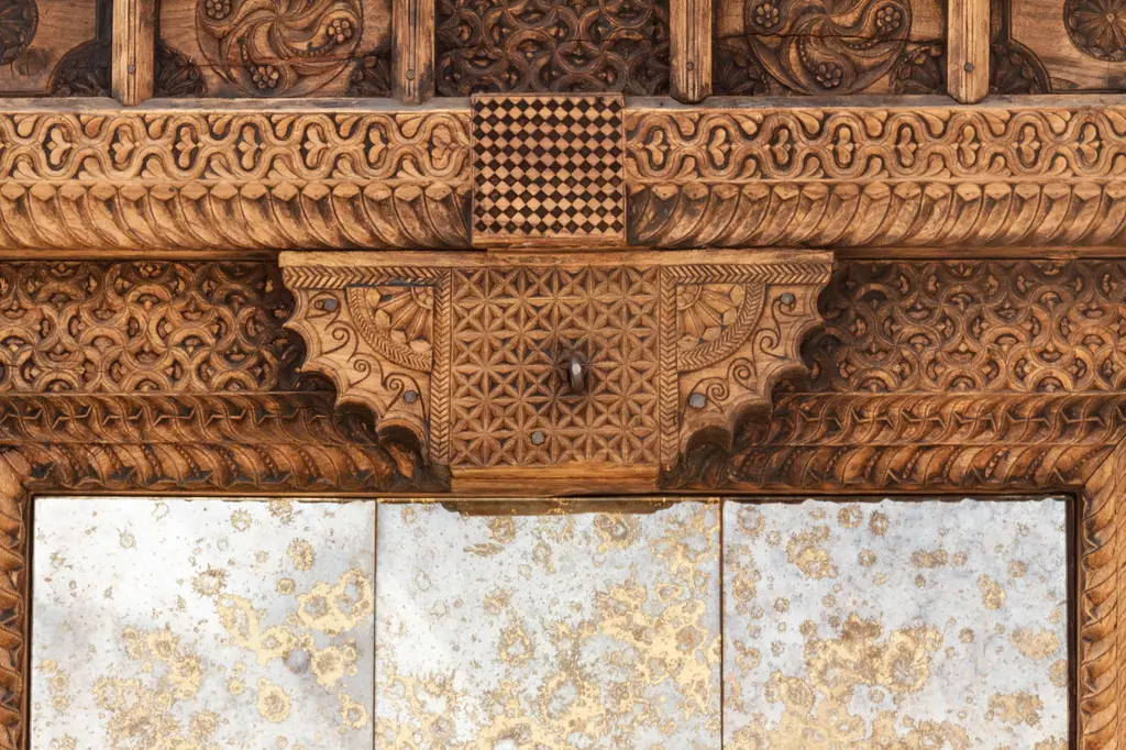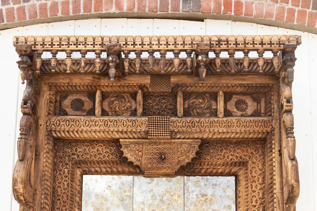 This antique Indian entrance door mirror, once gracing an opulent palaces or majestic fort, epitomizes the grandeur prevalent in Jaisalmer's architectural heritage. Adorned with a fusion of intricate carvings, including floral patterns, geometric shapes, and mythological imagery, it tells the story of India rich architectural history. Crafted from teak wood, this floor carved mirror proudly bears traces of an oxidize patina.
