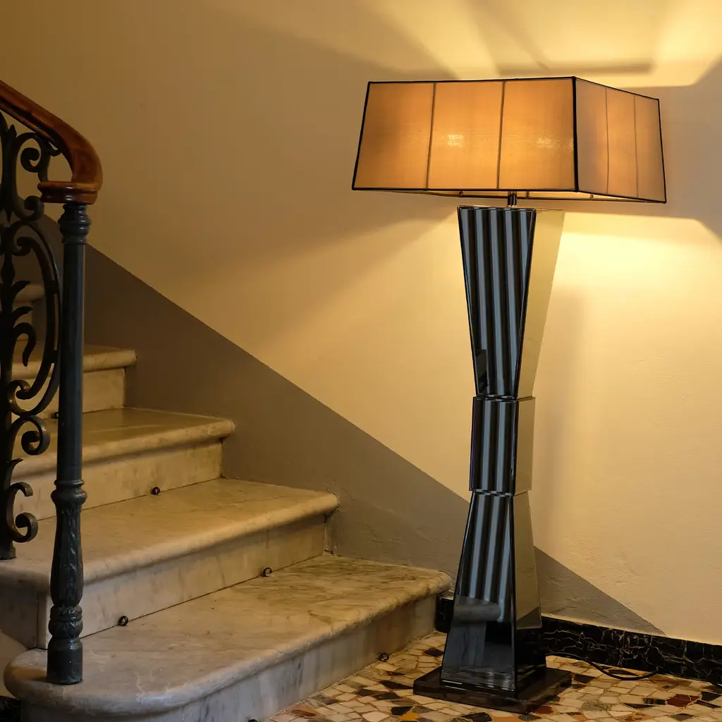 Bold and sculptural, this floor lamp combining wood and metal will be a statement-making piece to complement modern homes. The column flares towards the base and top creating a symmetrical design of striking visual impact, emphasized by the smoked mirrored glass panels entirely enveloped around it. Sitting atop a square plinth base, this totemic design is completed by a wide, sculpted fabric shade with dark edges filtering the light coming from four E27 LED bulbs (60W - 230-240V).