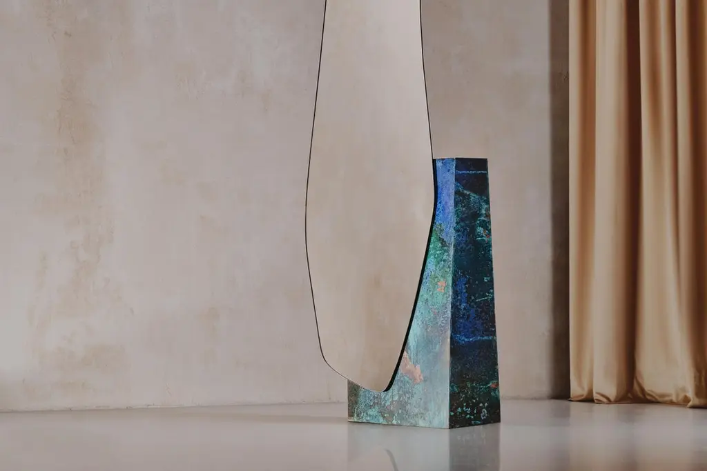 "Lakes" is a nature-inspired collection of sculptural mirrors designed by French designers Maryna Dague and Nathan Baraness.The collection takes its name from the shorelines of lakes and aerial views of their sinuous shapes, represented in the design. The designers have emphasized the contrast between the fluid shapes of the glass and the straight lines of the mirrors' supports, made of slabs of wood, brass, oxidized copper, marble, onyx, and other attractive materials.The collection features five designs, including a floor mirror.Brand: NOOMDesigners: Maryna Dague ; Nathan BaranessType of Mirrors: Optiwhite, black tint mirror, copper tint mirrorMaterials for base: Veneered wood, Madrona wood veneer, Burned steel, Stainless steel / Hand brushed stainless steel, Brushed brass, Brushed copper, Oxidized copper, Black Marble Alanya, Travertino Chiaro Classic, White Marble Statuario, Green Marble Verde Ocean, Onyx.Note: The main picture of the listing displays Lake Mirror 5 with White Marble Statuario base and Optiwhite mirror.Dimensions (cm): H 170 cm, W 51 cm, D 20 cm.