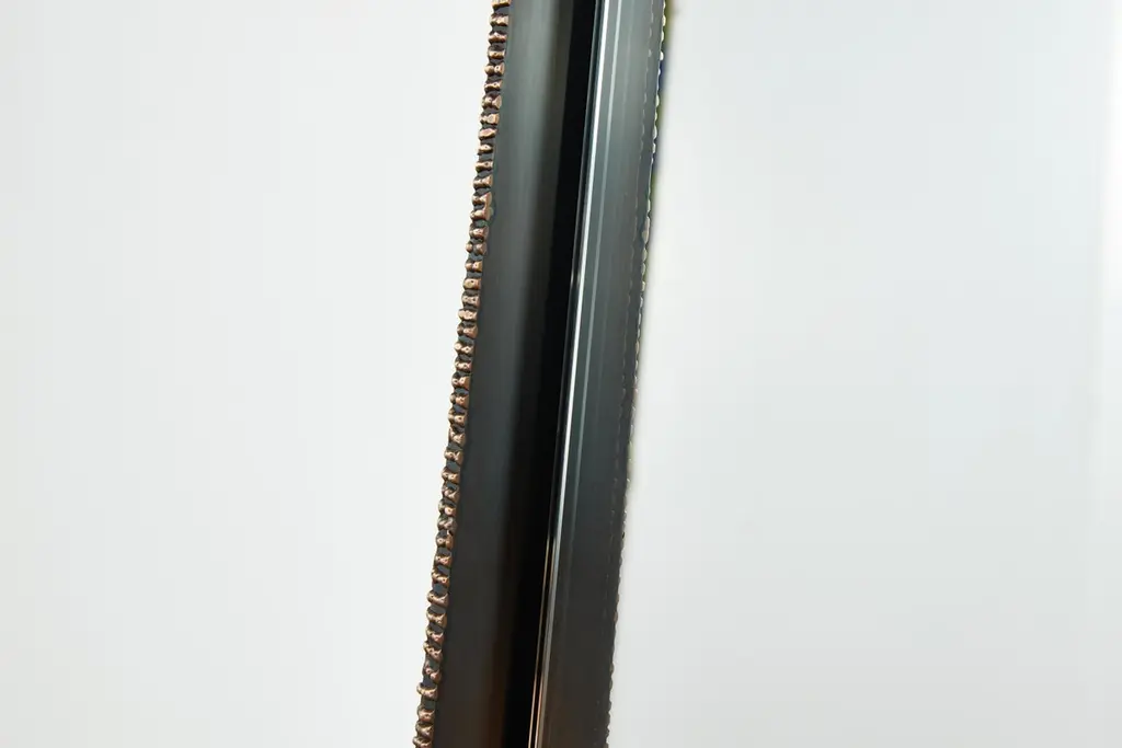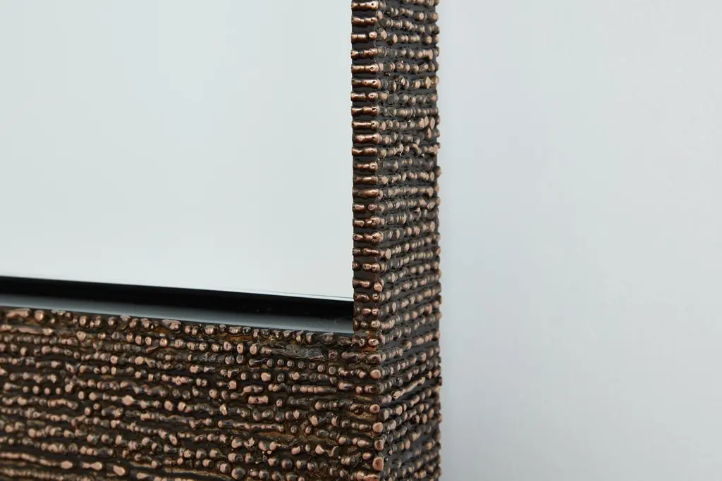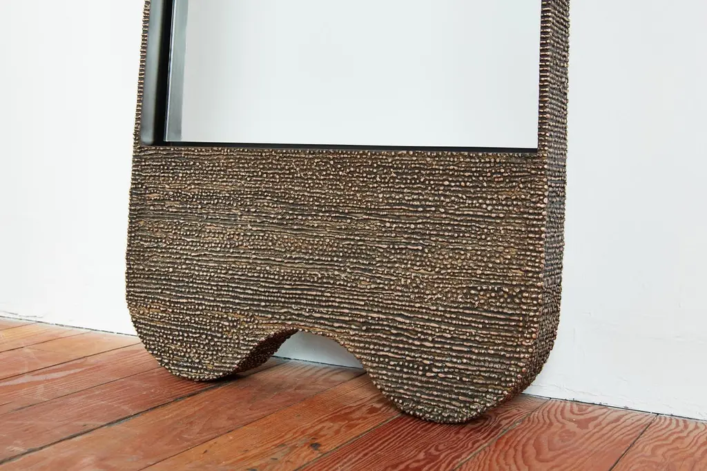 Molten Standing Mirror by William EmmersonDimensions: D 7,6 x W 55,9 x H 203,2 cm.Materials: Bronze and steel. A mesmerizing luxury mirror that melds steel, bronze and a molten finish. William Emmerson's brilliantly designed Standing Molten Mirror handmade in Los Angeles, 2023. Artisanally crafted from robust steel and rich bronze, the mirror features a molten bronze cascading designed frame that appears frozen in time. Each mirror is handmade with undulating contours and lapping edges with thick bronze. The undulated curved base is heavily weighted to support the strength of the leaning mirror that tapers at the top. The frame tapers in size from 3" depth at the bottom to 2" depth at the top / and the width narrows from 22" at the bottom to 18" Wide at the top The marriage of steel, bronze, and molten metal exemplifies the harmonious blend of strength, elegance, and artistic expression. Incredible attention to detail and a true art piece.William Emmerson, founder and principal of William Emmerson Inc. is a world-renowned British designer, sculptor, an innovator. He attributes the birth of this multidisciplinary company, known for its unique juxtaposition of the modern and vintage worlds, to his early childhood in London where he grew up watching his father carve and create wooden sculptures.A versatile early career in Los Angeles, weaving eight years of art direction for film and videos and four years of working with master craftsmen to build furniture, cabinetry, has characterized his exclusive and unique compositions.