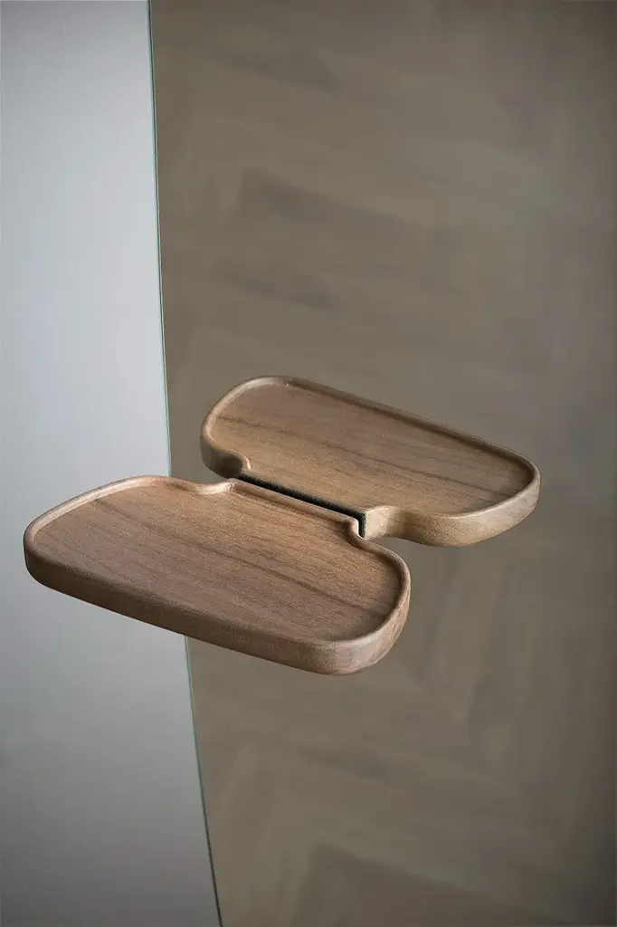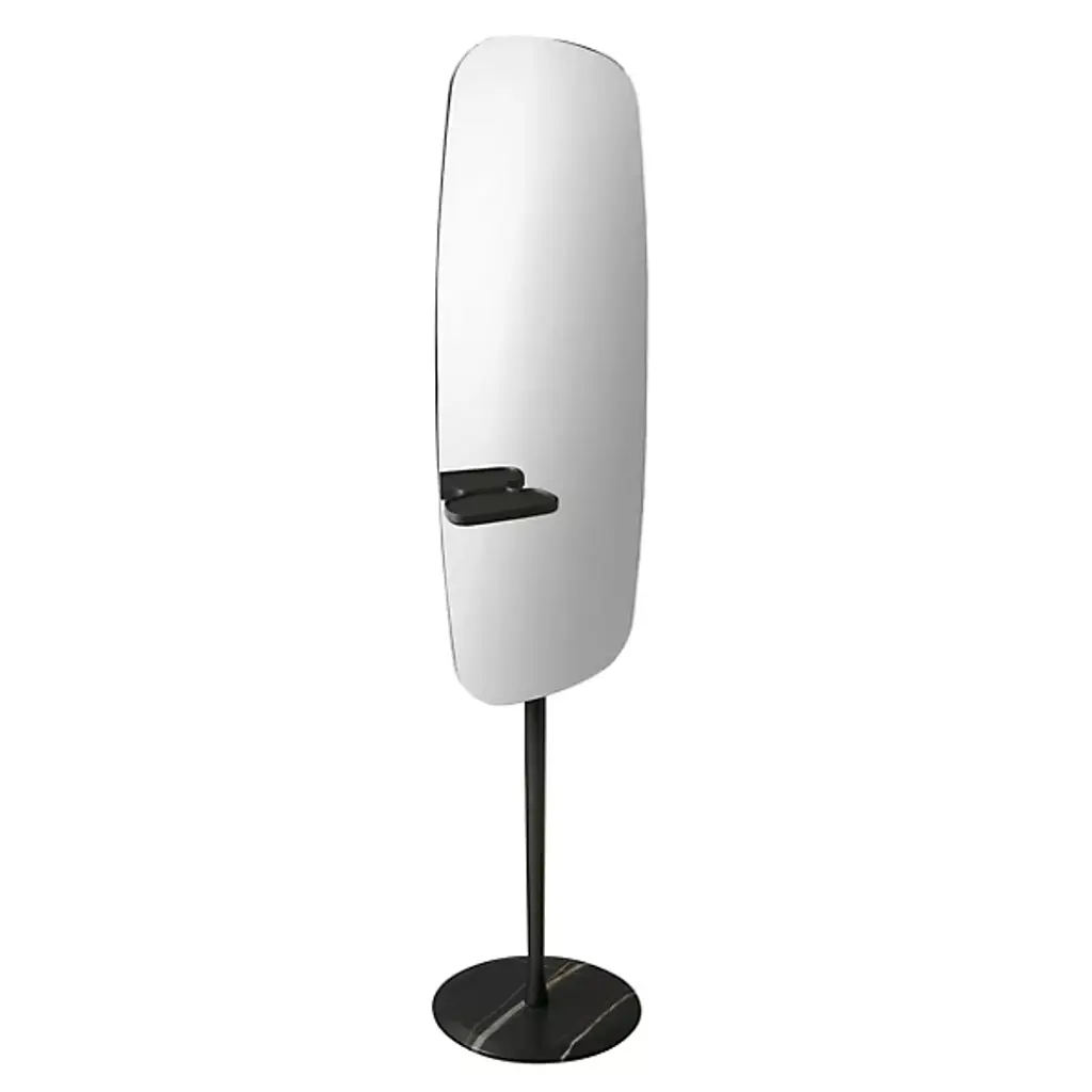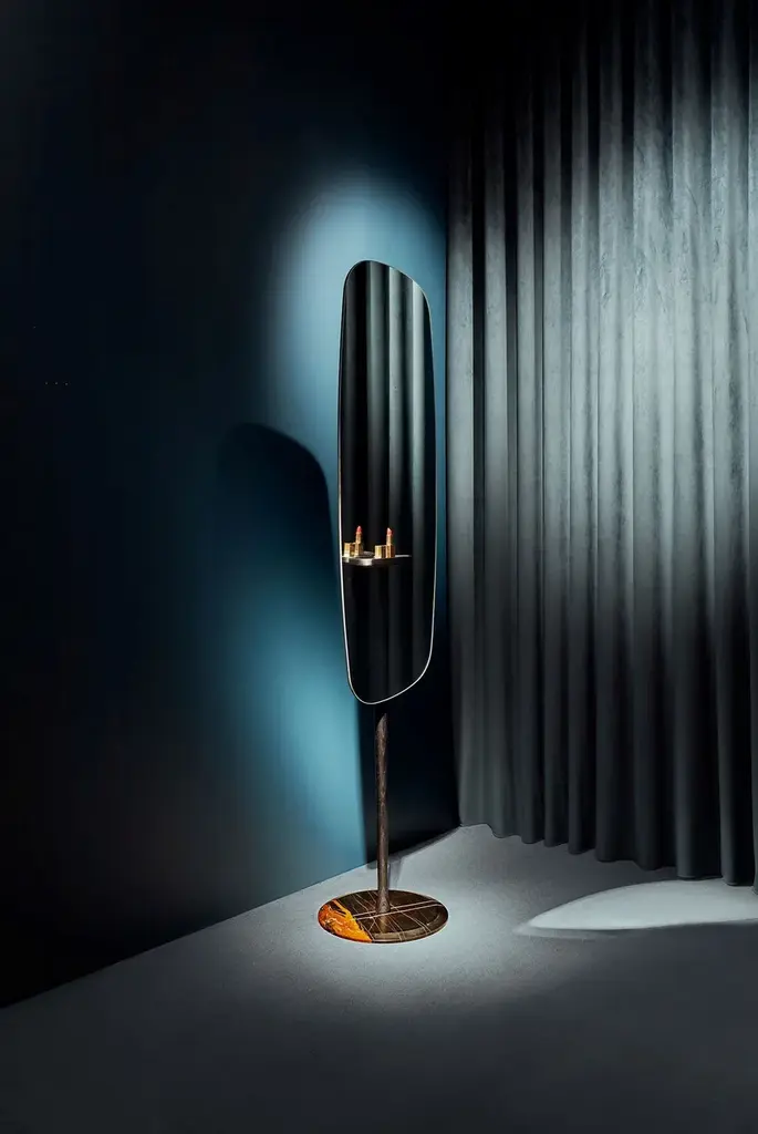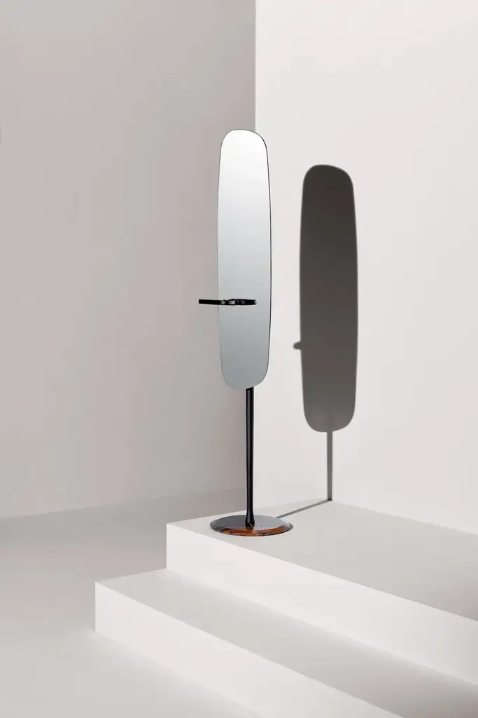 MOMENTS is a floor mirror, allegory to the magic mirrors of the children’s fables of yesteryear. It incorporates a practical wooden tray where to deposit small personal belongings such as a perfume or lipstick. It is offered in two formats, with marble base. There is also a wall mirror version.Materials: - Black stained ash and Sahara Noir marble (ESPFBS);- Walnut and Emperador marble (ESPFNE).