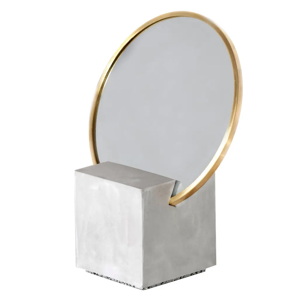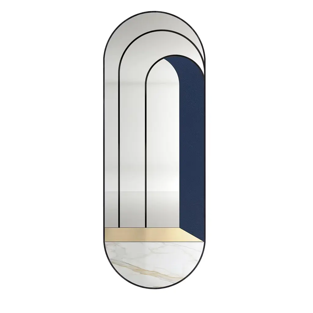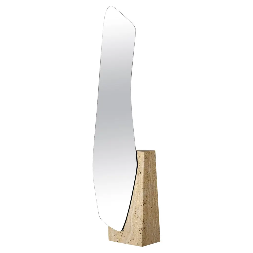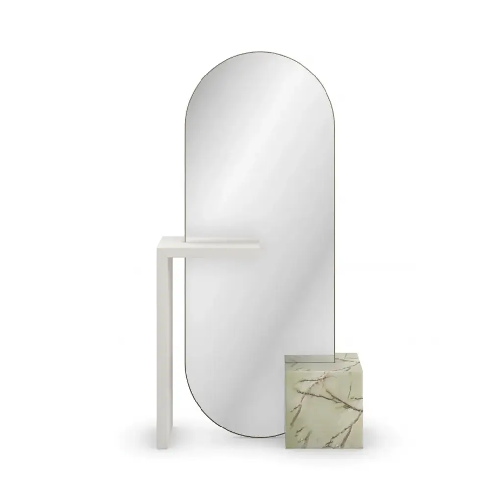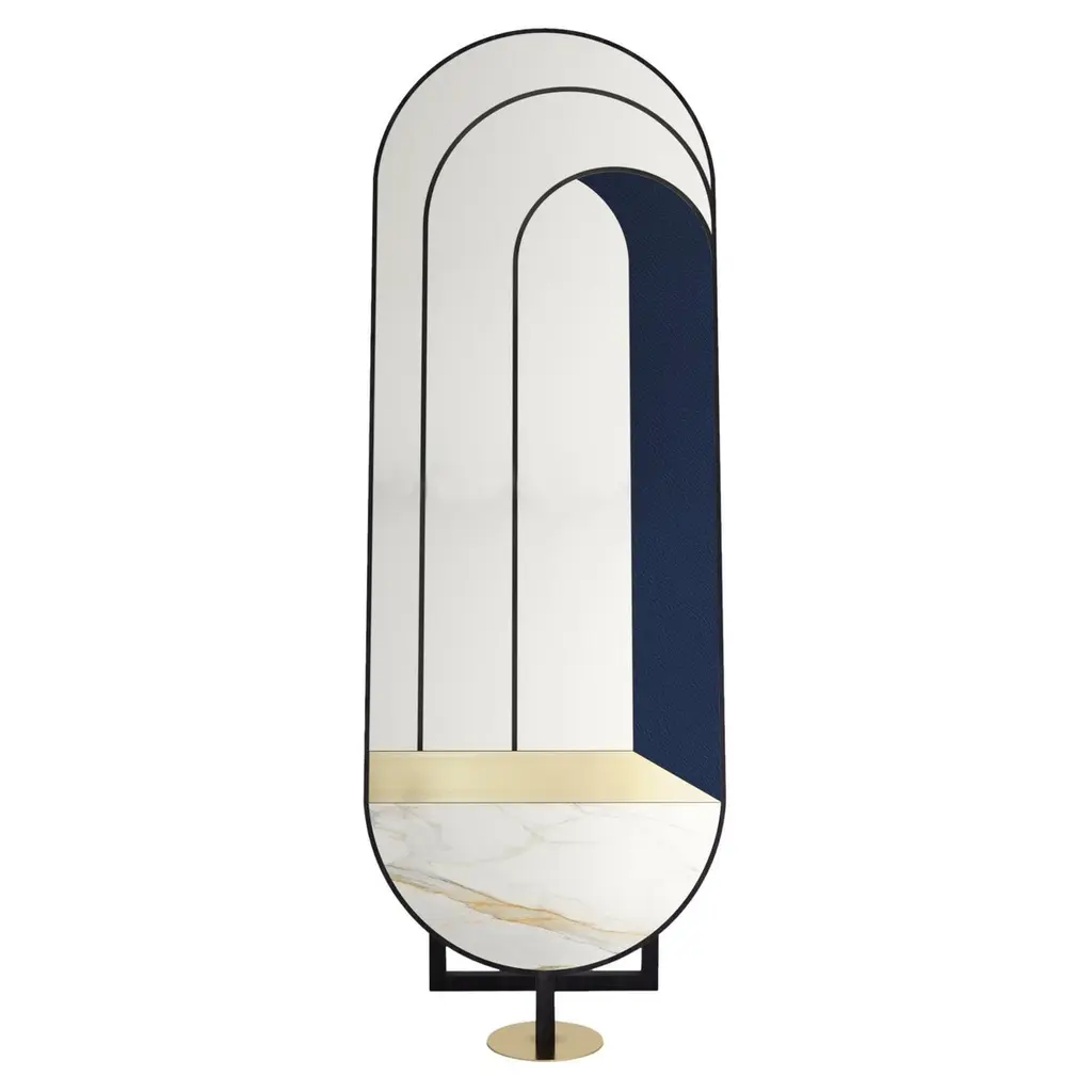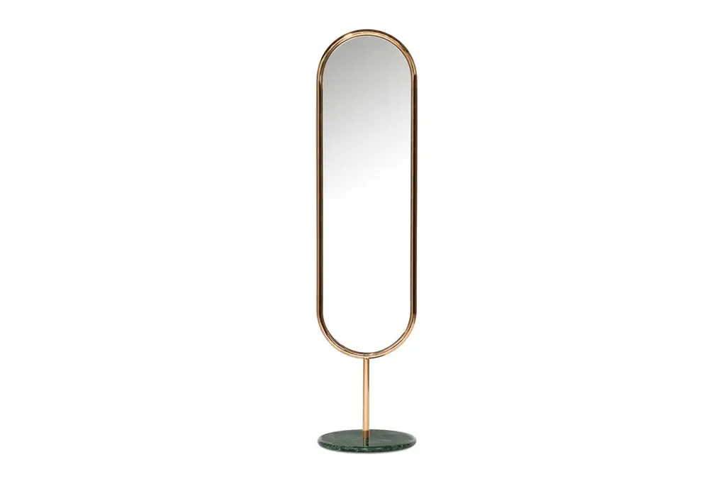 A spirited play on shape and form, this free-standing floor mirror introduces a modern accent with endless functionality. Framed in a warm Lucent Bronze Metallic, its elegant oval-shape is artfully balanced by an angular wood shelf and green onyx marble cube. The shelf and cube are interchangeable, allowing you to play with perspective and change the view.