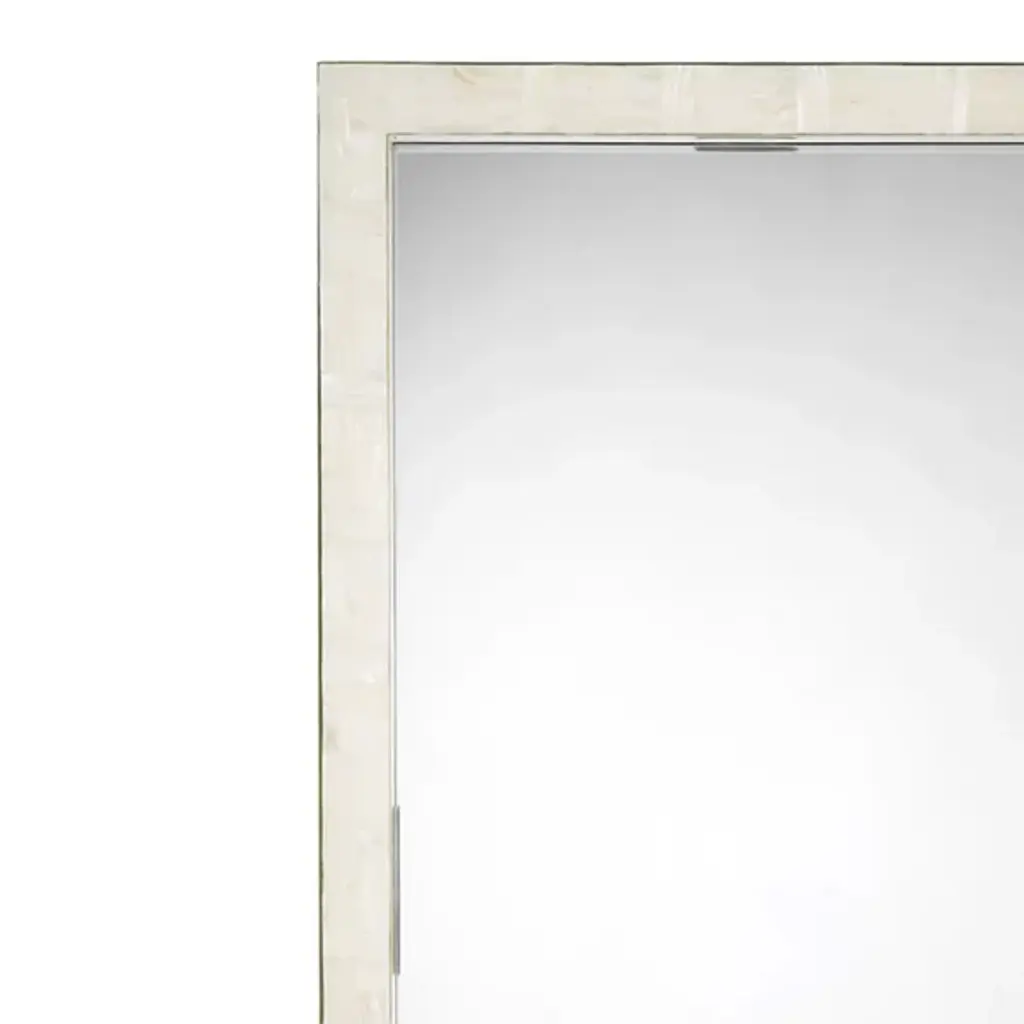 The Monroe Rectangle Floor Mirror from Jamie Young Co. presents meticulous mosaic work in mother of pearl. Each lustrous strip catches light differently, creating an ever-changing display as daylight shifts. The substantial size makes it equally suited for dressing rooms or grand entryways, while the frame's detailed pattern work invites closer inspection. Mount it vertically or horizontally to best suit your space. The non-beveled glass prioritizes clear reflection, letting the frame's natural radiance take center stage.
