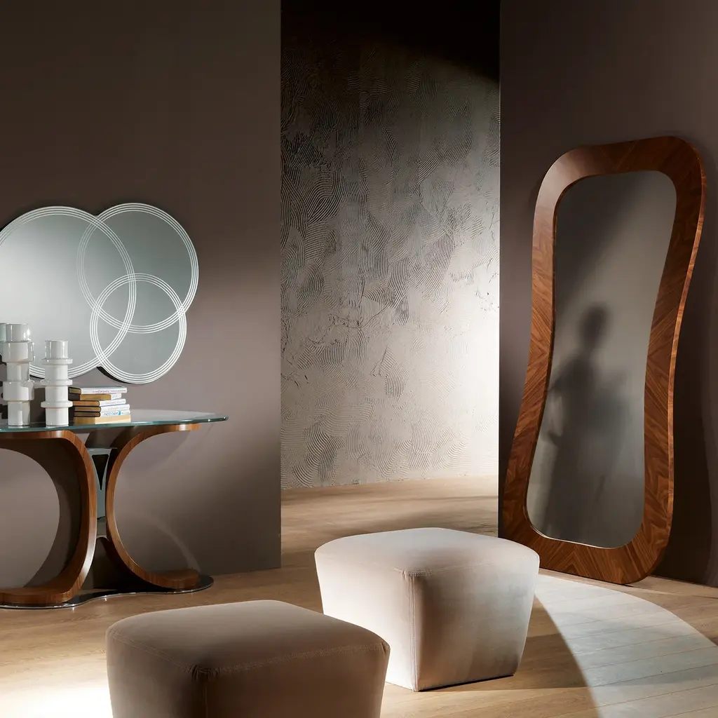 With a soft, undulating form, the Morfeo Floor Mirror is a gentle contemporary style for the bedroom or dressing area. Framed in rich Canaletto walnut, available in both a natural and chocolate-colored finish, the piece offers a warm, organic vibe. The mirror is also available in a three panel version to provide side views.