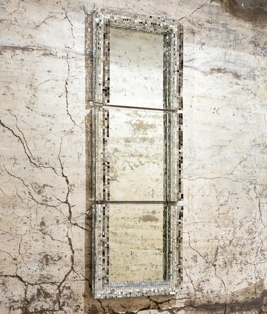 Neverend mirror by Davide MedriMaterials: mirror, glass mosaic (silver)Also available in gold and bronze.Dimensions: D 7 x W 70 x H 210 cmDavide Medri was born in Cesena on August 7th 1967 and graduated at the Academy of Fine Arts in Ravenna, the Gino Severini State Mosaic Institute and the Albevainer Professional Mosaic School.After various artistic experiences, with the meeting with the Dilmos gallery in 1997, the first furnishing accessories in mirror mosaics were created. Today's portfolio includes, in addition to glass mosaic mirrors: tables, floor lamps, wall lamps and works of art.The manufacture is completely handmade inside the laboratory in Cesena. Every single piece of glass is cut and fixed by hand guaranteeing high quality, each artistic element is unique in its design and can be tailor-made in any size.Davide Medri's works of art have been successful in terms of market, press appreciation and recognition by architects and interior designers in Italy and abroad.