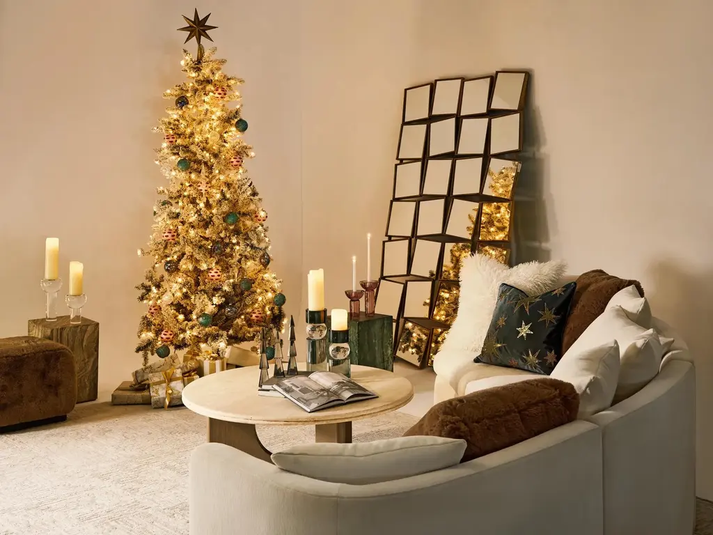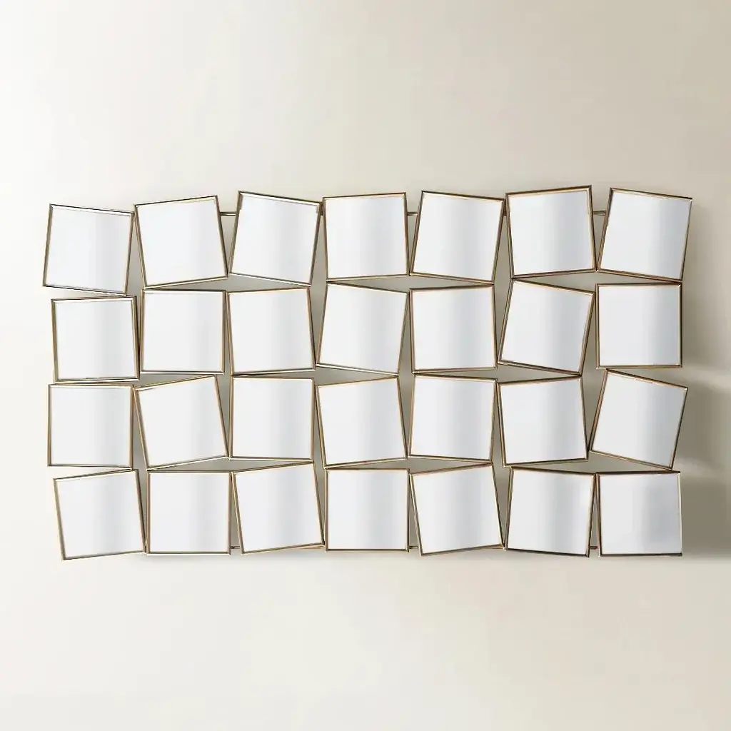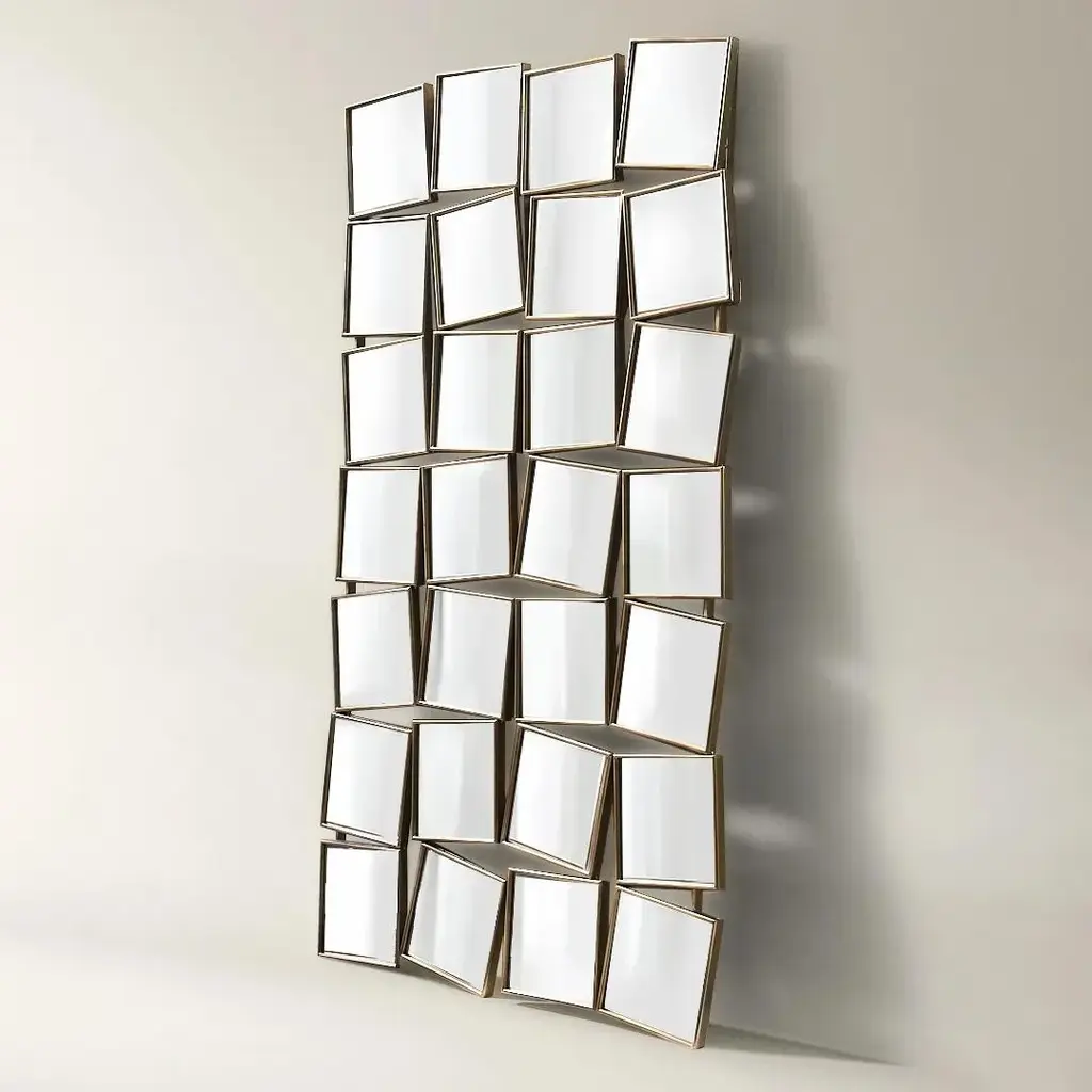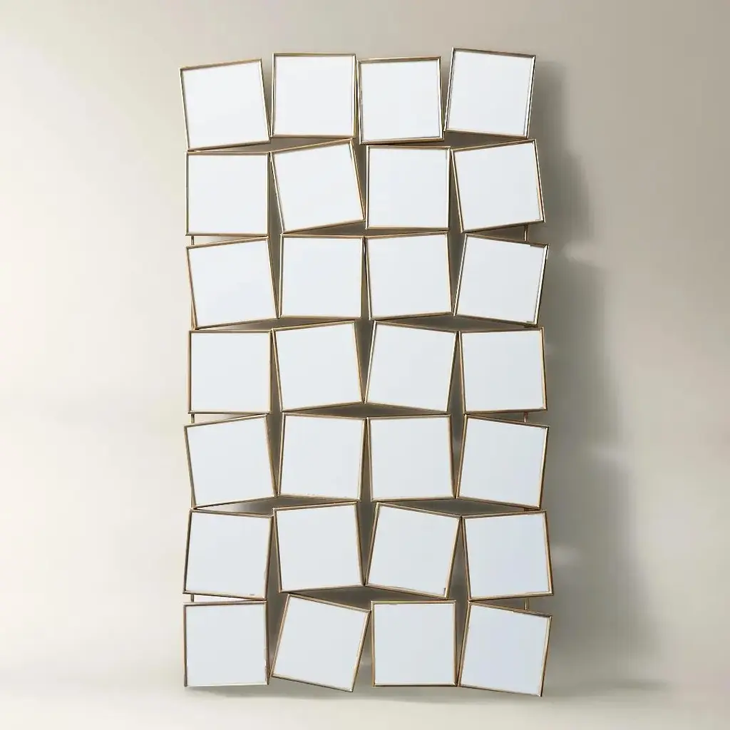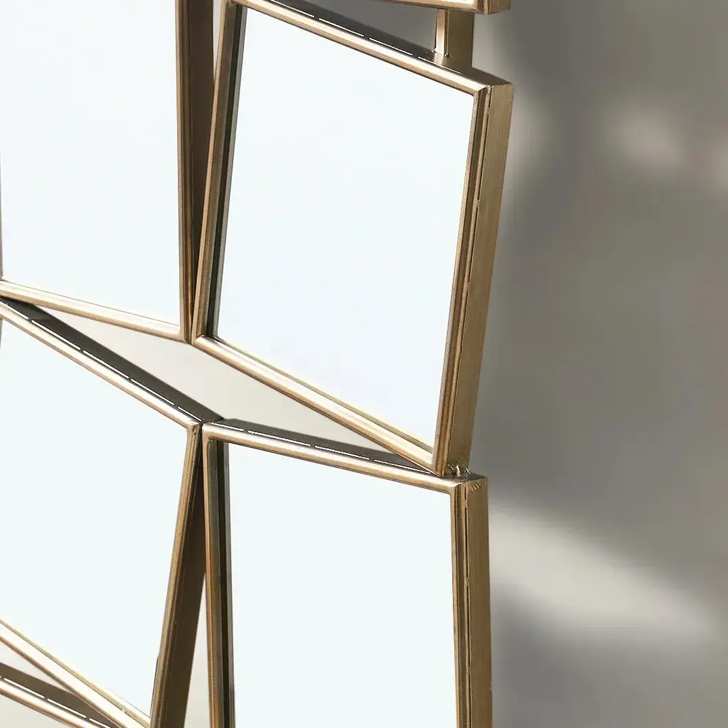 Designed to captivate from every angle, the Newberry Floor Mirror blends sculptural geometry with luminous reflection. Each individual panel is set within a hand-crafted iron frame finished in radiant gold, creating a multidimensional surface that adds movement and light to any room. Whether hung vertically, horizontally, or simply leaned against the wall, this statement mirror doubles as art and function.
