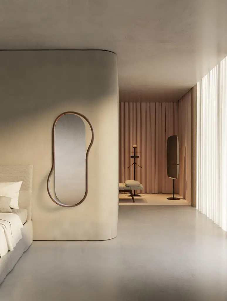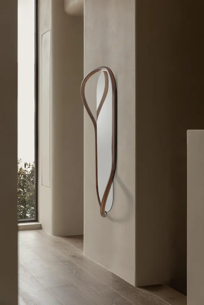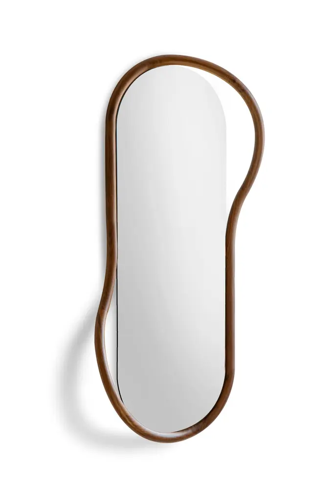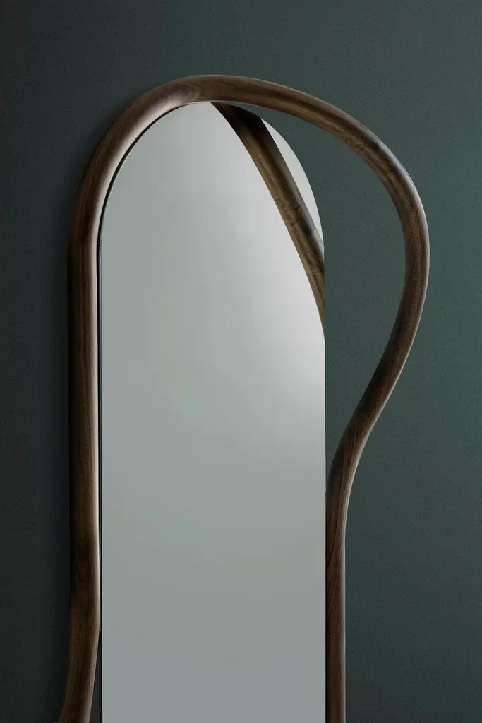 The singularity of this mirror is based on its caring proportions.Two options with floor-standing mirror or wall-mirror; a hand-made natural walnut shelf combines the softness lines of the mirror.Available in WalnutBlack Stained Ash