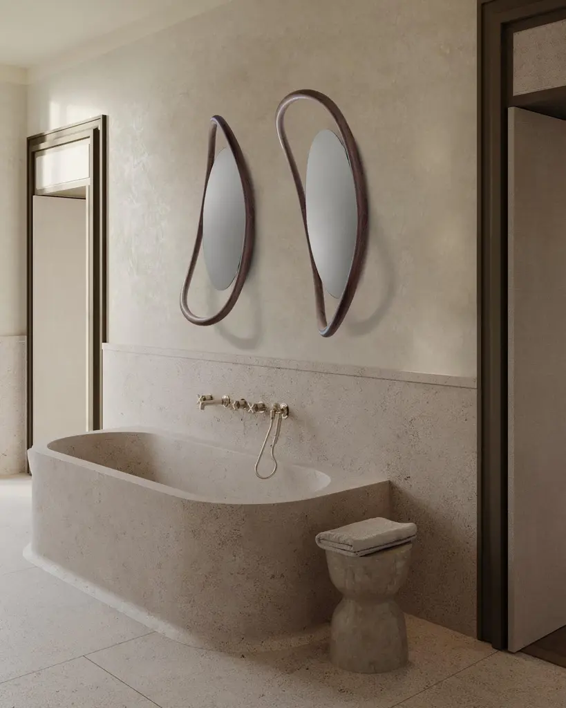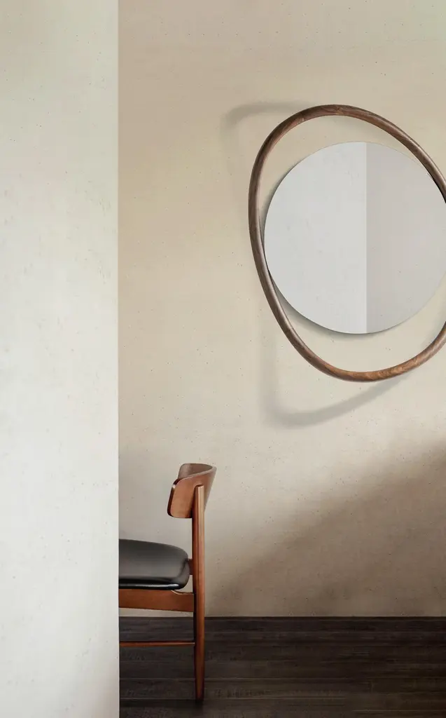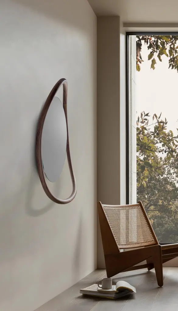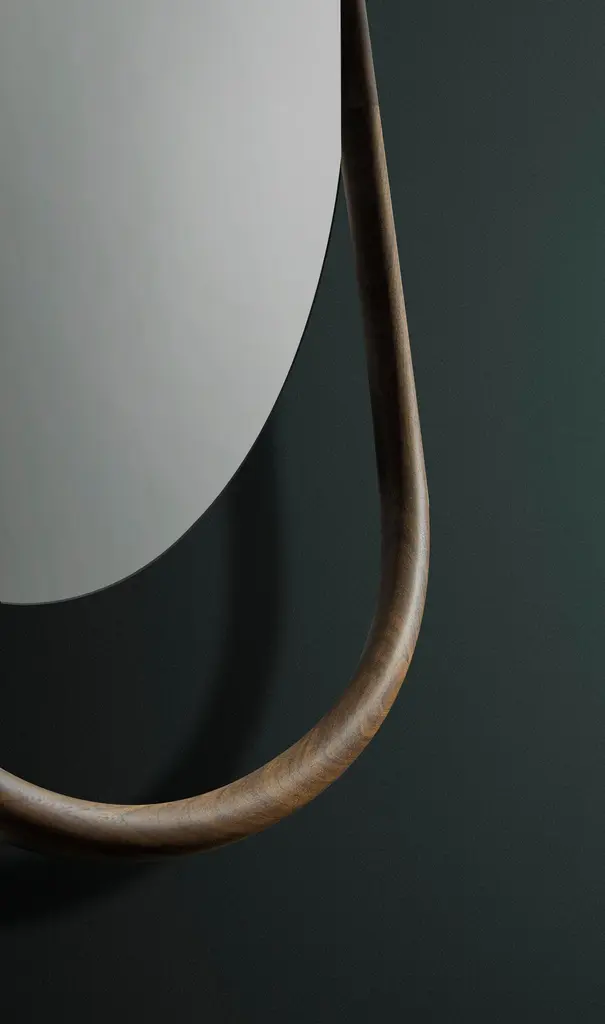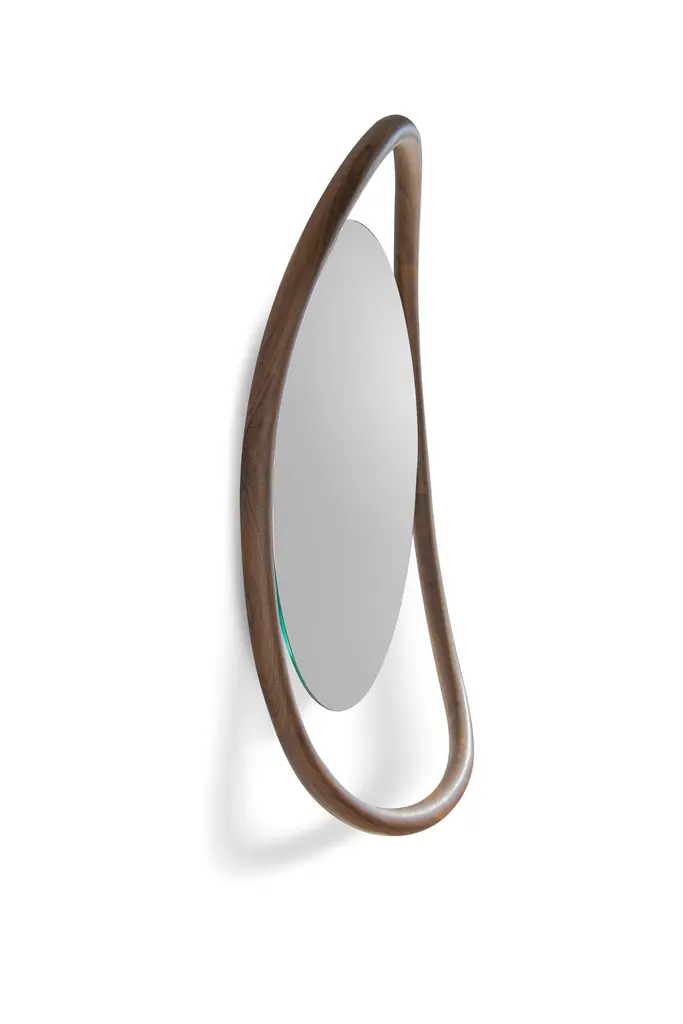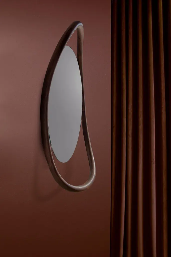 The singularity of this mirror is based on its caring proportions.Two options with floor-standing mirror or wall-mirror; a hand-made natural walnut shelf combines the softness lines of the mirror.Available in WalnutBlack Stained Ash