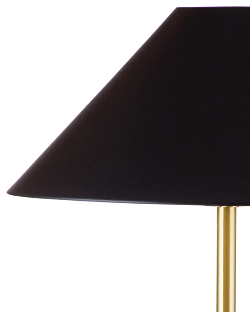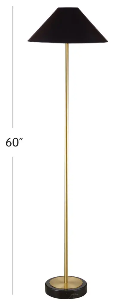 The Norfolk Floor Lamp exudes contemporary glam style, featuring a striking black marble base complemented by a sleek gold brass body. Its cone-shaped lamp shade, crafted from black metal, adds a sophisticated touch to any room. With its modern and timeless design, this lamp effortlessly combines elegance with functionality.Features:Modern design with timeless appealThe cone shaped lamp shade is constructed with black metalFeatures an on/off cord switchLamp cord measures 78 inches, allowing for easy placementBulb type a required, not includedEasy assembly - just attach harp, finial and shadeFor over a century, Bassett Mirror has been synonymous with style and quality, transforming homes with its sophisticated and timeless designs. With a wide-ranging collection of furniture, lighting, mirrors, and art, Bassett Mirror seamlessly blends modern style with classic appeal. From rustic modern to luxe glam, each piece is thoughtfully crafted to inspire and elevate any space. Committed to exceptional value and customer care, Bassett Mirror makes it easy for homeowners to create beautiful, personalized interiors with confidence.