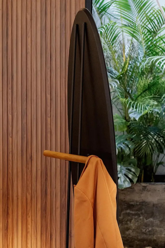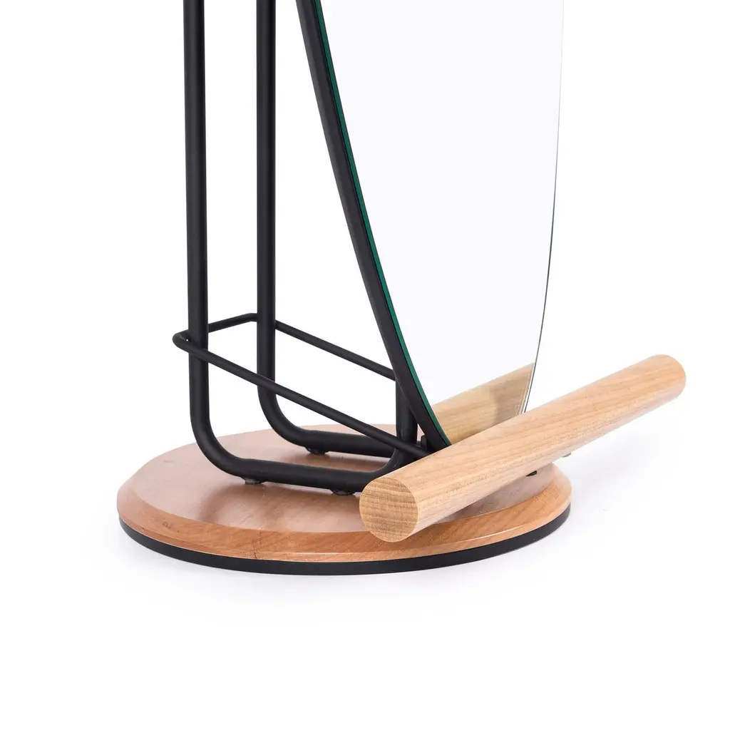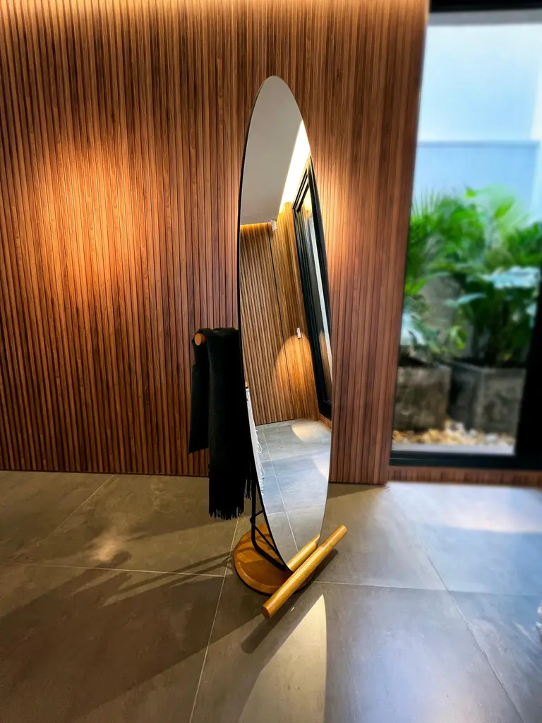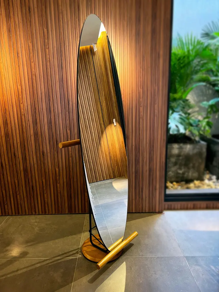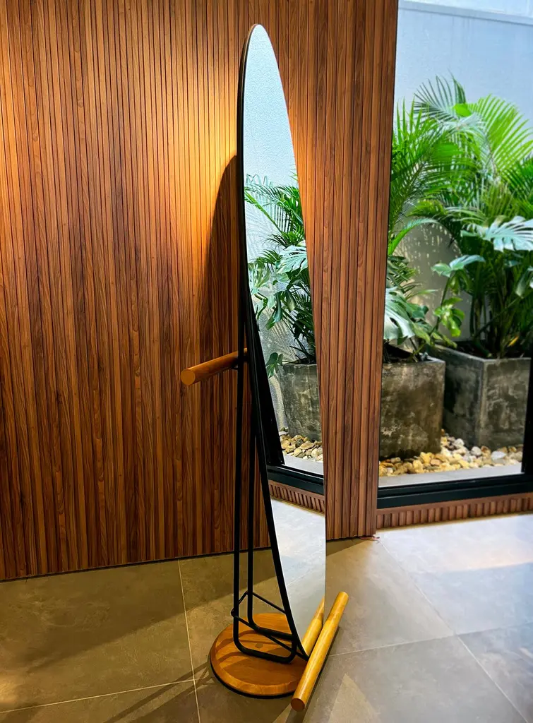 The "Olav" floor mirror has modern and organic features.Its shape suggests the visualization of the person in full body.In addition to being a decorative piece, it is a multifunctional piece.On the back there is a rack coat that can hold clothes, coats, bags and other objects.The metal part is made of carbon steel with matte black paint (the finish can be customized. Request information).The back is finished in black leather. Therefore, it can be used in the center of environments.The details of the base on the floor and round rods are made of natural tauari wood. (Brazilian reforested wood.)It can be used in closets, bedrooms, entrance hall, living room and even in corporate environments or hotels.