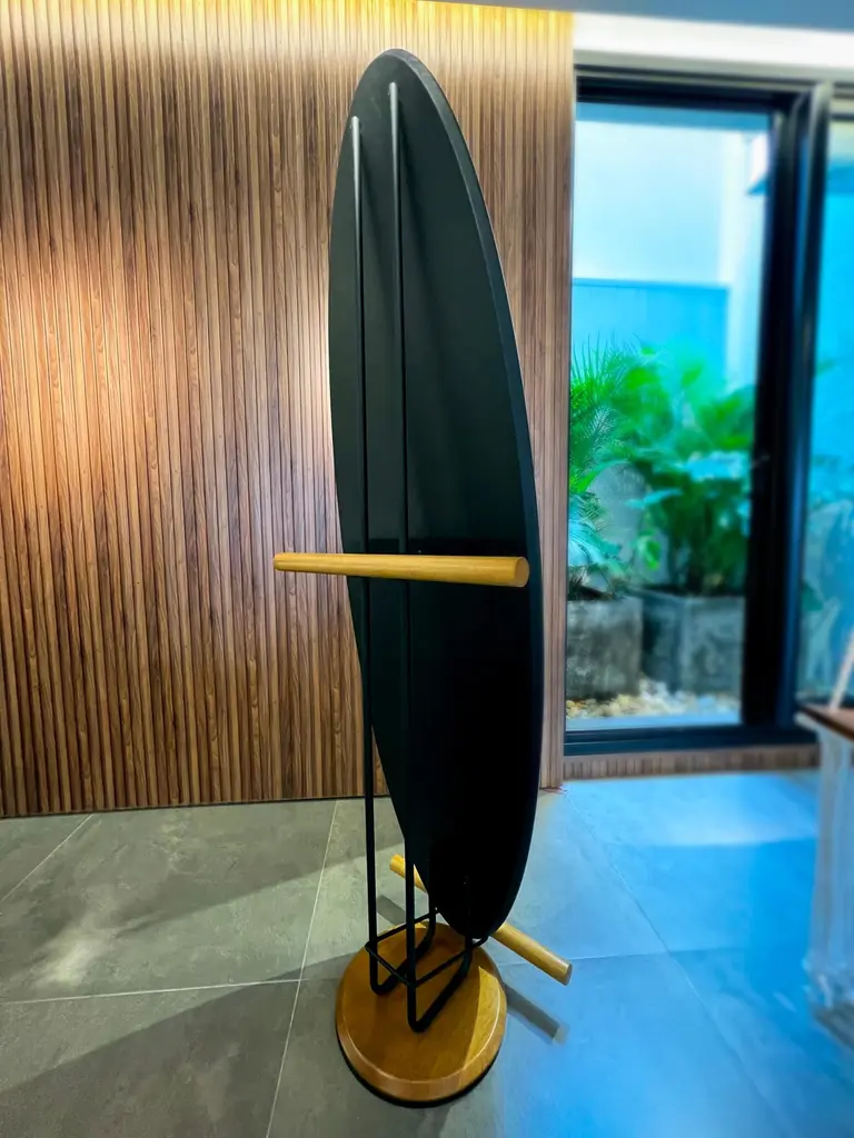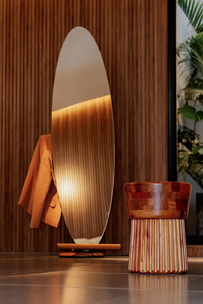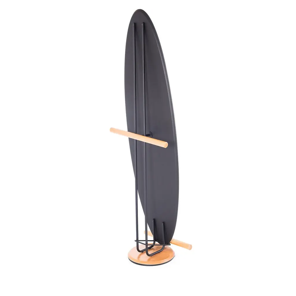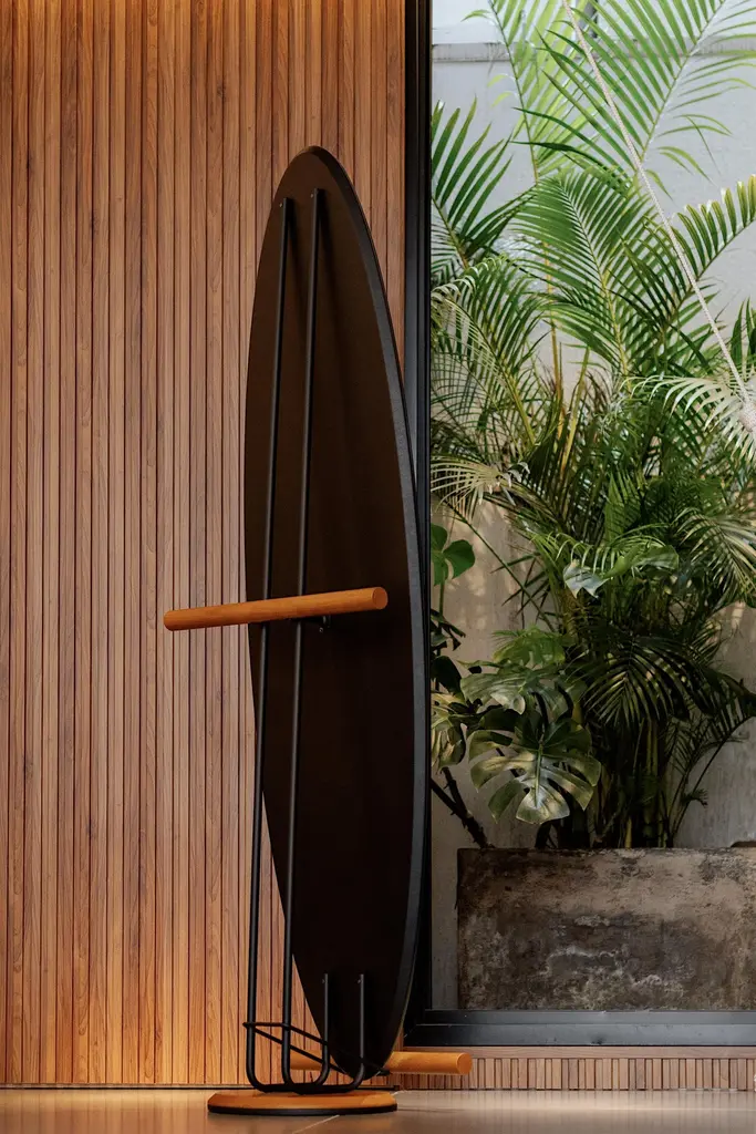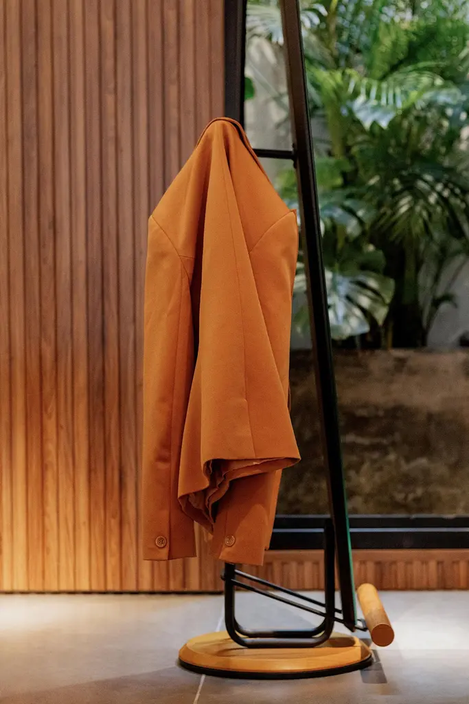 The "Olav" floor mirror has modern and organic features.Its shape suggests the visualization of the person in full body.In addition to being a decorative piece, it is a multifunctional piece.On the back there is a rack coat that can hold clothes, coats, bags and other objects.The metal part is made of carbon steel with matte black paint (the finish can be customized. Request information).The back is finished in black leather. Therefore, it can be used in the center of environments.The details of the base on the floor and round rods are made of natural tauari wood. (Brazilian reforested wood.)It can be used in closets, bedrooms, entrance hall, living room and even in corporate environments or hotels.