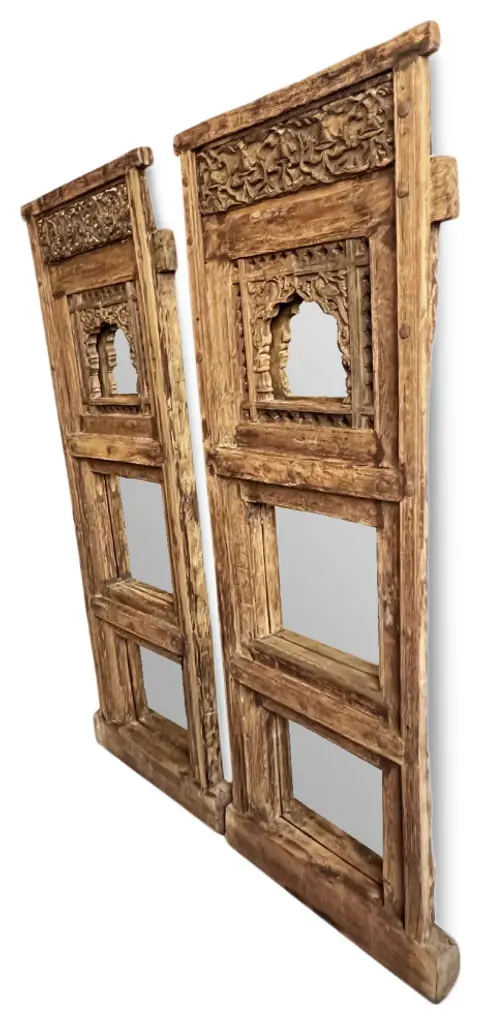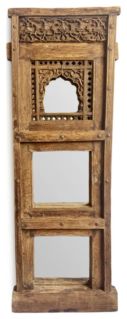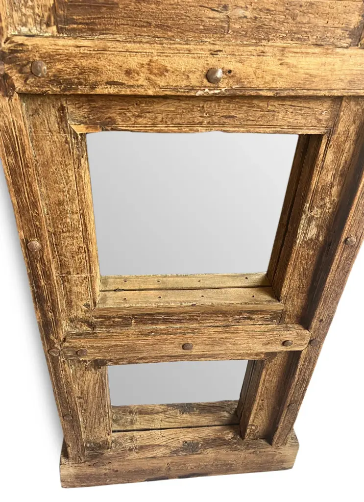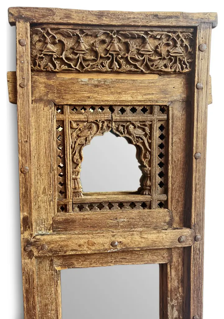 Old carved wood window frame from India repurposed into a stunning full length floor or wall mirror. Intricate hand carved designs and iron rivet detail. Lots of character with signs of age on thick vintage wood frame. Each is slightly unique and sold individually.