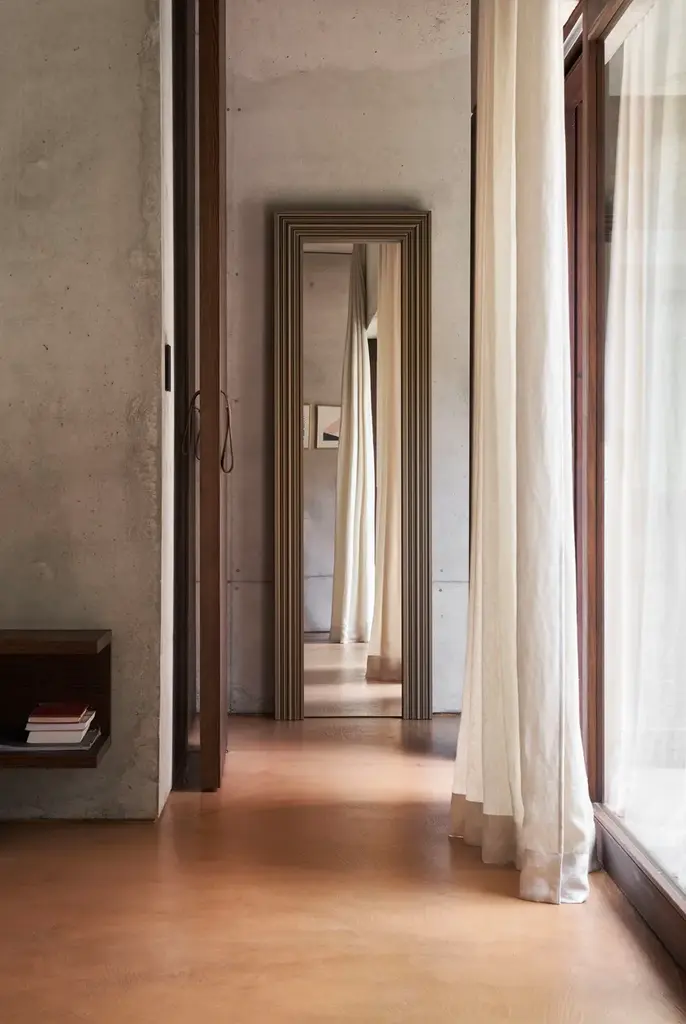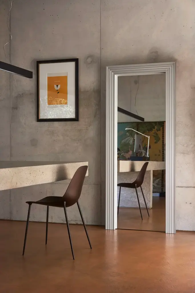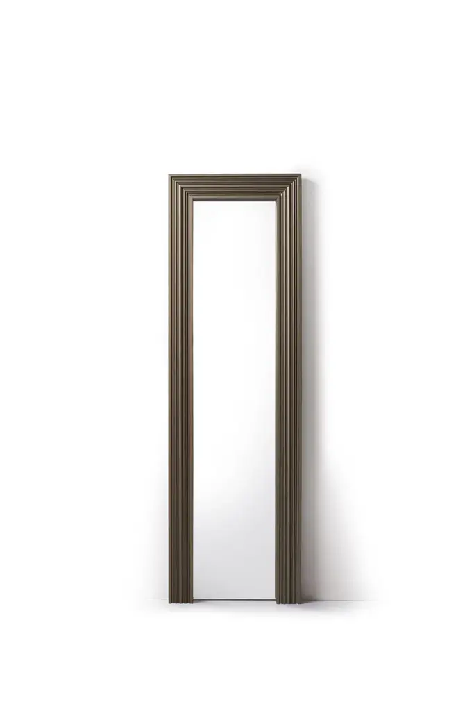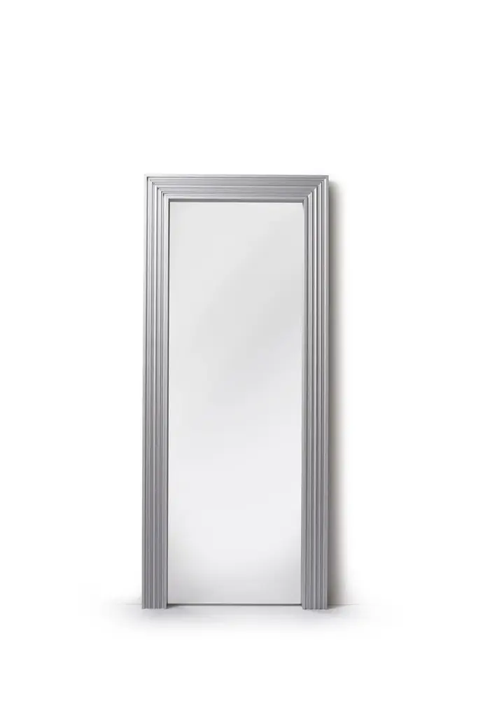 Oodh is a floor mirror with frame in anodized extruded aluminum on three sides. The mirror is fixed onto a panel that ensures safety and stability. Available in three sizes.An object of pure functionality that becomes the bearer of profound meanings. Oodh is a mirror conceived as a portal, inviting you to go beyond what appears reflected, in search of meaning and authenticity.Oodh is inspired by the journey that designer Lapo Ciatti undertook in Cambodia to discover its fascinating culture and sophisticated Khmer architecture. Standing in front of the famous temple complex of Angkor Wat – compared for its harmonious shapes to the most remarkable constructions of ancient Greece and Rome – he was so impressed by the large stone portals whose succession gives life to infinite corridors that he decided to replicate them into a design object.Oodh was designed to reproduce precisely these massive doorways. It is in fact a large floor mirror without a lower frame, with the shape of a portal rather than that of a traditional mirror; the rest of the frame hints at the bas-reliefs surrounding the great doors of the temple: a succession of concave and convex shapes, where each groove has a precise symbolic reference inspired by ancient divinities.Oodh is a design object that stays true to the concept behind Opinion Ciatti’s products, that of ‘spices and sauces’ for different spaces, of furnishing accessories with a pronounced identity capable of giving a unique touch to any room with their discrete yet intense beauty. Not a spice, in this case, but a fragrance: Oodh, synonymous with Agarwood, is a resin that forms on the Aquilaria trees typical of Southeast Asia and, for its highly recognizable aroma, it is used to produce exquisite incense and fragrances.Made of extruded anodized aluminium, it is available in three sizes and two different finishes (silver and brass). The mirror is secured to the wall through a simple hooking system, while a back panel guarantees stability, safety and impact resistance.Finishes: satin-finished burnished brass, satin-finished silver.Note: it requires floor support and wall fixing.