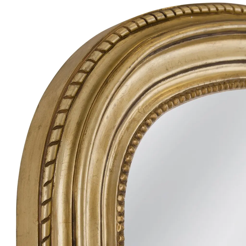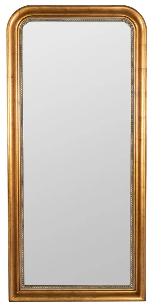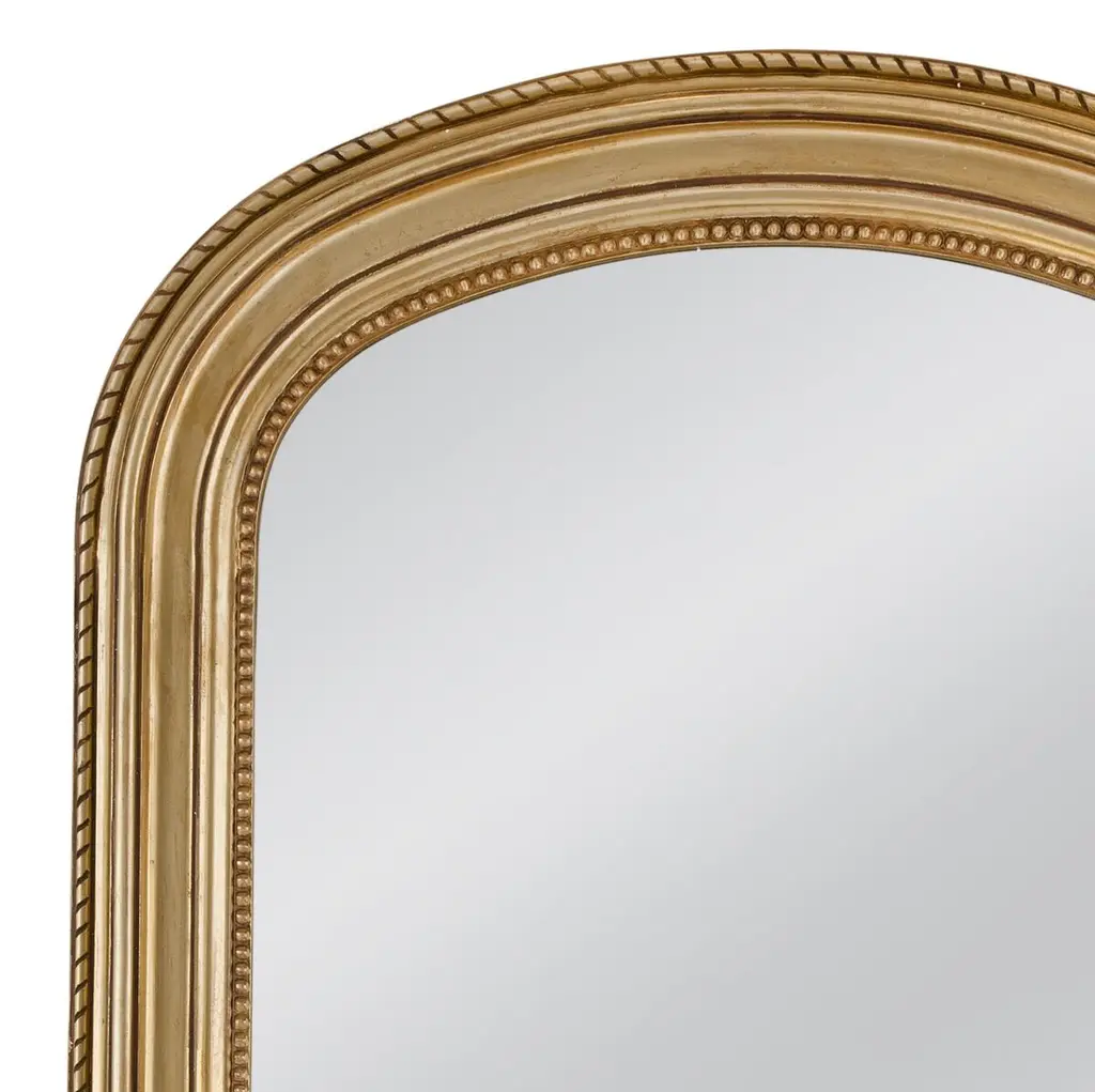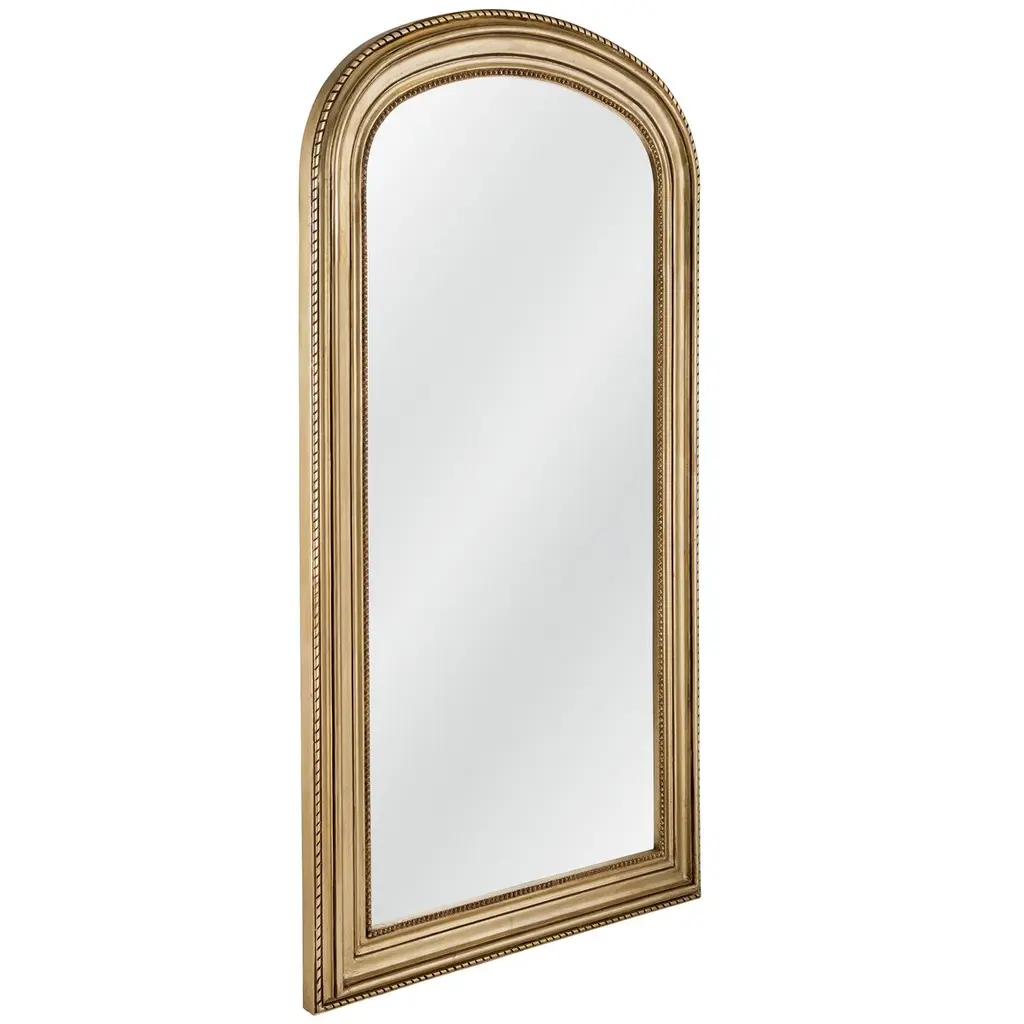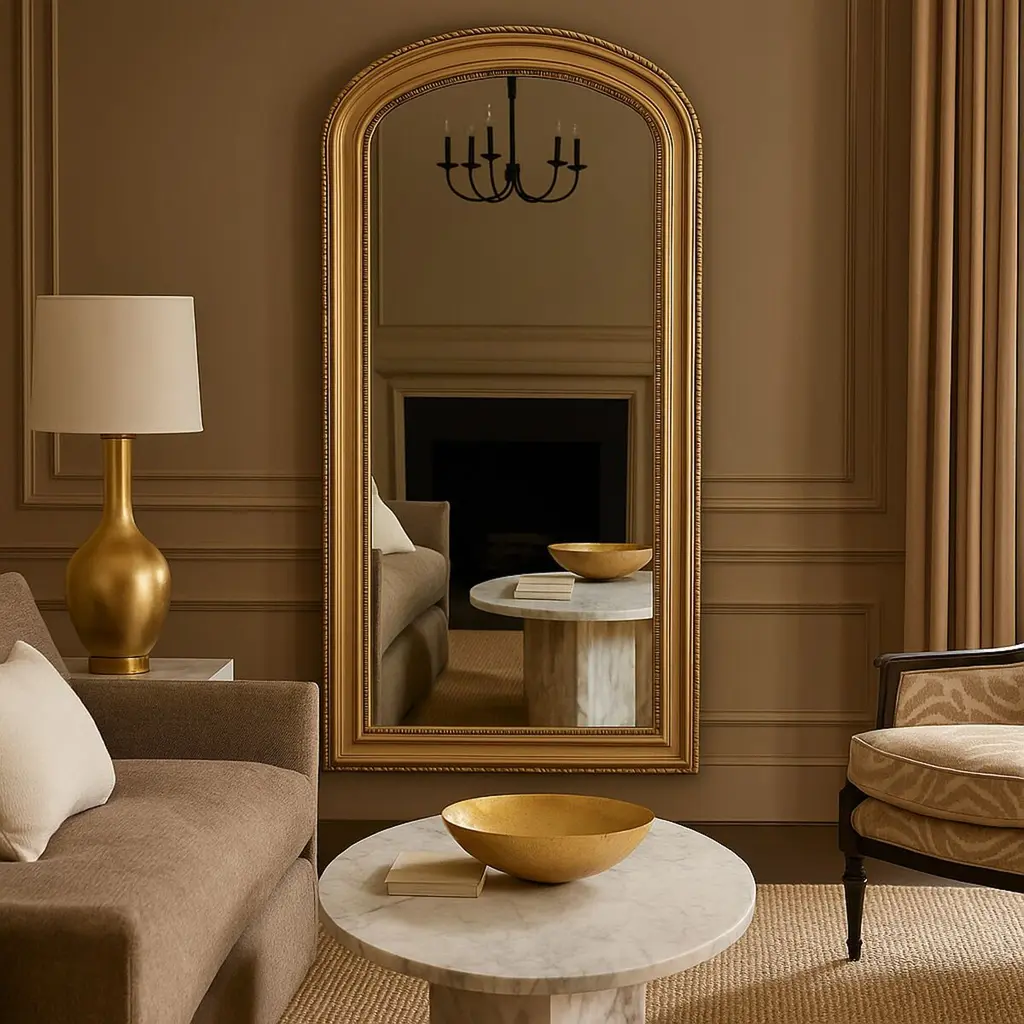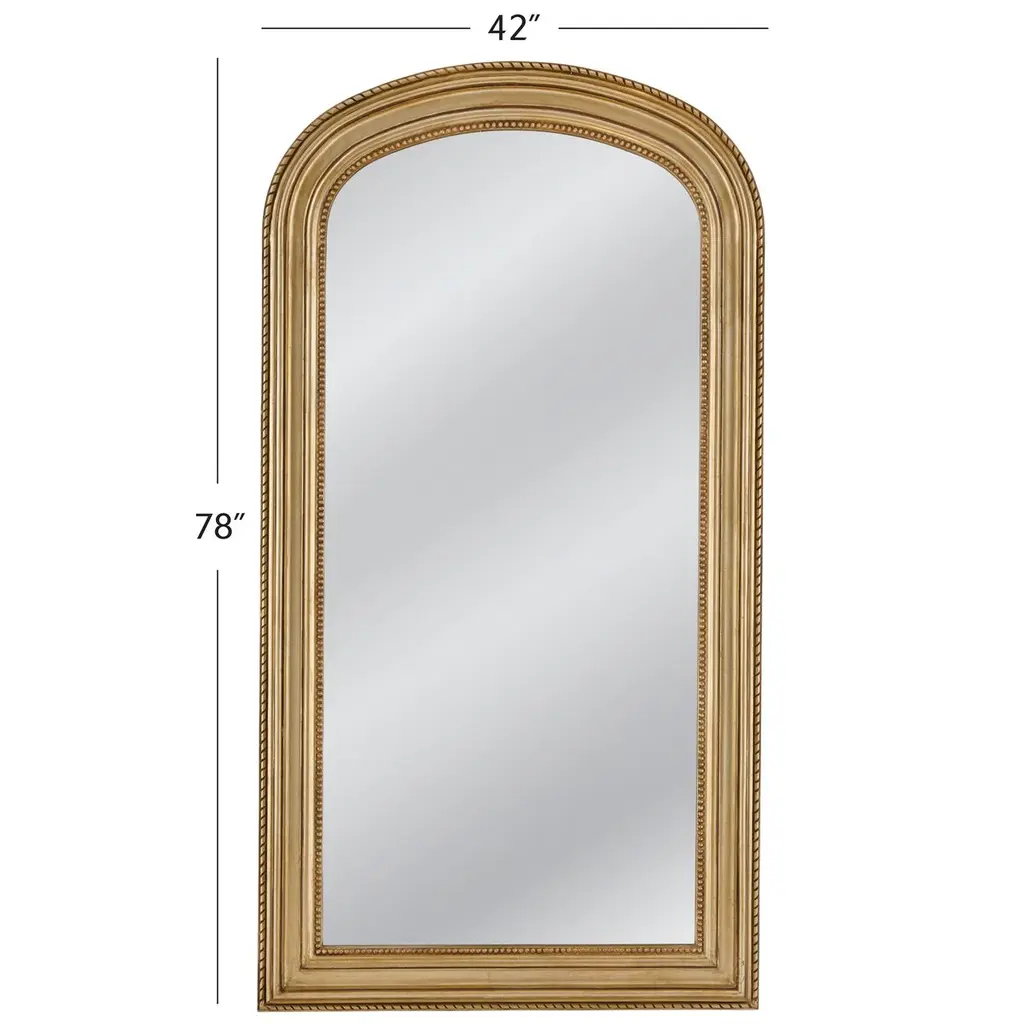The Orion Floor Mirror features a sophisticated design with a thick layered molding and an arched top, exuding opulence. Its luxurious finish enhances its glamorous and sophisticated appearance, elevating any space it adorns. Combining elegance with modern aesthetics, this mirror becomes a captivating and stylish focal point in any interior setting.