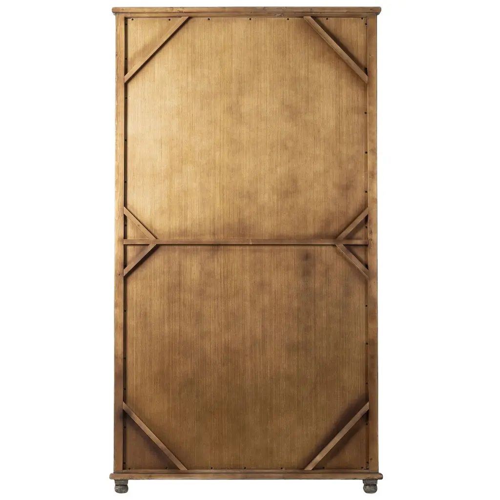 Pine frames this large-scale floor mirror, softening the look with slightly curved interior corners. A simplistic moulding overhang detail along the top and bottom offers visual structure, finished with petite bun foot details.