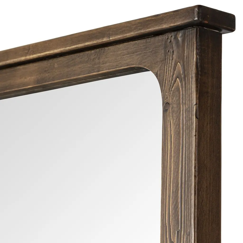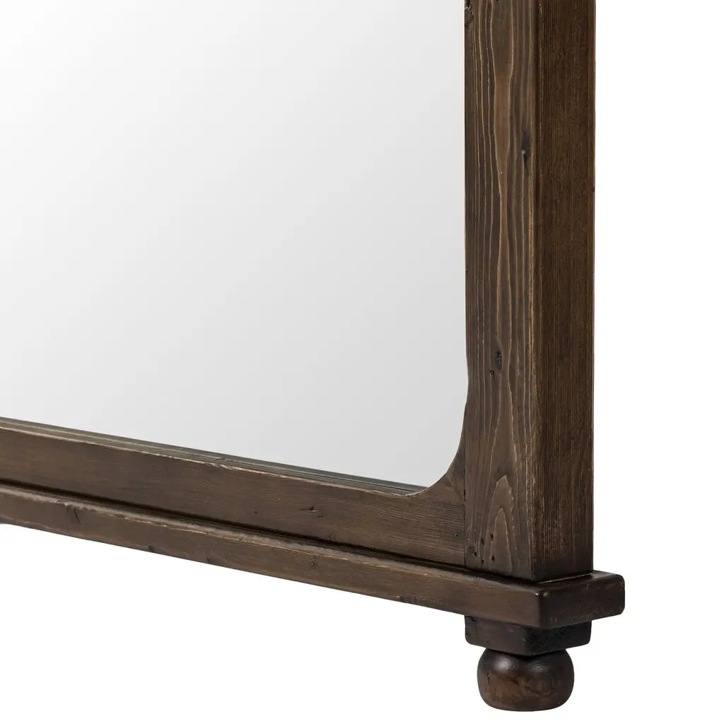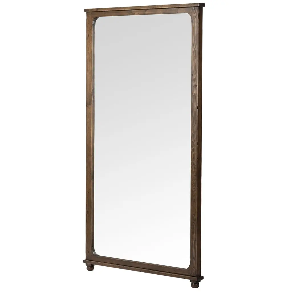 Pine frames this large-scale floor mirror, softening the look with slightly curved interior corners. A simplistic moulding overhang detail along the top and bottom offers visual structure, finished with petite bun foot details.