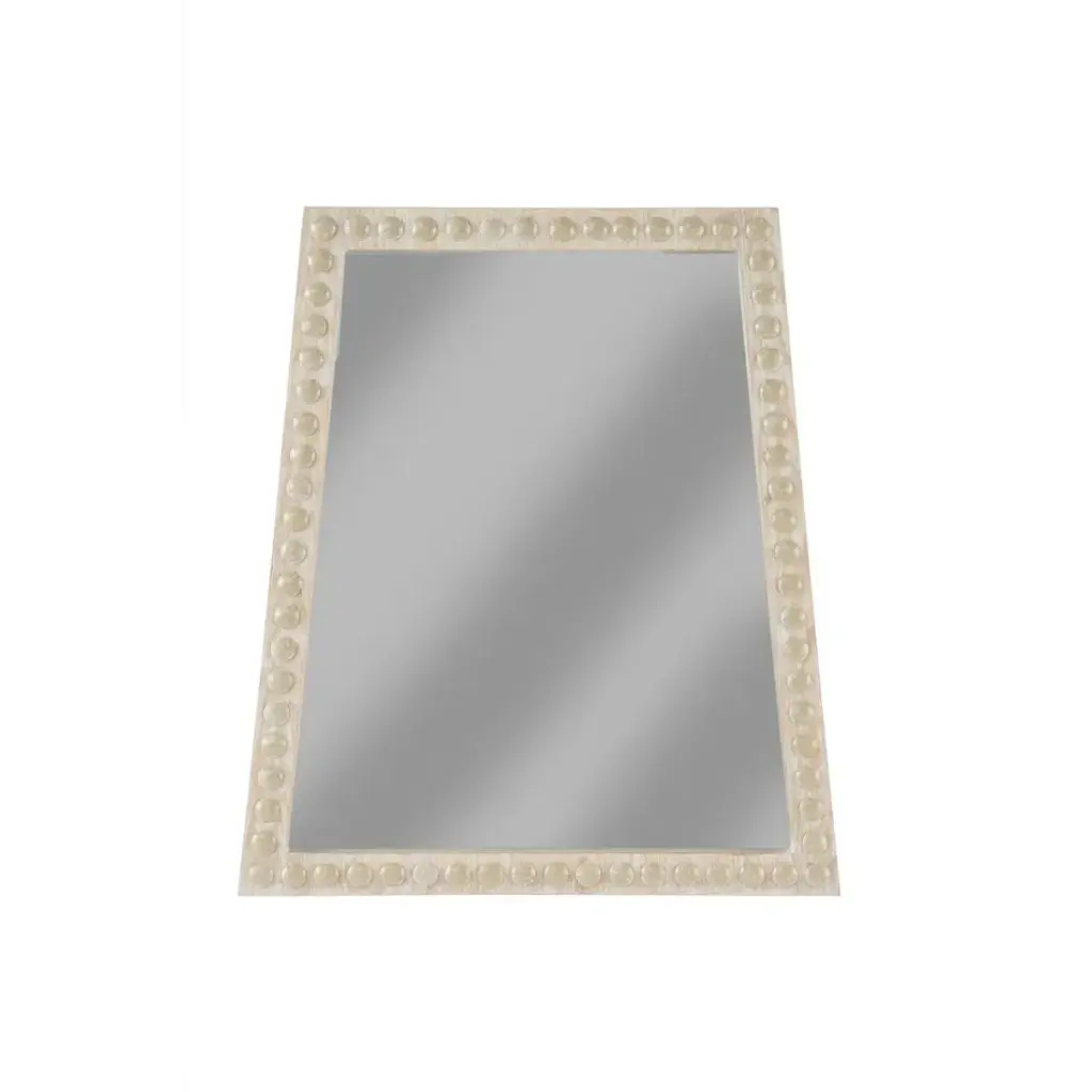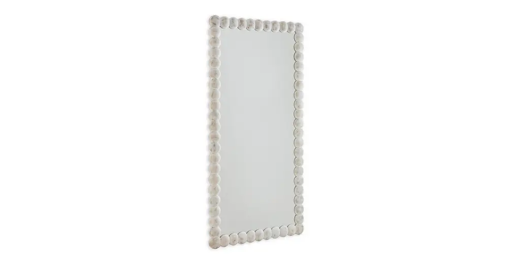 The Paige Floor Mirror features a white-washed decorative frame. Anti-tipping hardware included. It is not recommended to hang on the wall. The hand crafted details produced by a skilled artist lends itself to a unique technique and will vary slightly.
