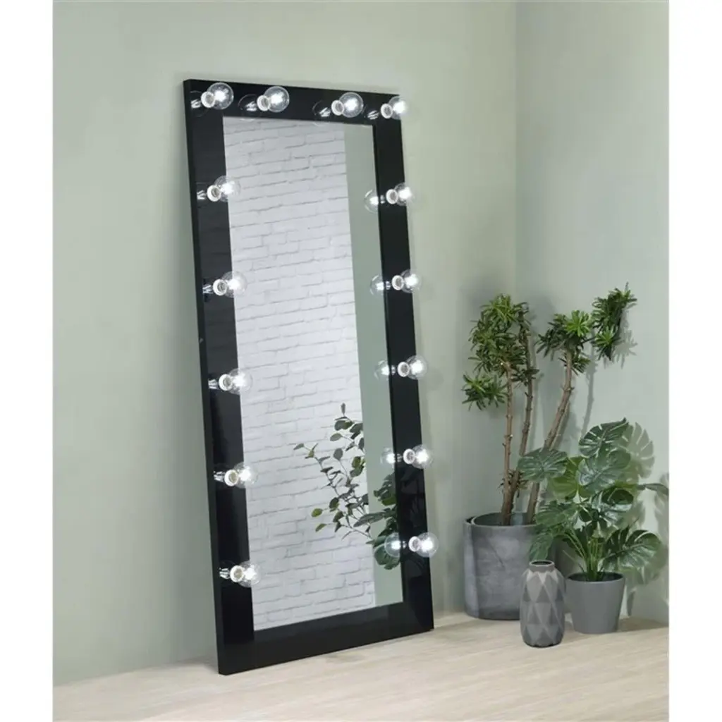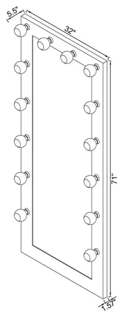 Rodeo Drive is no match for this Hollywood-inspired full-length floor mirror, a glam element with plenty of functionality. Set your sights on the mirror for an extra treat, placing it in a bedroom or dressing space and admiring a clean look with subtle accents. MDF and paper veneer forms a rectangular frame dotted with LED lights infusing a radiant glow. This mirror is functional, but also decorative enough to count as one of your primary pieces. A two-way switch operates its on-off functions.Features: • Includes: One (1) floor mirror • Color: Mirror and Black • Materials: MDF, paper laminate, mirror • Bulb type watts: 4W • Switch type: 2 way • Mirror thickness: 5mm • Bulb type: Type G (G80) • Socket: E26Specifications: • Product Dimensions: 71" H x 32" W x 5.5" D • Product Weight: 53.64lbs • Number of Lights: 14 • Wattage: 4W each bulb, total 56W • Assembly Required: Yes
