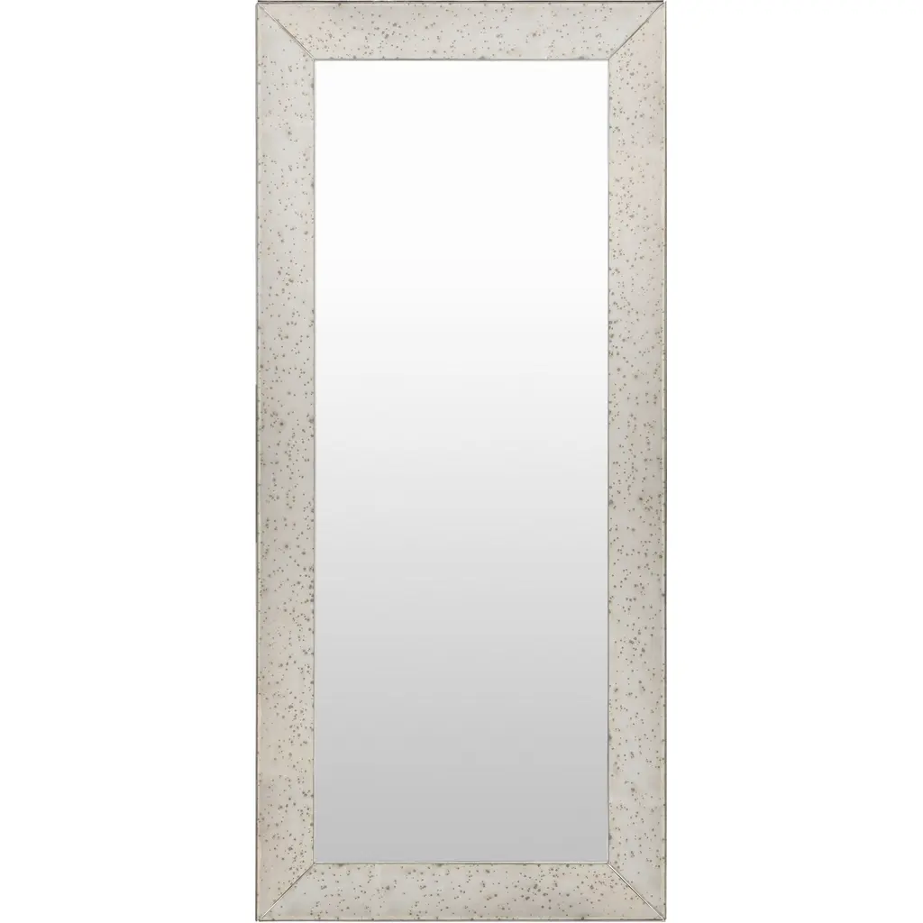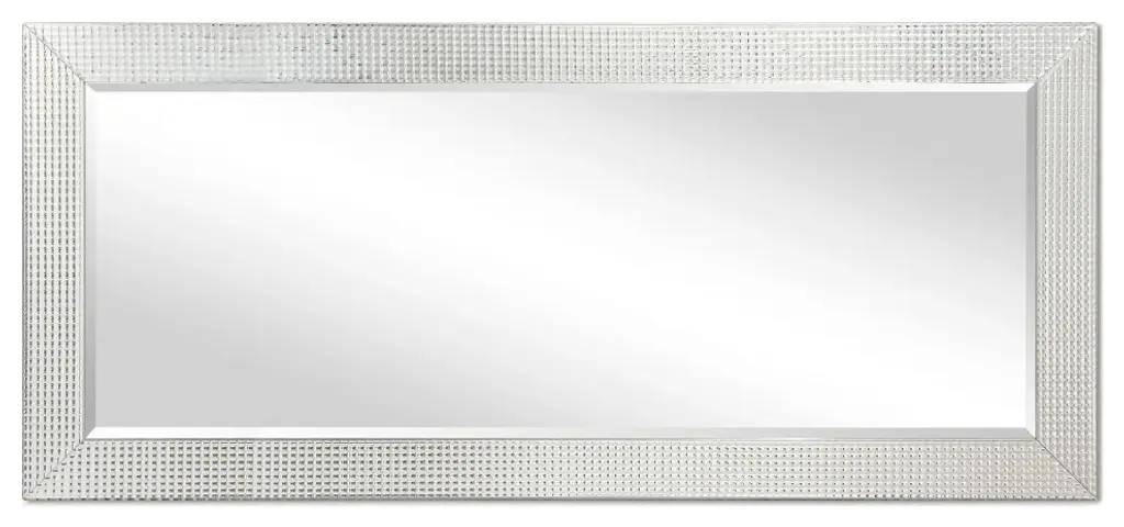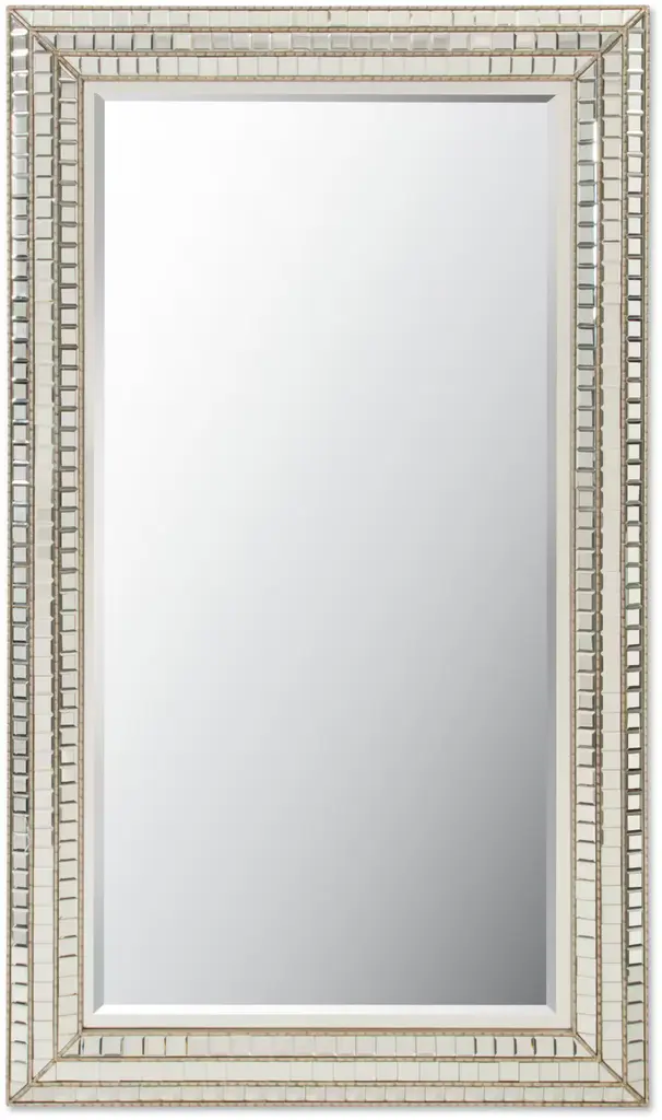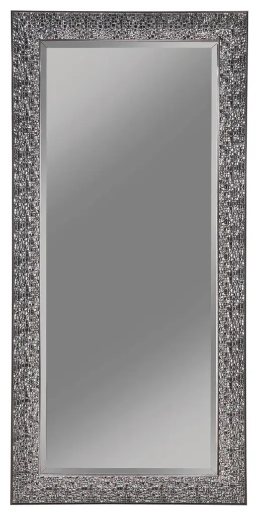 Stylize any room with glam and function. Make this rectangular mirror a staple in a bedroom or main living space. Decorative elements on its wide frame add an elegant accent. Make use of open spaces with an extraordinary, artistic piece. Choose a finish that completes a custom designed space.Features: • Includes: One (1) floor mirror • Finish: Silver Sparkle • Materials: Glass • Contemporary floor mirror with textural frame • Frame features raised mosaic inspired design in silver sparkle • Clear mirror with beveled edgeSpecifications: • Product Dimensions: 66" H x 32" W x 0.5" D • Product Weight: 38.5lbs • Assembly Required: No