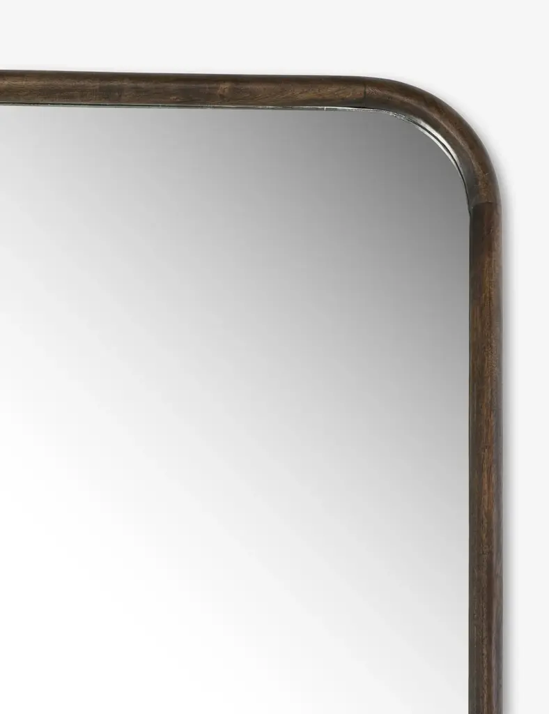 Sleek yet substantial, this floor mirror features a gently arched base and rounded corners for a thoroughly refined silhouette. The slim metal frame lends a modern edge, balancing soft curves with clean lines. Oversized in scale, this floor mirror offers a quiet statement that brings light, depth, and polish to any room.