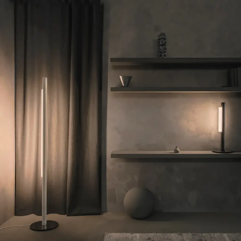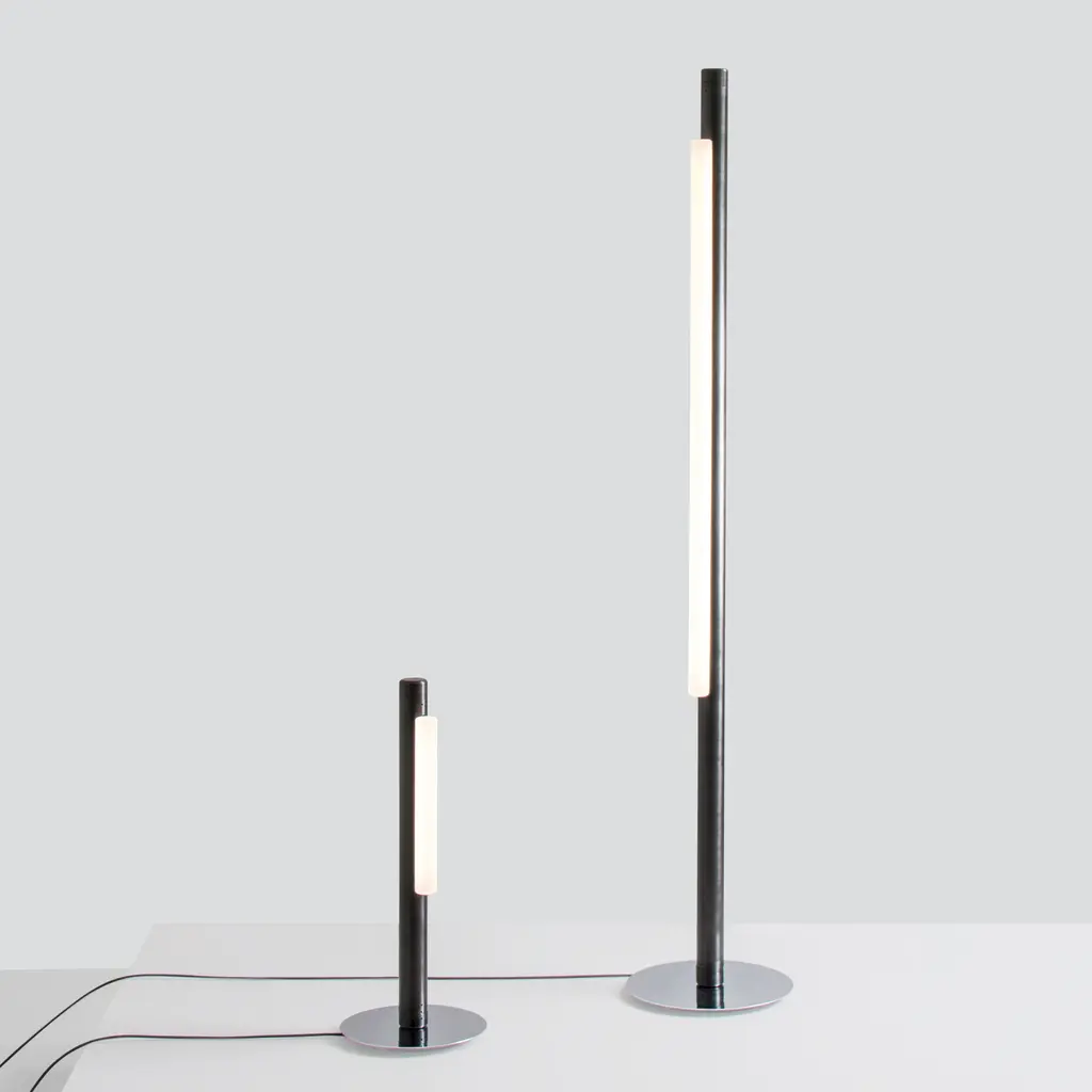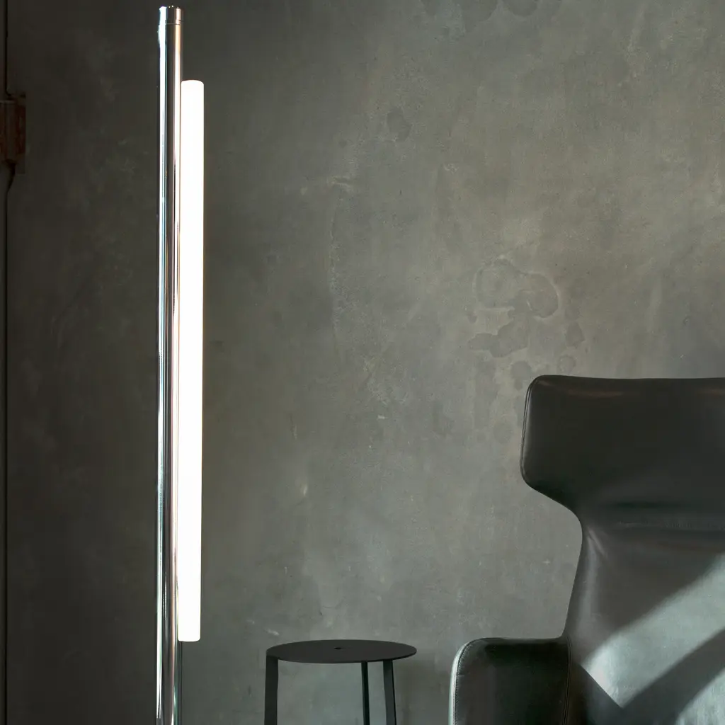Starkly elegant, Pipeline is pure form, standing straight and resolute, balancing on a weighted, mirror-finish chrome base in the floor light variation. A-N-D designer Caine Heintzman's freestanding lamp emits a striking vertical beam of light via a specially developed diffuser that both softens the LED illumination and magnifies the surrounding effect.