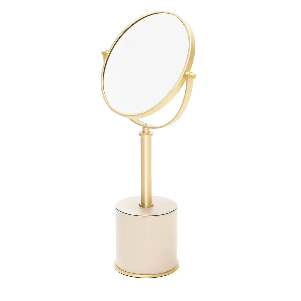Metal structure available in different finishes featuring a heavy leather-covered base that grants perfect stability. The mirror rotates for a choice of 2x magnification or standard reflection. Metal finishes available: chrome / bronze / brass.