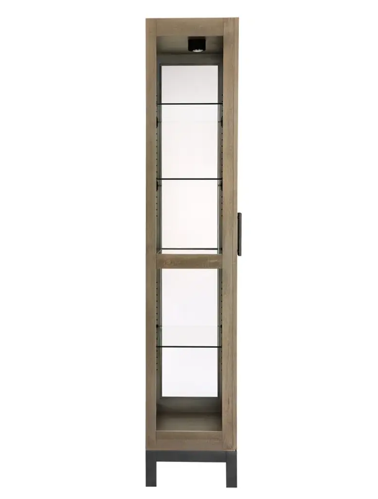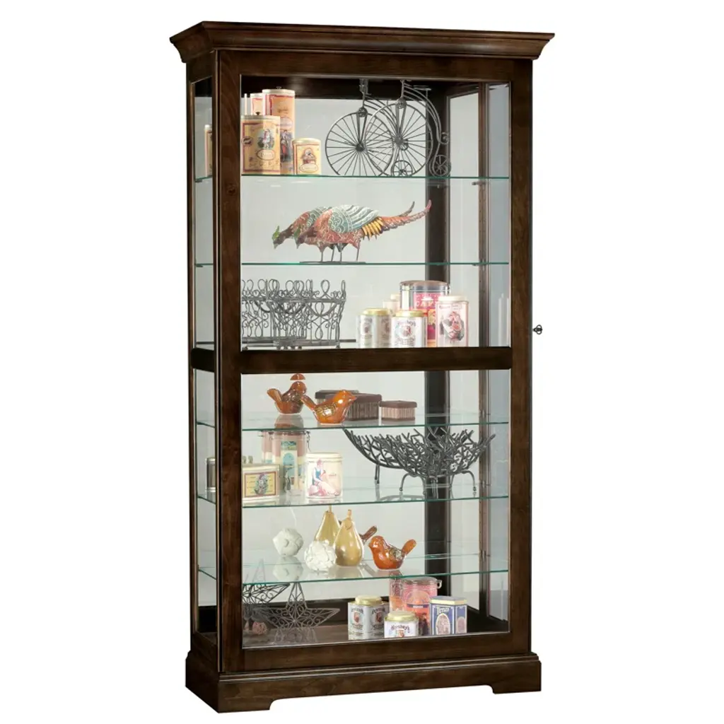 Display your items with pride in this stunning curio cabinet. With beautiful materials and a custom design, this lighted curio cabinet is a must-have addition to any home or office. Careful craftsmanship: this lighted curio cabinet features an aged gray finish on select hardwoods and veneers. The finish is wire brushed for a natural, reclaimed wood appearance, completing the careful craftsmanship of the entire piece. Detailed design: no detail was missed in the design of this glass display cabinet. The curio cabinet features a distinctive charcoal-finished base paired with hinged front glass doors, boasting antique charcoal-finished bar pulls. A glass mirrored back enhances your view of displayed items. Adjustable features: change this lighted curio cabinet's layout with its adjustable features. Four adjustable glass shelves offer five levels of display with continuous holes for shelf adjustment. Additionally, adjustable floor levelers provide stability on uneven floors, and the entire design allows for two or more of these cabinets to be used as bunching cabinets. Safety and convenience: keep your items safely stored with this curio cabinet. Pad-lock metal shelf clips lock shelves into place, and a no-reach roller On/Off light switch for the interior cabinet light is located on the back of the shelf for convenience. Howard Miller: Founded in 1926 and still family-owned in its third generation, Howard Miller is the world's leading clock company and a respected brand name in fine specialty furnishings such as curio cabinets, wine and bar furnishings, custom storage cabinets, SmartMoves adjustable height desks.