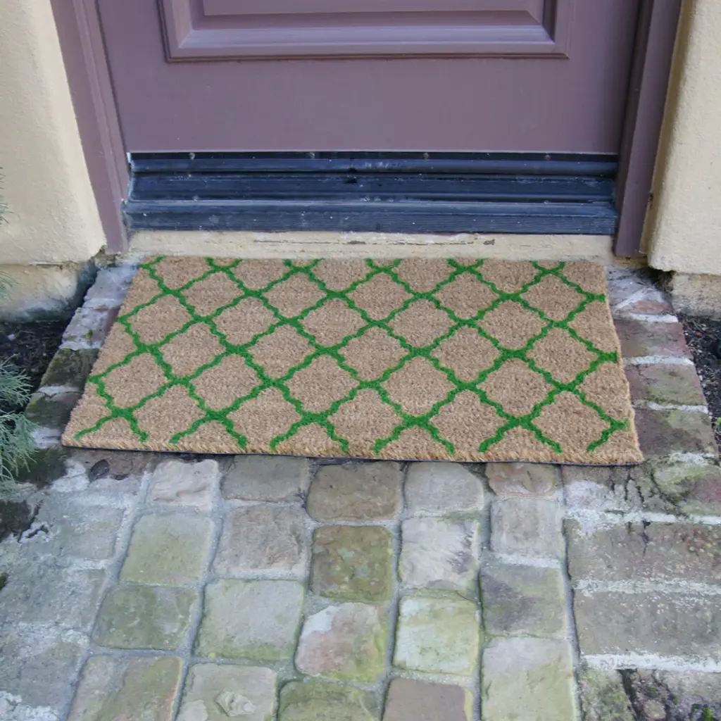 When you need a unique, tasteful doormat for your home or office, you need one that is both pleasing to look at, as well as effective at keeping your interior spaces clean. In both of these endeavors, "the Moroccan" Green dirt trapper doormat excels. Displaying a tight array of green lattice doormat links across a tan coir field, these contemporary doormats are designed to mirror "tried-and-true" North African designs that have been used in the tapestry and elegant doormat industries for generations. The versatility of its design "as well as its general pleasing aesthetic "means that this striped doormat can be used in a variety of different situation; from garage doormats to workplaces to foyers. The size of these coir doormats further makes them suitable for nearly any area. Clocking in at 18 inches in width by 30 inches in length, "Moroccan" green patterned door mats are easily capable of fitting in snugly into even narrow doorways while still having a surface area large enough to sufficiently cover a wide area. This simple, classic design, however, perhaps betrays the rugged, take-no-prisoners cleaning nature of these entryway mats. Even the most mucky, dirt-caked boots can be treated sufficiently with just a few scrapes along the all-weather, extra-tough bristles of a coconut fiber doormat. The durable bristles themselves are likewise resistant to the ailing effects of water and dirt, and will surprise you with how well the hold up under even the most severe of circumstances. Because coir is taken from the husks of coconuts and manipulated by hand using sustainable harvesting methods, using coir doormats for all your modern doormats is a sensible, eco-friendly alternative to using synthetic rubber or plastic floor mats.