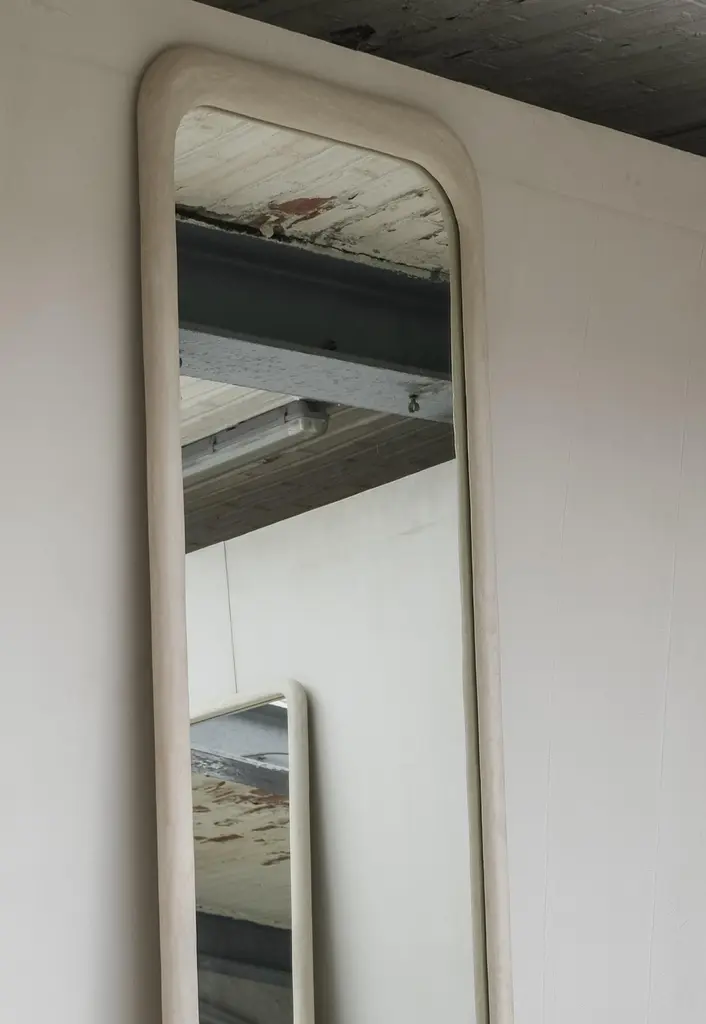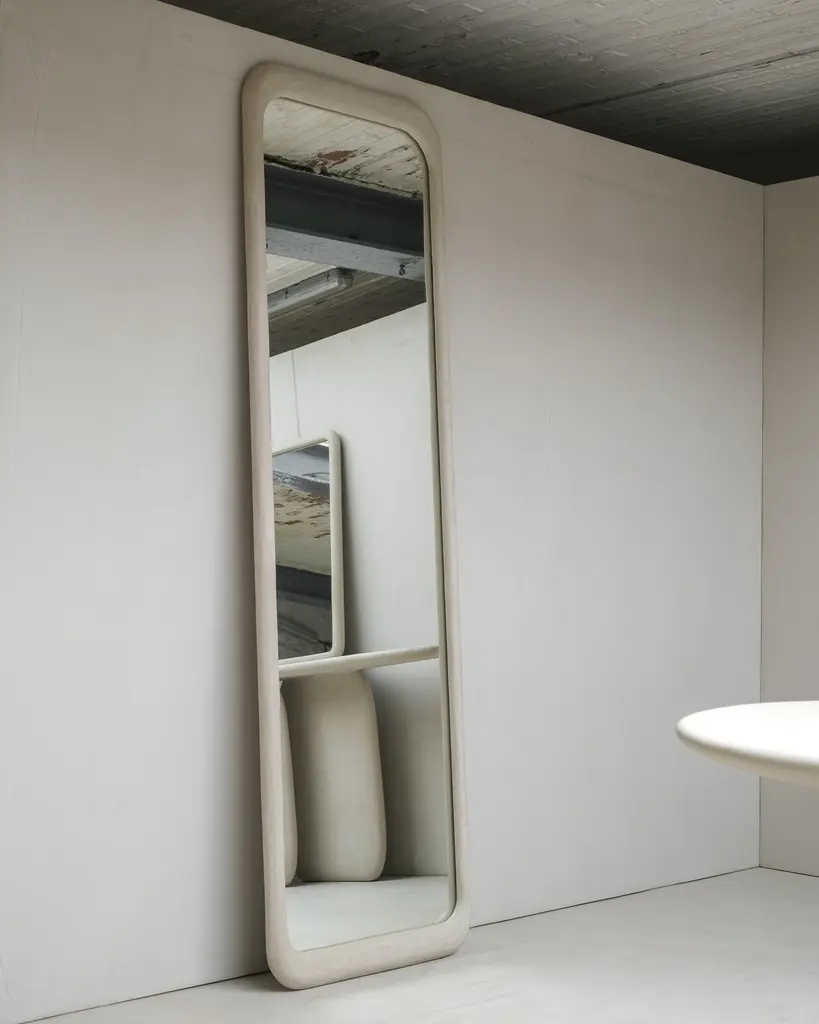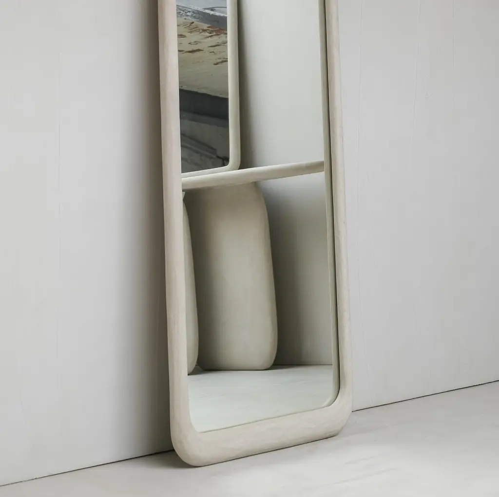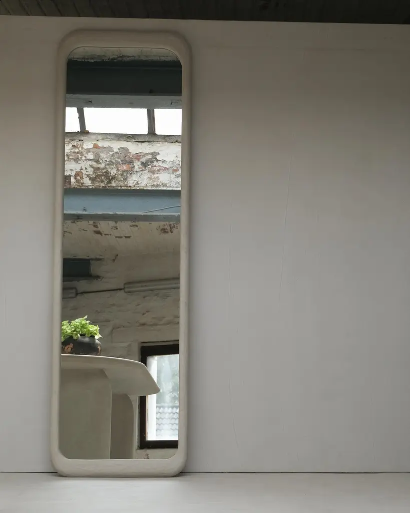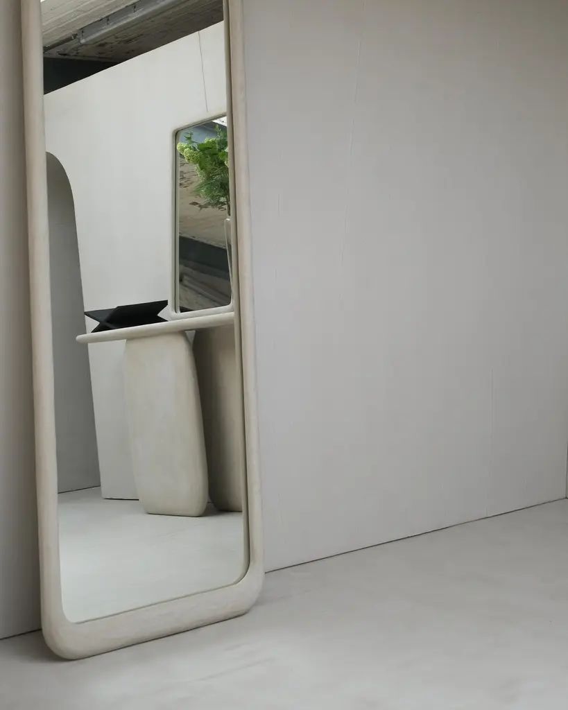 Sabbia Large Wood And Colored Mineral Lime Plaster Floor Mirror by Dennis KaiserDimensions: D 5 x W 65 x H 220 cm.Materials: Solid wood, mirror, and plaster.Handcrafted in Tuscany, Italy. Customization is available on request. Please contact us.This mirror embodies organic modernism. Its handcrafted wooden frame, with layers of colored mineral lime plaster carefully applied, creates a unique and textured finish.Born in Belgium and based in Tuscany, Italy, since 2018, Dennis Kaiser creates furniture that seamlessly combines his roots in Belgian design with the artisanal traditions of Tuscany.Guided by a philosophy of durability and timelessness, Dennis Kaiser transforms raw materials into soulful objects. Each piece is carefully designed and expertly handcrafted in Tuscany, Italy, using locally sourced materials, ensuring that every creation tells a unique story and supports the region’s artisanal heritage and traditional practices.The process of shaping raw materials into sculptural forms by hand gives each piece a unique character.Dennis Kaiser is a multidisciplinary design studio, continually evolving its artistic vision through an expanding collection of furniture and objects.