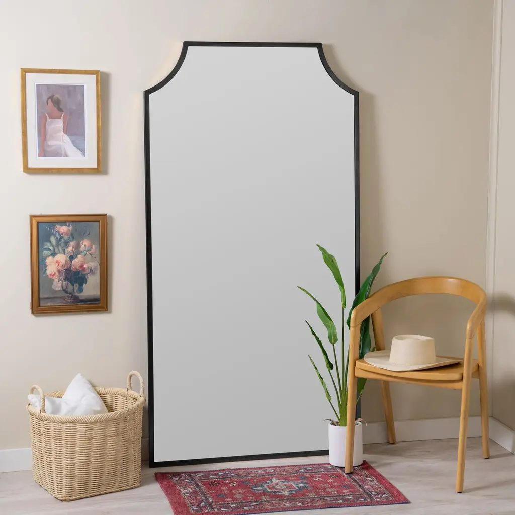 Concave corners on the top give this floor mirror timeless panache. Nearly six feet tall, it will command attention in a bedroom, an entry, or just about anywhere else in your home.
