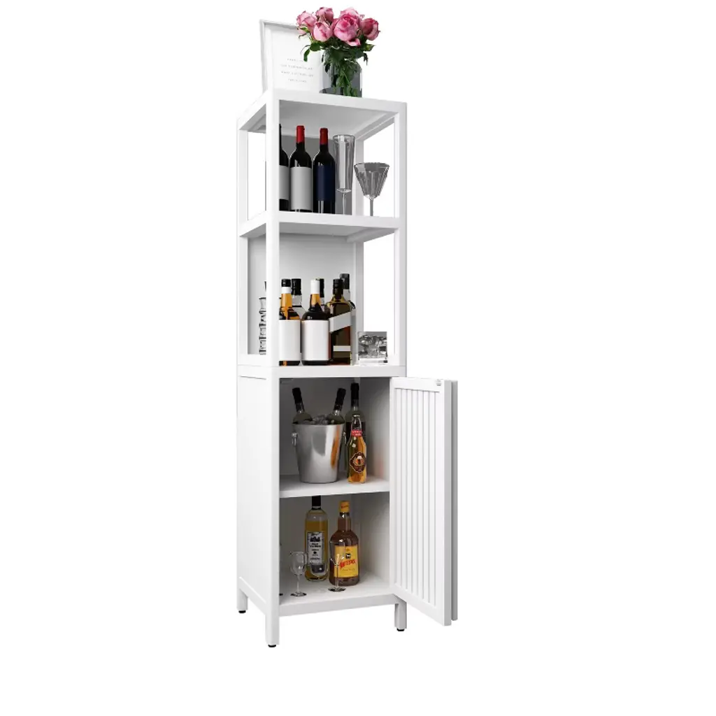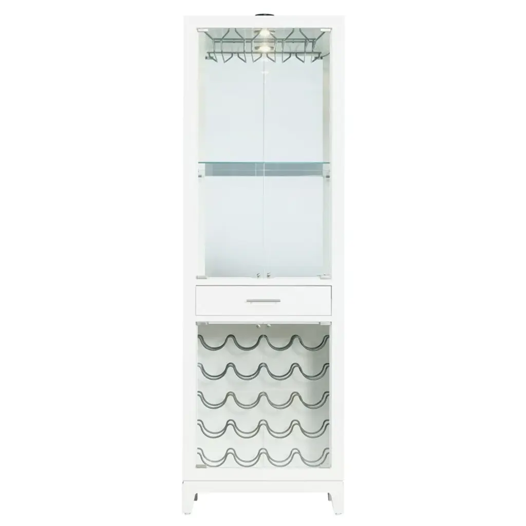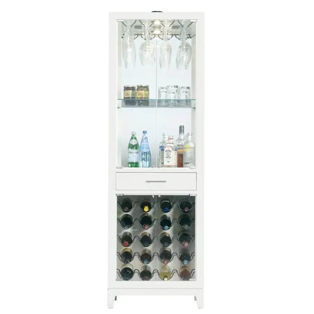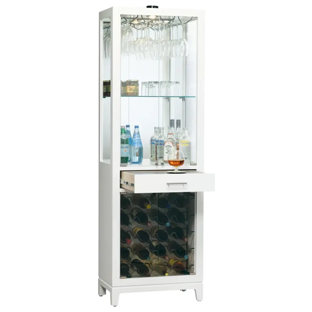 Finish on select hardwoods and veneers. Satin nickel-finished hardware. Storage drawer with full extension metal slides and laminated lift-up work surface. The top display area has a hanging stemware rack, a mirrored back, and one adjustable glass shelf. Four glass doors: Two for the top display area and two for the bottom wine storage area. The bottom wine rack can hold up to 20 bottles. Touch-lite with four light levels; the switch is conveniently located on the upper right door hinge. Adjustable floor levelers.