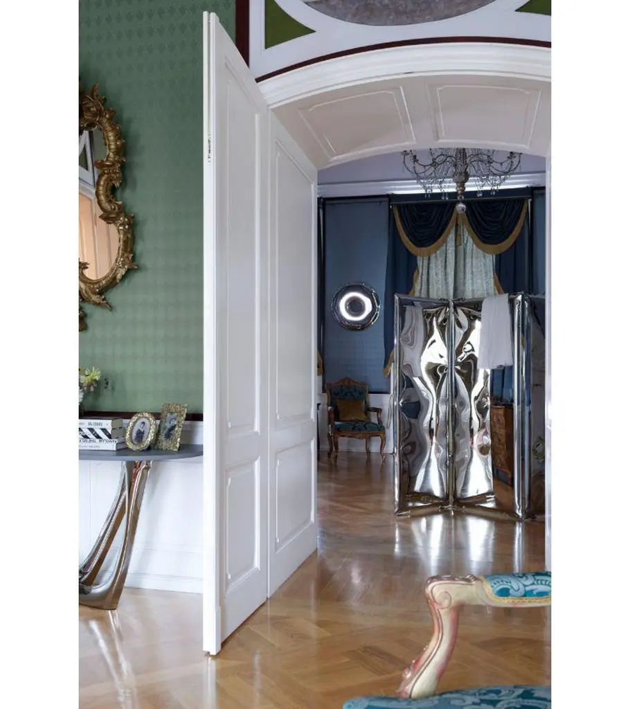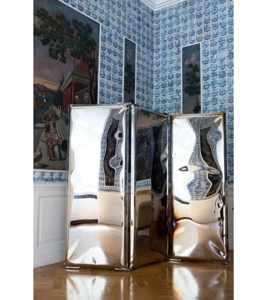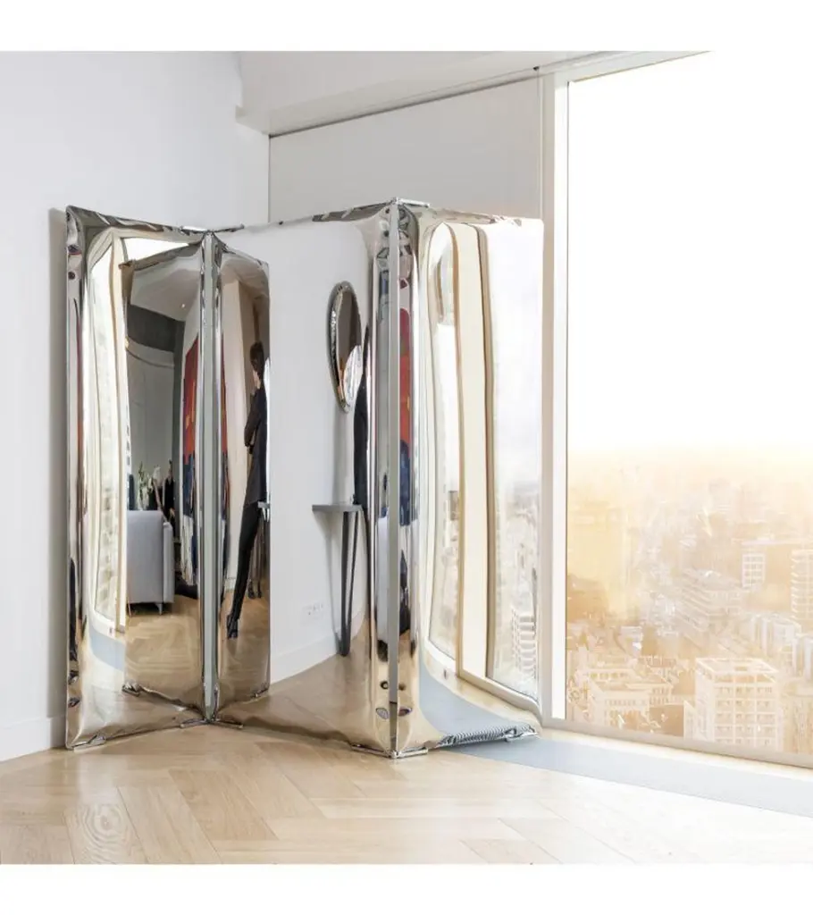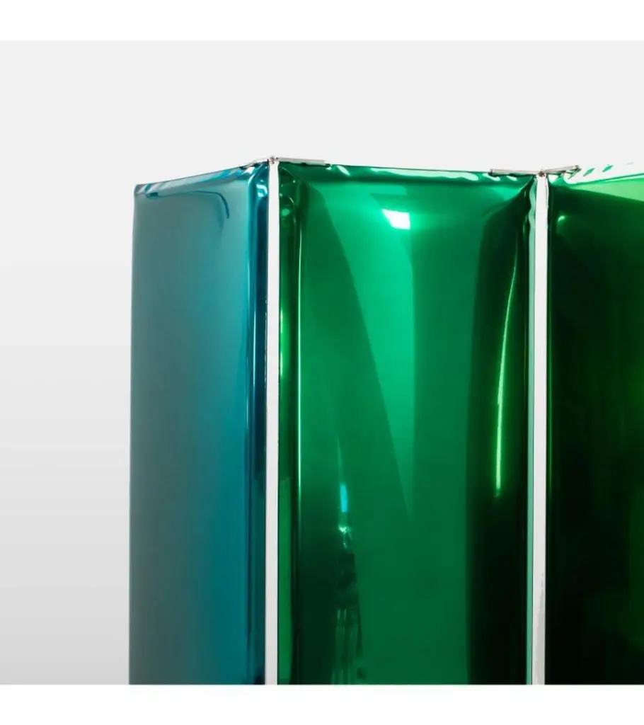 Sapphire sonar sculptural floor mirror by ZietaLimited edition of 7. Dimensions: D 10 x W 215 x H 182 cm Material: stainless steel. Finish: Sapphire.Available in finishes: stainless steel, deep space blue, emerald, saphire, saphire / emerald, dark matter, and red rubin.Lose yourself in the SONAR’s reflection! The SONAR mirror is a sculptural object that strongly defines the space and generates all sorts of visual impressions. includes RONDO in emerald, deep space blue, and sapphire-green shades.SONAR provides an original stylish solution for open plan interiors allowing to create a room full of reflections. It is not only a mirror or a partition wall – it is a piece of art that bends, expands, and splits the space – accordingly to your needs.About Zieta: Zietas main goal is to deliver uniqueness and customization in design and construction while keeping the production, transport, and warehousing innovatively efficient.This is how they imagine the future world: Light, durable structures of customized applications produced on demand out of one-of-a-kind parts, yet efficiently.They use a computer-controlled production process. Customized pattern, customized form, customized function, one-of-a-kind product, and outstanding precision are what they deliver.You will find all of this philosophy reflected in the products. The research, they discover new possibilities, they play with forms and they deliver a beautiful, innovative, surprising outcome to people who love the design and who care about design development.They believe their work is a valuable contribution to the world of design not only by the unique beauty of the forms but most of all by opening ultra-innovative opportunities of forming and new paths for the world of the future. __