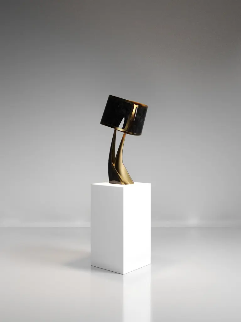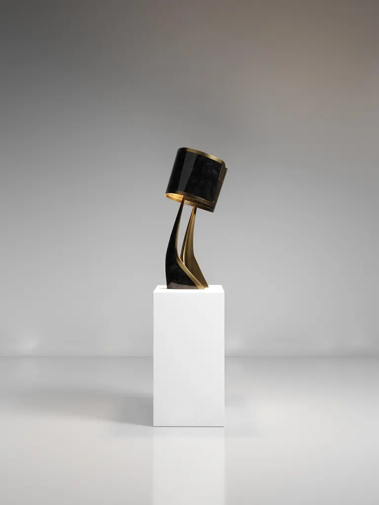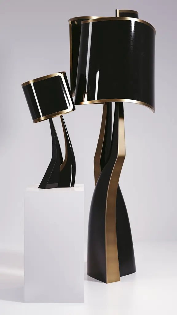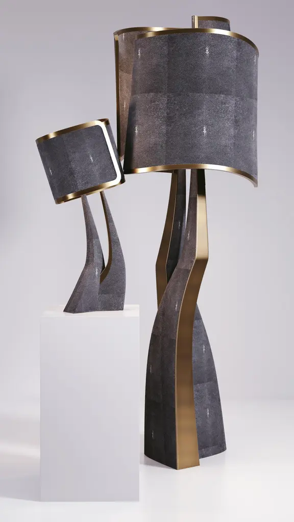 The Paris based label has distinguished themselves since their launch, with their iconic use of shagreen mixed with brass and other exotic materials. All furniture is handcrafted by skilled artisans, ultimately making each piece unique, designed in Paris and produced in the Philippines.The Chital III Floor Lamp by Kifu Paris is a sleek and sculptural piece, inlaid in a mixture of bronze-patina brass and col black shagreen. The chiseled legs, which are an iconic shape within the KIFU PARIS universe, morph into the solid shades that create a modern-vintage feel. Available in other finishes and as a table lamp, see images at end of slide. This piece is designed by Kifu Augousti, the daughter of Ria and Yiouri Augousti.All shagreen pieces are hand-dyed by artisans.The dimensions of this piece are 75.4 x 74.3 x 207 cmAll Kifu Paris pieces are handmade by artisans, ultimately making each piece unique. Custom color or sizing available on request. Wipe clean with soft dry cloth.Although inspired by her parents, her collection of home accessories and furniture is a distinct identity of its own. Kifu uses handmade techniques of elaborate inlay patterns of shagreen, shells, semi-precious stones, materials she experienced as a child growing up in her parent’s studio, but interpreted in a younger quirkier way reflecting her youth. From her "jewelry inspired knobs" on decorative boxes, gold bar boxes and an extravagant inlay pattern mix of shagreen and shell inspired by galactic constellations, as seen on her enormous round mirror is refreshing to see. Kifu embodies whimsical elements throughout her collection and is not afraid to be daring and unexpected in her approach to design.All shagreen-covered items should be kept out of direct sunlight, color variants may occur on the stingray and other exotic finishes, but this showcases the Parisian label's commitment to creating authentic luxurious products using natural components.