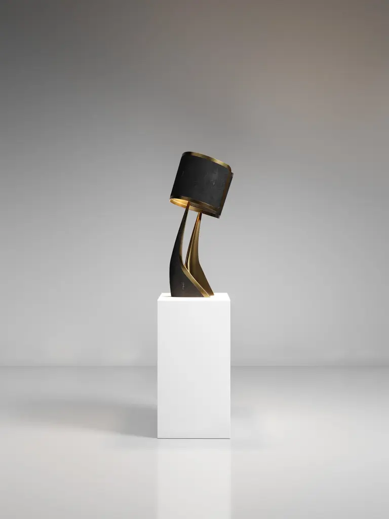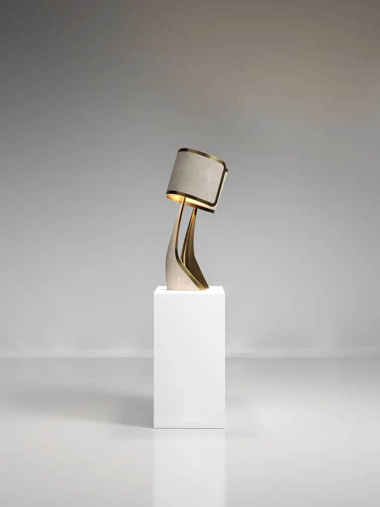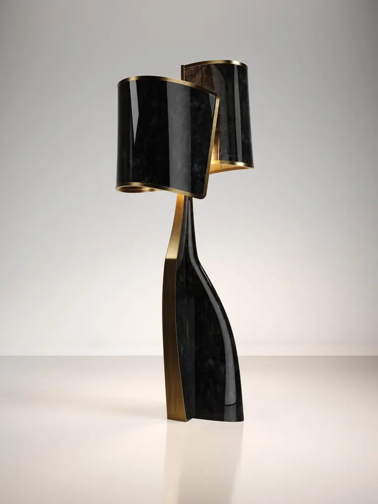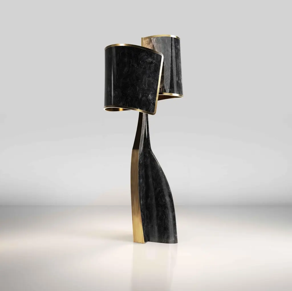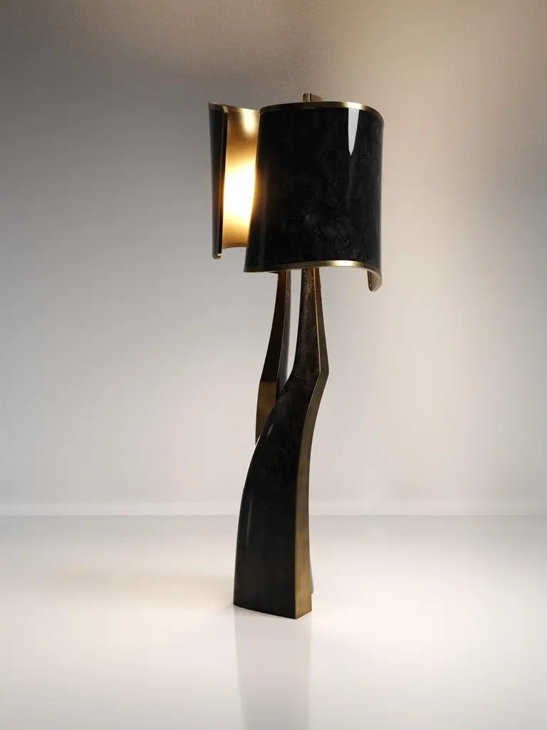 The Paris based label has distinguished themselves since their launch, with their iconic use of shagreen mixed with brass and other exotic materials. All furniture is handcrafted by skilled artisans, ultimately making each piece unique, designed in Paris and produced in the Philippines.The Chital III Floor Lamp by Kifu Paris is a sleek and sculptural piece, inlaid in a mixture of bronze-patina brass and cream shagreen. The chiseled legs, which are an iconic shape within the KIFU PARIS universe, morph into the solid shades that create a modern-vintage feel. Available in other finishes and as a table lamp, see images at end of slide. This piece is designed by Kifu Augousti, the daughter of Ria and Yiouri Augousti.All shagreen pieces are hand-dyed by artisans.The dimensions of this piece are 75.4 x 74.3 x 207 cmAll Kifu Paris pieces are handmade by artisans, ultimately making each piece unique. Custom color or sizing available on request. Wipe clean with soft dry cloth.Although inspired by her parents, her collection of home accessories and furniture is a distinct identity of its own. Kifu uses handmade techniques of elaborate inlay patterns of shagreen, shells, semi-precious stones, materials she experienced as a child growing up in her parent’s studio, but interpreted in a younger quirkier way reflecting her youth. From her "jewelry inspired knobs" on decorative boxes, gold bar boxes and an extravagant inlay pattern mix of shagreen and shell inspired by galactic constellations, as seen on her enormous round mirror is refreshing to see. Kifu embodies whimsical elements throughout her collection and is not afraid to be daring and unexpected in her approach to design.All shagreen-covered items should be kept out of direct sunlight, color variants may occur on the stingray and other exotic finishes, but this showcases the Parisian label's commitment to creating authentic luxurious products using natural components.