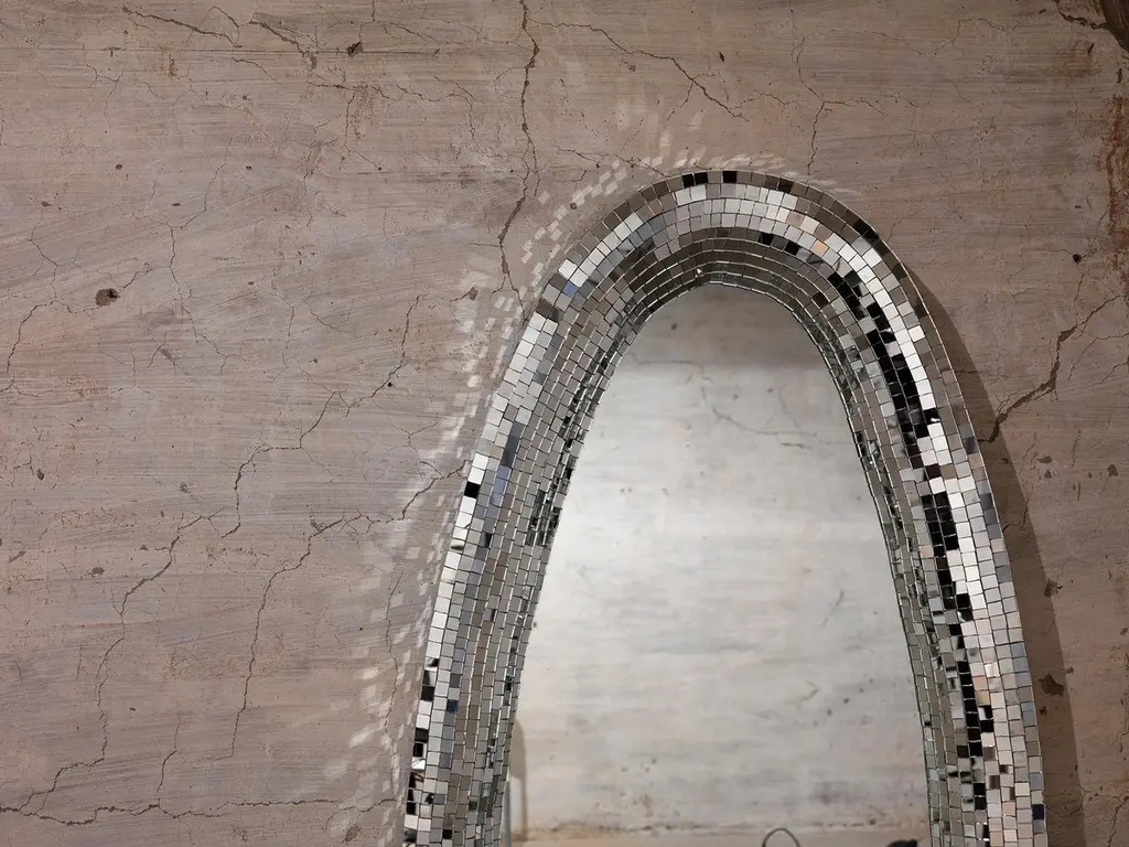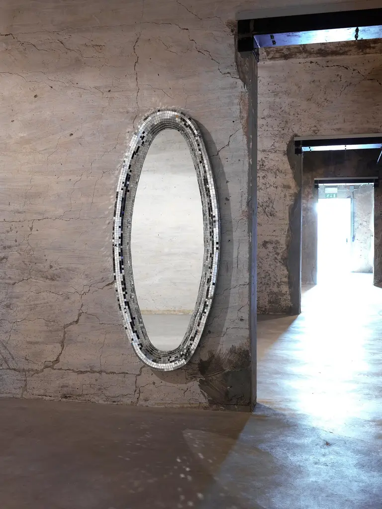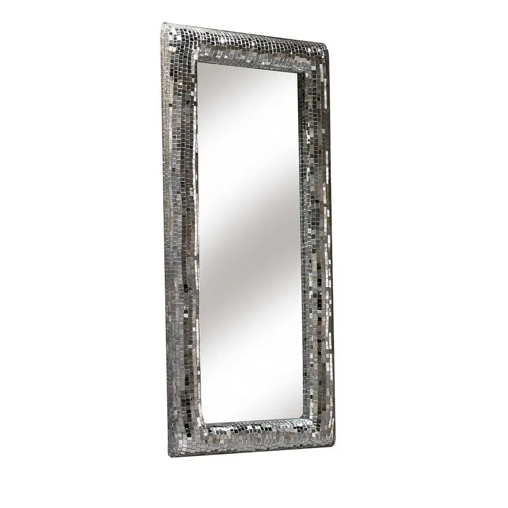 Silver Atollo mirror by Davide MedriMaterials: mirror, glass mosaic (silver)Also available in gold.Dimensions: H 170 x D 70 cmDavide Medri was born in Cesena on August 7th 1967 and graduated at the Academy of Fine Arts in Ravenna, the Gino Severini State Mosaic Institute and the Albevainer Professional Mosaic School.After various artistic experiences, with the meeting with the Dilmos gallery in 1997, the first furnishing accessories in mirror mosaics were created. Today's portfolio includes, in addition to glass mosaic mirrors: tables, floor lamps, wall lamps and works of art.The manufacture is completely handmade inside the laboratory in Cesena. Every single piece of glass is cut and fixed by hand guaranteeing high quality, each artistic element is unique in its design and can be tailor-made in any size.Davide Medri's works of art have been successful in terms of market, press appreciation and recognition by architects and interior designers in Italy and abroad.