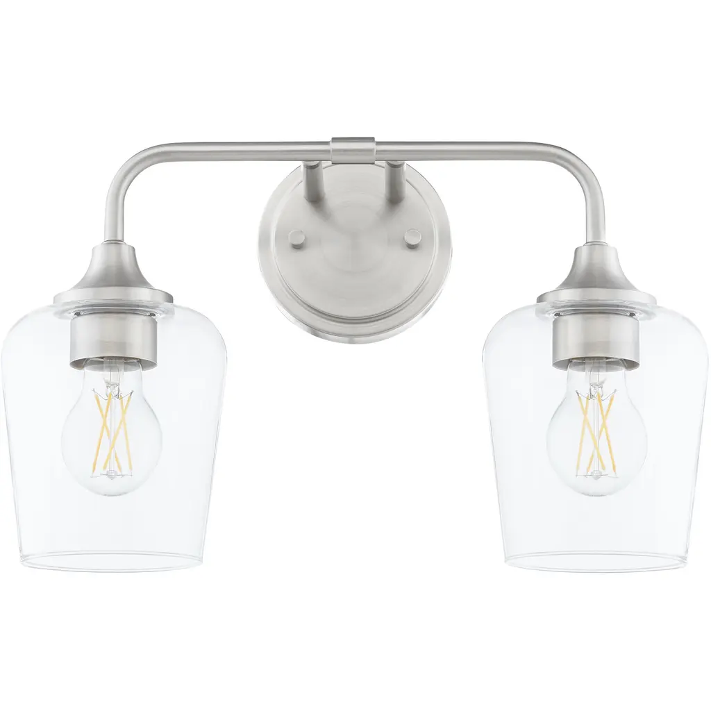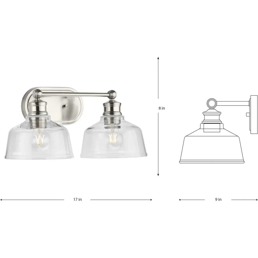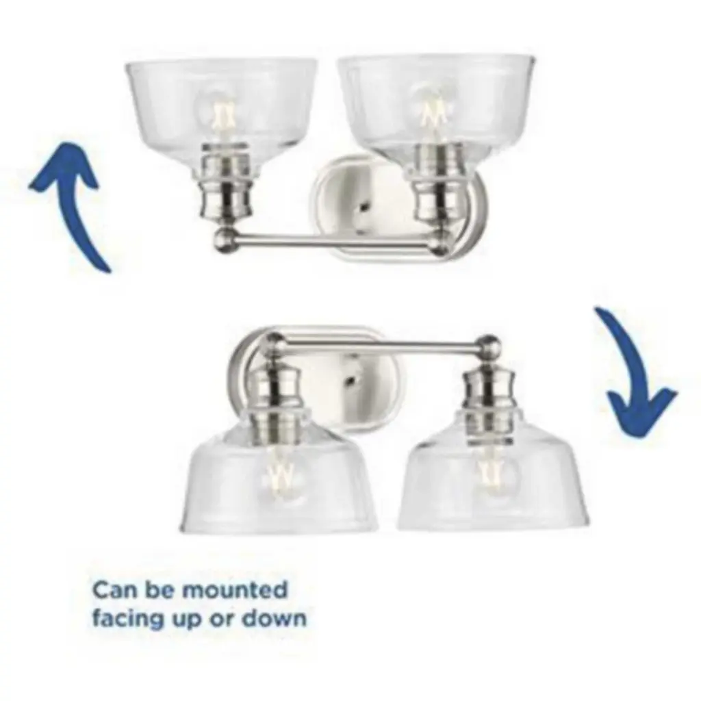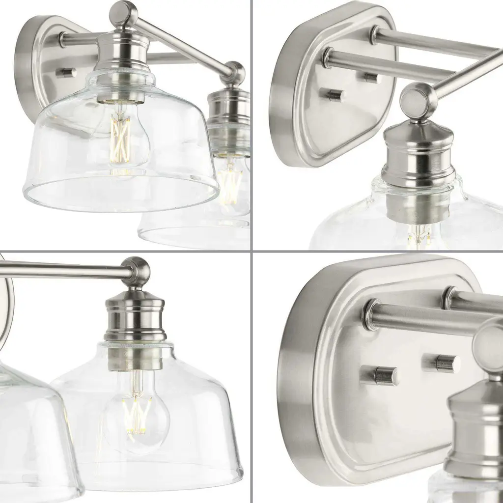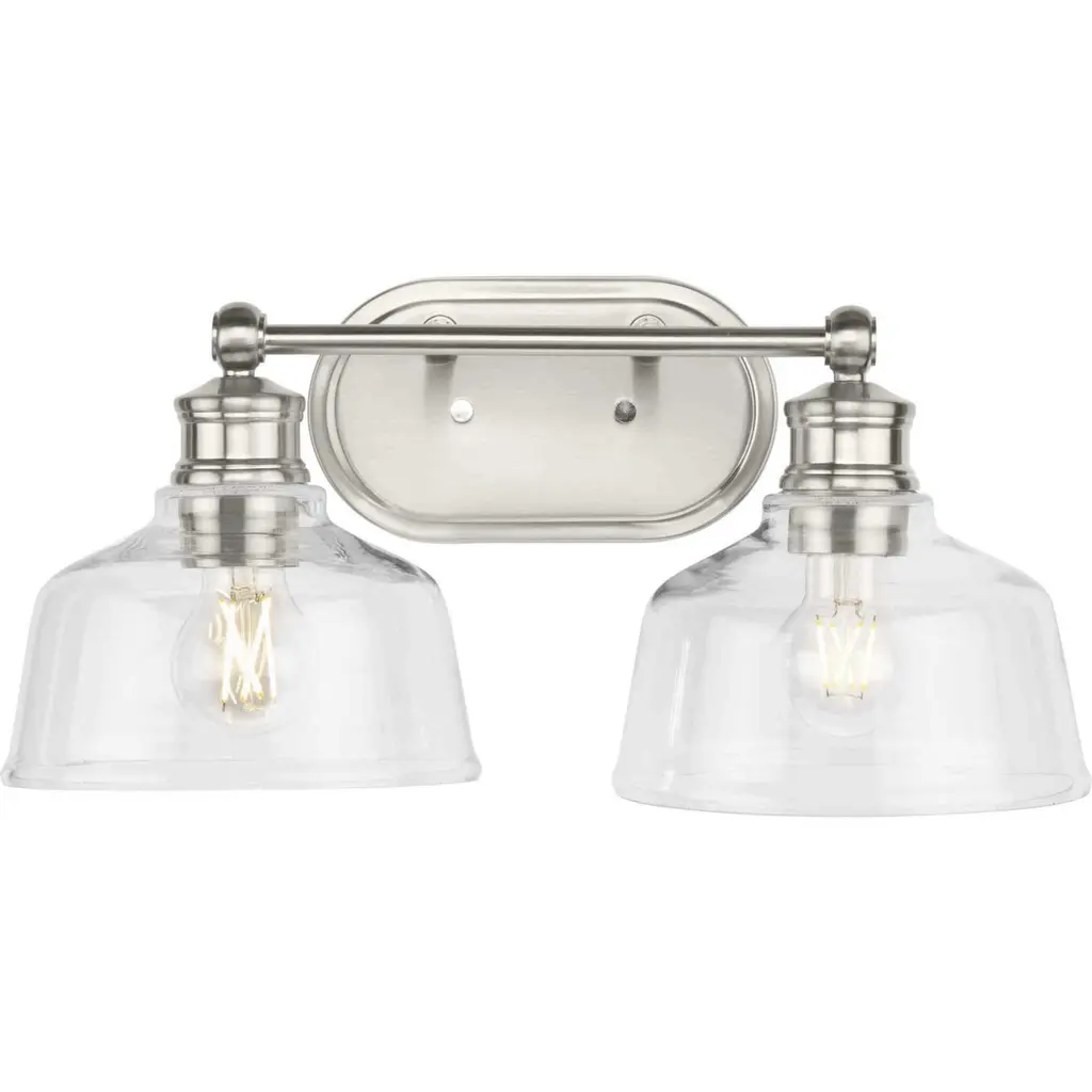 The Singleton Collection 2-light vanity fixture pays homage to industrial styling with oversized warehouse shades fabricated from clear glass. A round backplate and vintage-inspired metal fittings finished in subtle brushed nickel create a timeless design. Place above the vanity mirror for optimal task lighting in the bath. This versatile vanity light can be mounted up or down, casting even illumination in any setting.