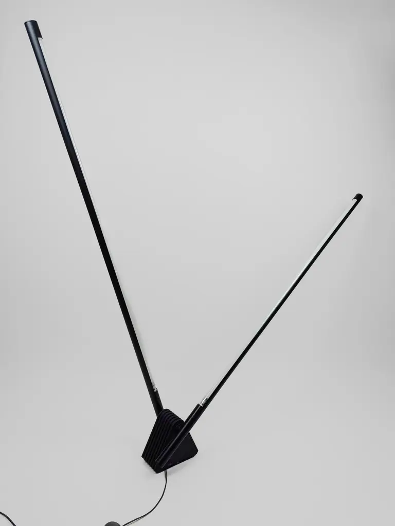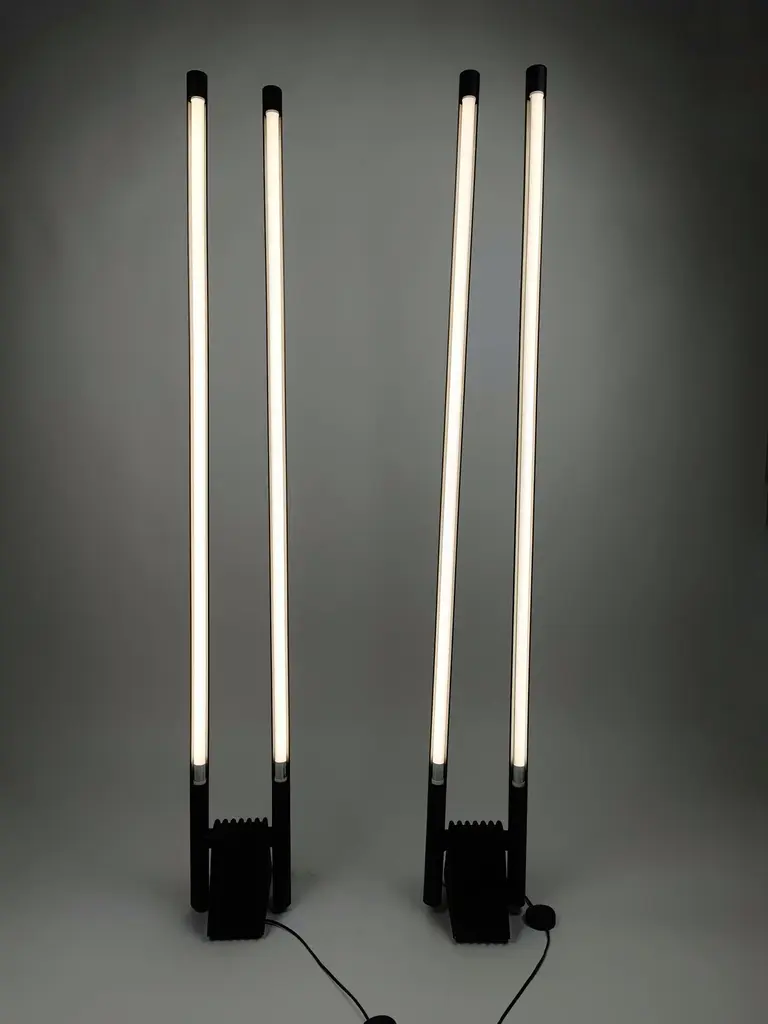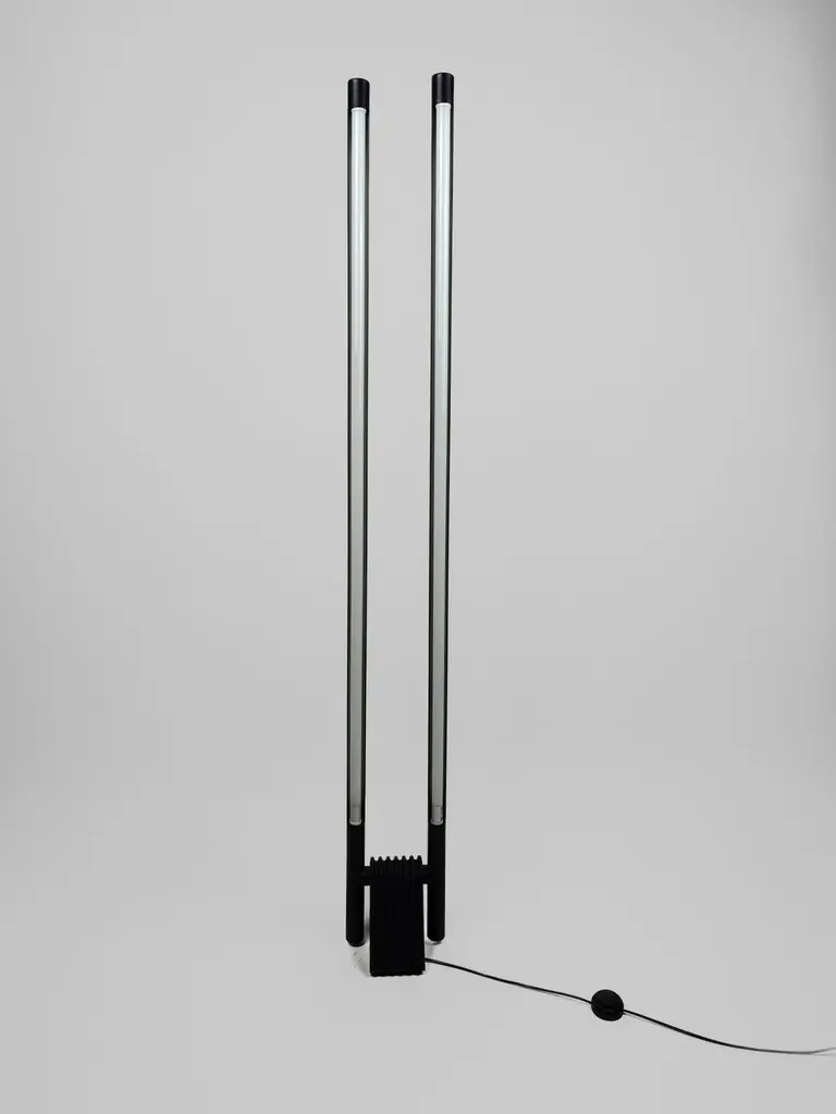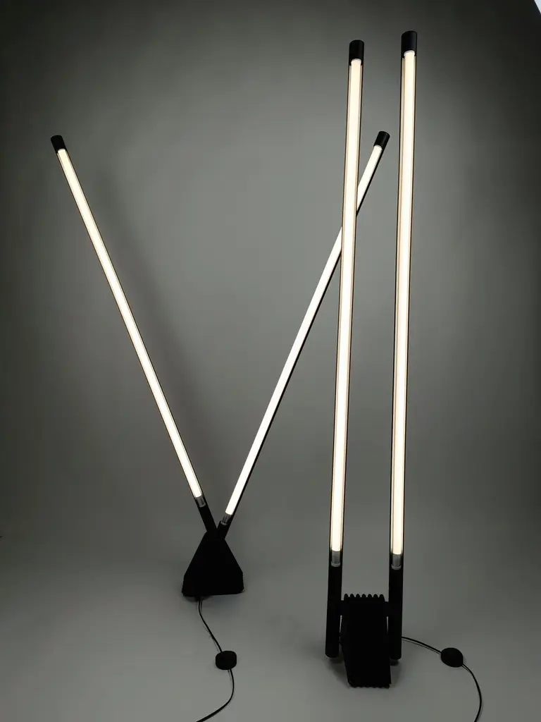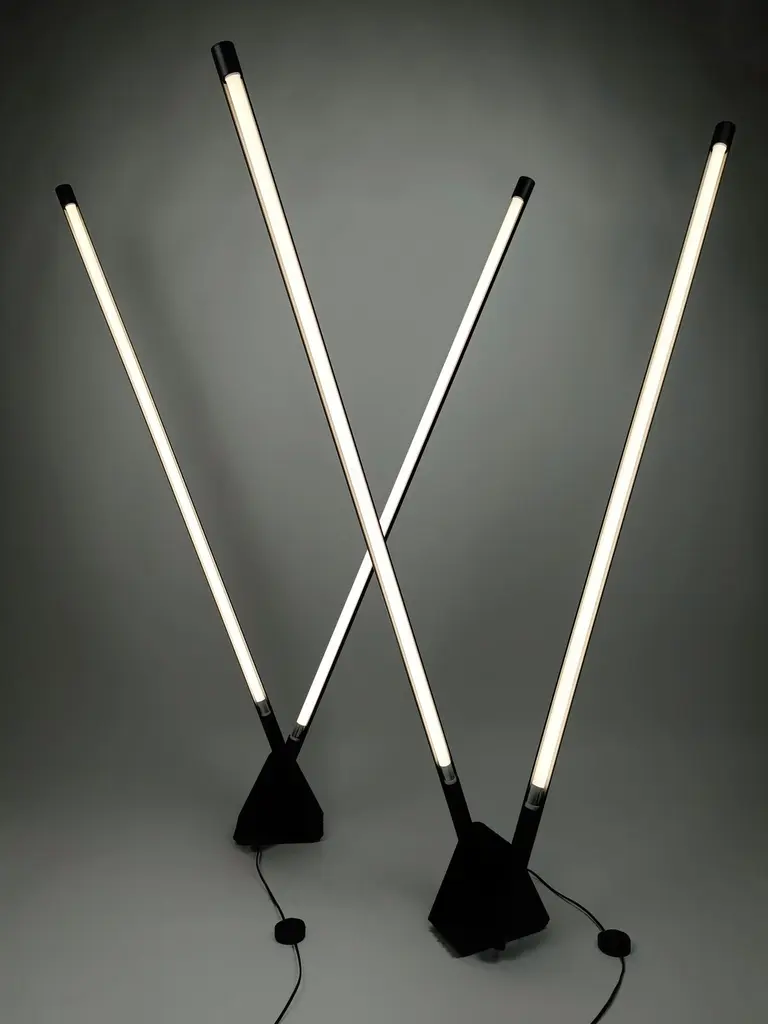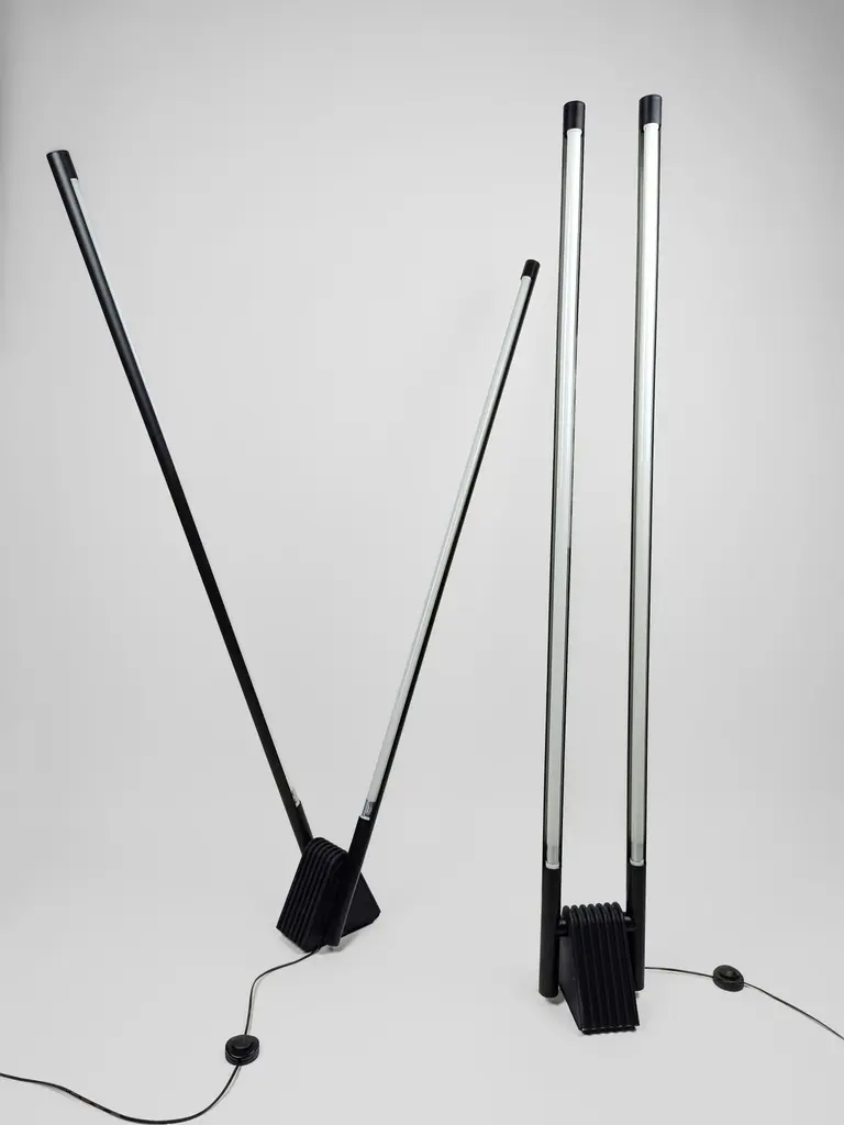 "Sistema Flu" is a magical lamp, and every time we find one in some corner of Italy we buy it to offer it to our customers.In this case we have 2 pieces of the tallest model, 180cm of twin floor lamps that will make you feel like Anakin Skywalker when he decides to use the Jar'Kai fighting technique with 2 lightsabers.Designed in the 80s by Rodolfo Bonetto, designer of many iconic pieces of Italian design such as the Boomerang armchair for B-Line, the Melania chair for Driade and the Lipstick Mirror, it was awarded the Compasso d'Oro award 8 times.The "Sistema Flu" lighting system is designed to bring light to every part of the house with a complete system that has different solutions and sizes: chandelier, table lamp and floor lamp. "Each of these models is perfect because this lighting project works in every size and model, combining function and playfulness.Two adjustable arms start from a black metal body with a triangular section which hold and repair the two lamps.This project was created during the 80s so it used neon lamps but we completely rewired the electrical system by a professional so as to be able to use LED technology, which is more ecological and with lamps that are easier to find than neon which is now almost out of production.The two arms of these Post Modern floor lamps are not only adjustable up to 180 degrees but also allow you to direct the light by rotating the part containing the lamps 360 degrees.I imagine this pair of floor lamps in a minimal home, with a few right pieces that stand out on walls with rough concrete resin finishes or in a Tecno Club.The floor lamps have been rewired by a professional and the LEDs are included in the price.One of the floor lamps is missing caps in the lower part of the arms, although it is not visible we would like to inform customers.one of the bases has traces of glue, probably from an old repair.The price refers to the single Floor Lamp