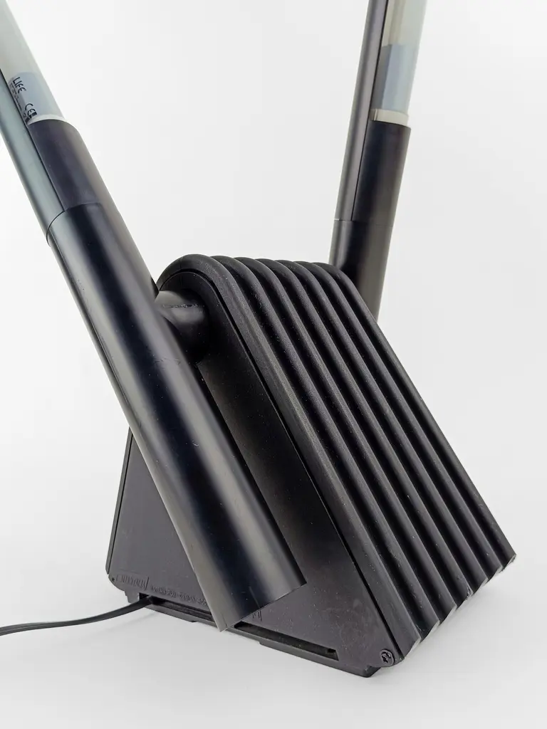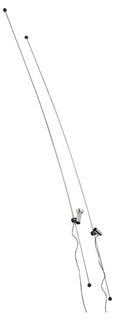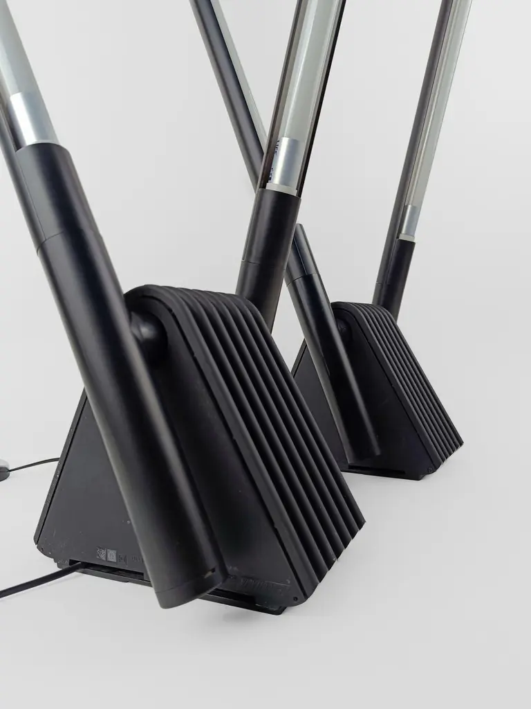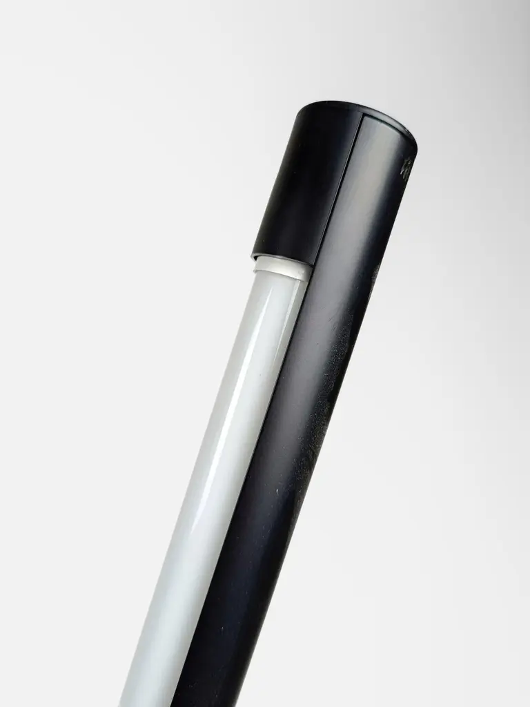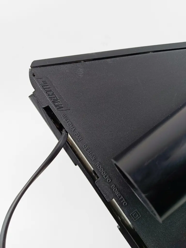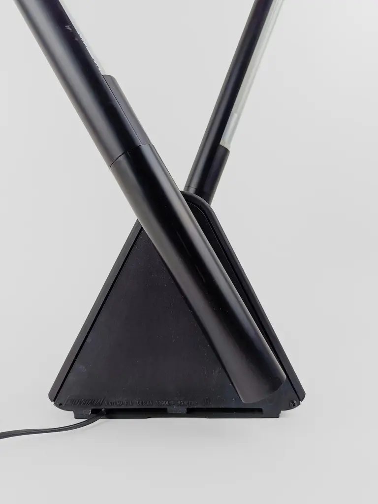 "Sistema Flu" is a magical lamp, and every time we find one in some corner of Italy we buy it to offer it to our customers.In this case we have 2 pieces of the tallest model, 180cm of twin floor lamps that will make you feel like Anakin Skywalker when he decides to use the Jar'Kai fighting technique with 2 lightsabers.Designed in the 80s by Rodolfo Bonetto, designer of many iconic pieces of Italian design such as the Boomerang armchair for B-Line, the Melania chair for Driade and the Lipstick Mirror, it was awarded the Compasso d'Oro award 8 times.The "Sistema Flu" lighting system is designed to bring light to every part of the house with a complete system that has different solutions and sizes: chandelier, table lamp and floor lamp. "Each of these models is perfect because this lighting project works in every size and model, combining function and playfulness.Two adjustable arms start from a black metal body with a triangular section which hold and repair the two lamps.This project was created during the 80s so it used neon lamps but we completely rewired the electrical system by a professional so as to be able to use LED technology, which is more ecological and with lamps that are easier to find than neon which is now almost out of production.The two arms of these Post Modern floor lamps are not only adjustable up to 180 degrees but also allow you to direct the light by rotating the part containing the lamps 360 degrees.I imagine this pair of floor lamps in a minimal home, with a few right pieces that stand out on walls with rough concrete resin finishes or in a Tecno Club.The floor lamps have been rewired by a professional and the LEDs are included in the price.One of the floor lamps is missing caps in the lower part of the arms, although it is not visible we would like to inform customers.one of the bases has traces of glue, probably from an old repair.The price refers to the single Floor Lamp