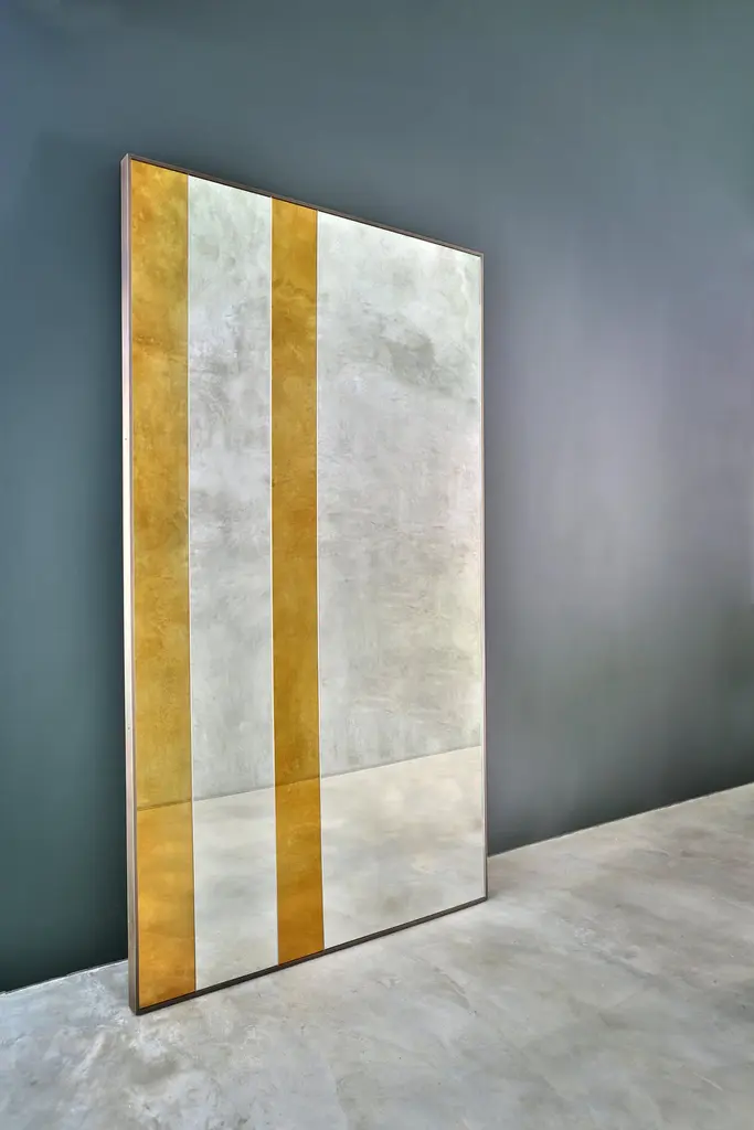 Strip Glass Mirror, Golden Antique Strips And Brass Floor Mirror by Casa Casati Dimensions: D 5 x W 120 x H 210 cm. Materials: MDF, brass, and glass mirror.Available in different material options. Please contact us.A furnishing accessory which plays with our perceptions, creating changes of colour and slight vibrations in our sense of space. Strips of coloured mirror alternate with others in clear or fume mirror to make an imposing panel framed in metal in Dark Bronze finish, with screws finished to match.The decorative effect of the mirror is particularly suggestive thanks to the reflections of the coloured mirror, Antique Gold, Sunset Pink or Cobalt Blue, and thanks to the delicate glow from the back panel, as always, finished in our signature colour Casa Casati orange. The Strip is also available as a wall-hung version upon request.Atelier Casa Casati. Italian Lifestyle. Italian Skill. Italian Furniture.Excellence of materials, love of detail, creativity. This sums up the design philosophy of CASA CASATI. The atelier was created in 2016 by architects Bosco Fair and Emanuele Genuizzi, who, following years of experience in the field of interior and product design, bring to this project the cultural and aesthetic values of the highest Italian tradition. A tradition that takes form thanks to the work of the most qualified artisans of Brianza. It is in their hands that the “Italian Dream” becomes reality. It’s their skill which gives life to unique pieces, characterized by precious materials, sophisticated finishes, and unusual combinations which never fail to surprise. Thanks to the use of natural materials and expert manual labour, each of the CASA CASATI pieces has its own ethos, showing specific characteristics which highlight their value as unique pieces. Special interior projects and limited edition pieces can be developed upon request.CASA CASATI: classic elegance and a contemporary aesthetic mix together to create something indisputably of its time.