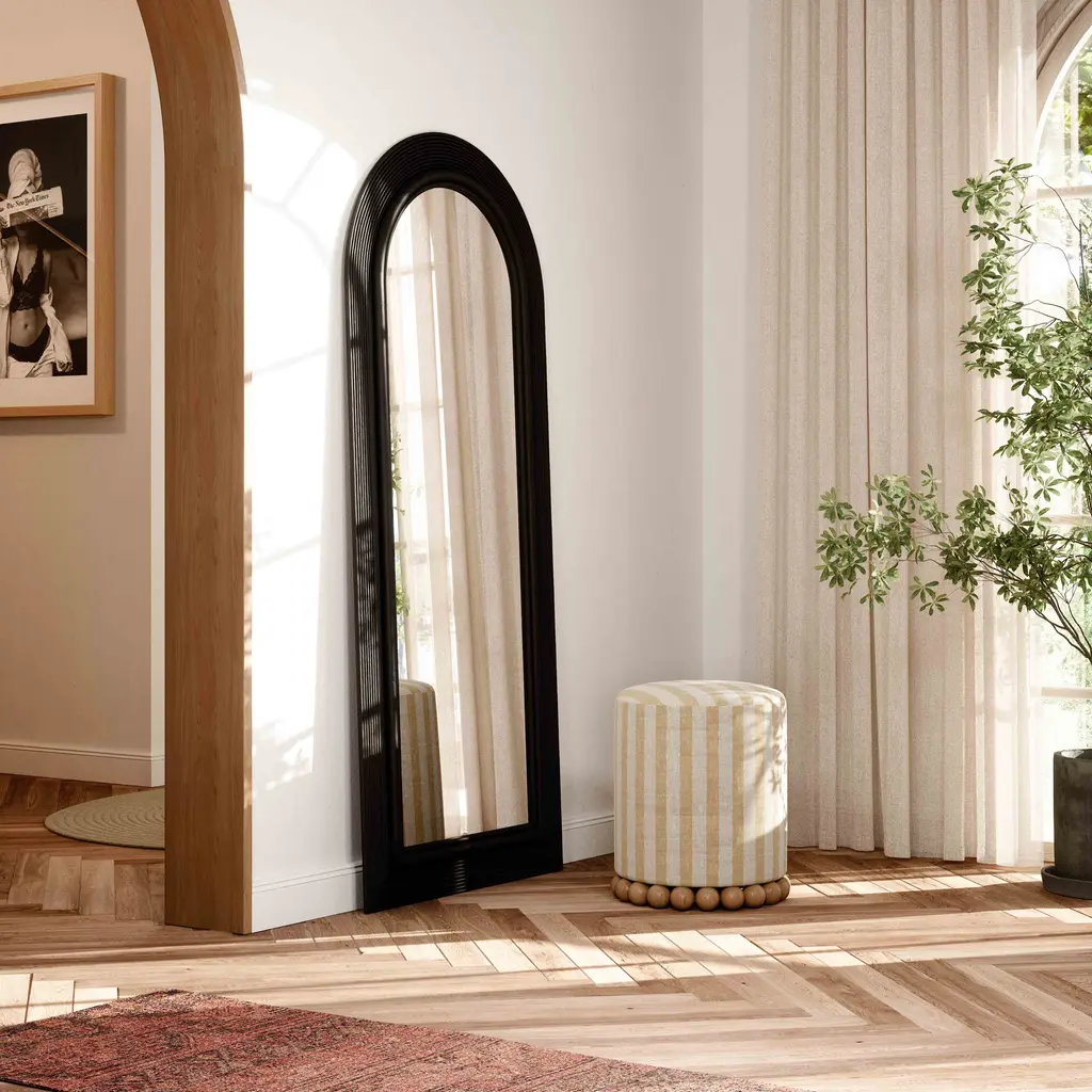 Discover the Tanya Rattan 70" Floor Mirror, a stunning fusion of natural elegance and Bohemian flair, available in both natural and black finishes. Crafted with natural raw rattan and cane, this mirror exudes an earthy vibe, perfect for bringing a touch of the outdoors into your interior space. Its distinctive tubular framing and graceful arch design elevate the piece, making it not just a mirror but an artful statement in any room.