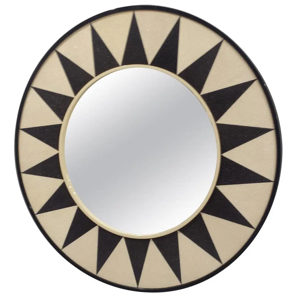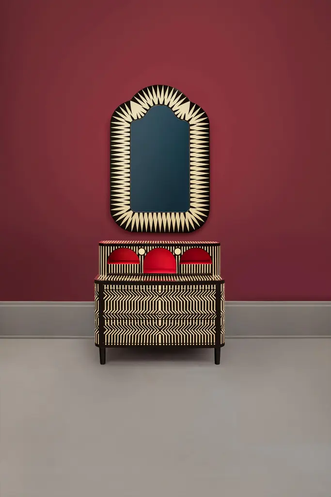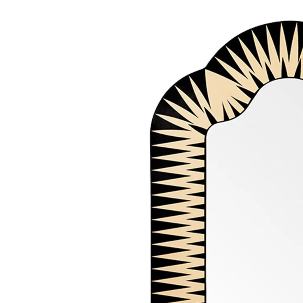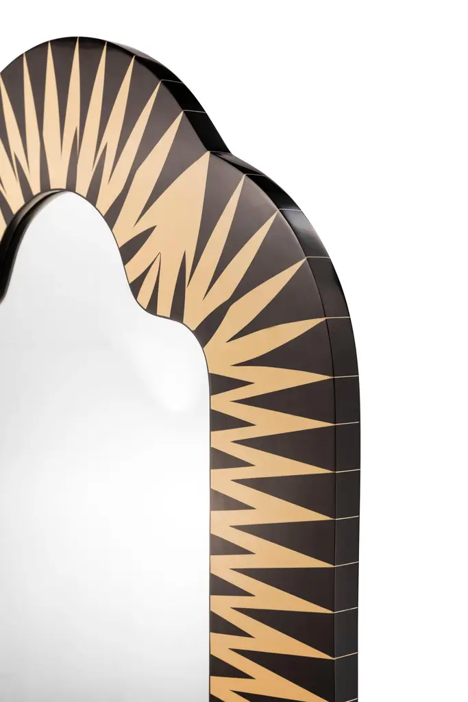 The Big Parade Tall Floor Mirror by Matteo Cibic is a large fun shaped mirror. It stands tall in any interior space.India's handicrafts are as multifarious as its cultures, and as rich as its history. The art of bone and horn inlay is omnipresent here. Artisans from the Northern region of Sarai Tarin, to Bengal in the East, and Trivandrum in the South, have imbibed the ancient technique from Himalayan tribes, and have made their own mark along the way. The intricately crafted combs, vases, toys, and other objets d'art have long been a connoisseur's delight, and a means of livelihood for millions. When the founders of Scarlet Splendour and designer Matteo Cibic went on tour, in search of inspiration for their first collection, they were captivated by the exquisite bone marquetry. They decided to make a contemporary version of the playfully geometric designs, which would be accepted across the world. Cibic then developed a resin compound, and the company carried out trials with the material until they found the right mix. The resin would replicate ivory inlay, on a base of plywood, ultimately smoothened and lacquered to have no visible or tactile end. Each piece of the Vanilla Noir collection would then be made in India, by local craftsmen using locally sourced materials and pigments. The aim was to combine Indian workmanship and Western aesthetic in such a way that each piece appears timeless, and with multiple roots. In the unique decorative imprints one would recognize Indian styles, and also unexpected drifts to Italian design. The company's founders wanted to proudly showcase the fine art and making capabilities of their native India, and give the craftsmen due recognition. They have successfully paid homage to their heritage by elevating indigenous art and taking it to global design platforms.Care: Wipe gently with dry soft cloth. Liquid spillage must be wiped without delay.Please note: Each piece in the Vanilla Noir collection exalts the handmade, the painstakingly crafted, the authentic. A piece may have slight variations and tiny imperfections but these are the marks of an artisan, a testament to the individuality of each work of art. It is our belief that these variations infuse our objects d'art which desire and we assert our right to make the necessary qualitative changes. Prices do not include VAT. VAT may be applied depending on the ship-to location.