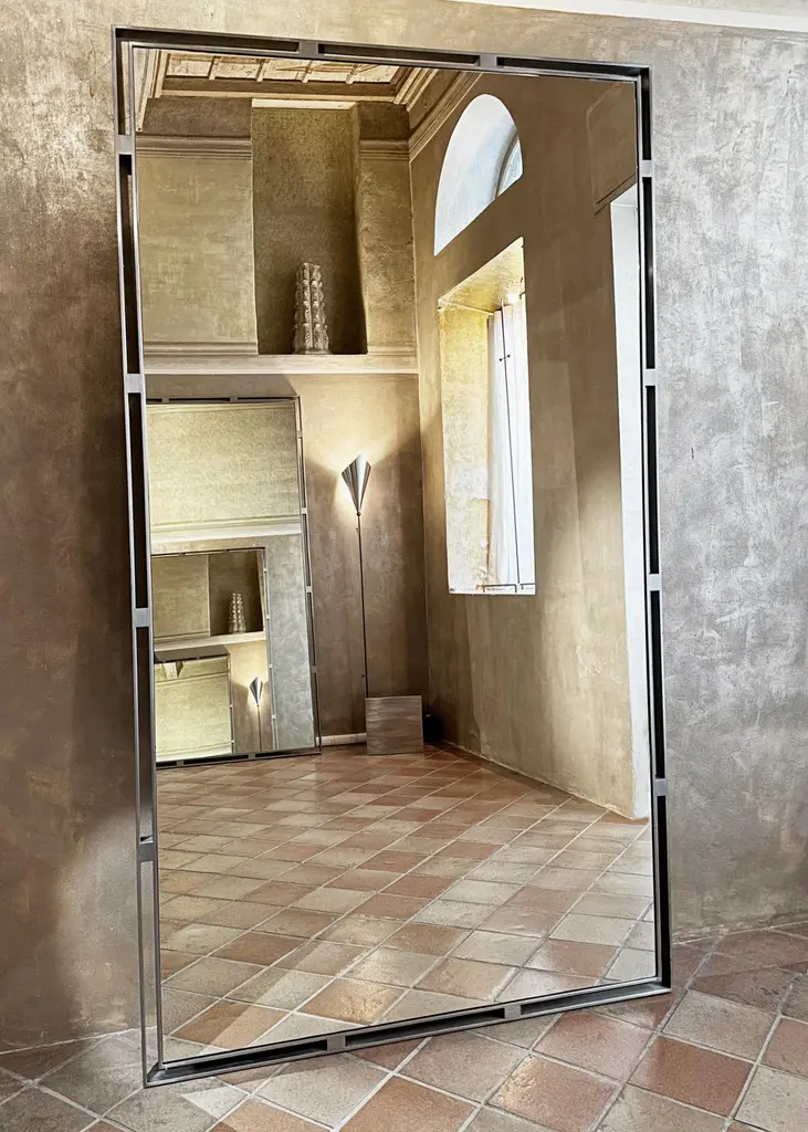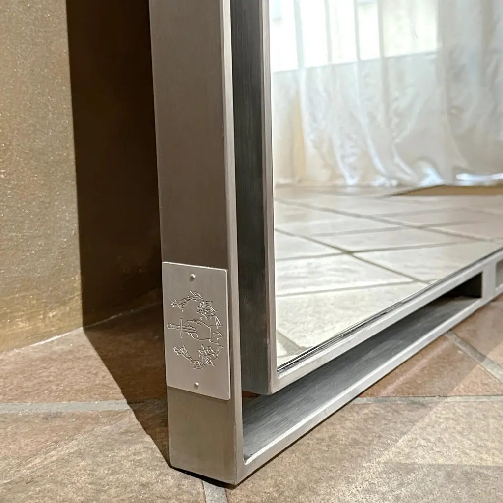 “They're Hanging Me Tonight” Mirror, Iron, JAMES VINCENT MILANO, Italy, 2022Full-length/floor mirror.Polished and brushed iron.Engraved logo plaque in satinated brass.Handcrafted in Cantù, Italy.Height: 270cm Width: 150cmDepth: 5cmEach piece is made-to-order. Bespoke, one-of-a-kind commissions available.Cleaning/Care Kit with instructions included.JAMES VINCENT MILANO is a multidisciplinary design studio founded by Maria Valerio and Zachary Johnson in 2017. Offering bespoke garment and footwear, leather goods, objects and collectibles, furnitures and interiors. The duo designs and exclusively manufactures throughout Italy.