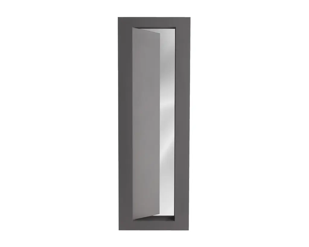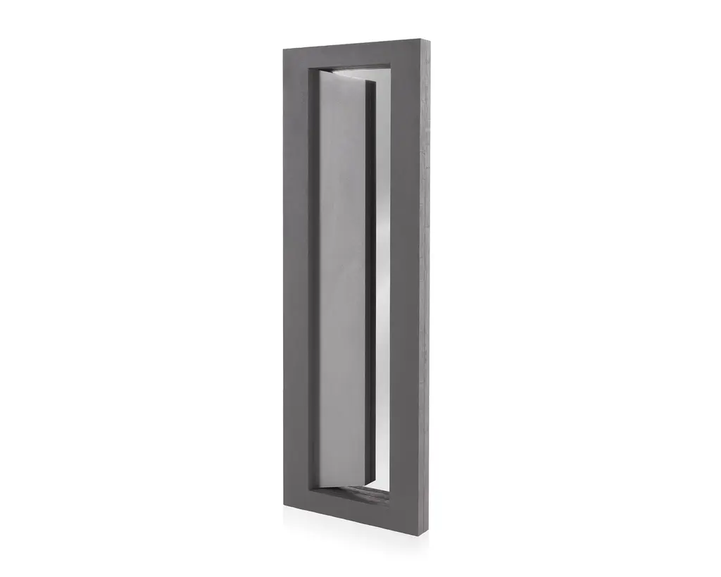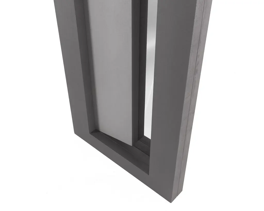 Doors and windows to the imagination, concrete fragments, visionary passages. Leaning on the wall or on a console, Undism mirror shows itself as a simple form of altered perspectives, opening to another dimension of living. Standing mirror with frame made of two wooden blocks in different cement finishing colour: grey and anthracite. Back with supermirror steel slab. Labeled by Maker,Numbered,Labeled by Maker,Numbered