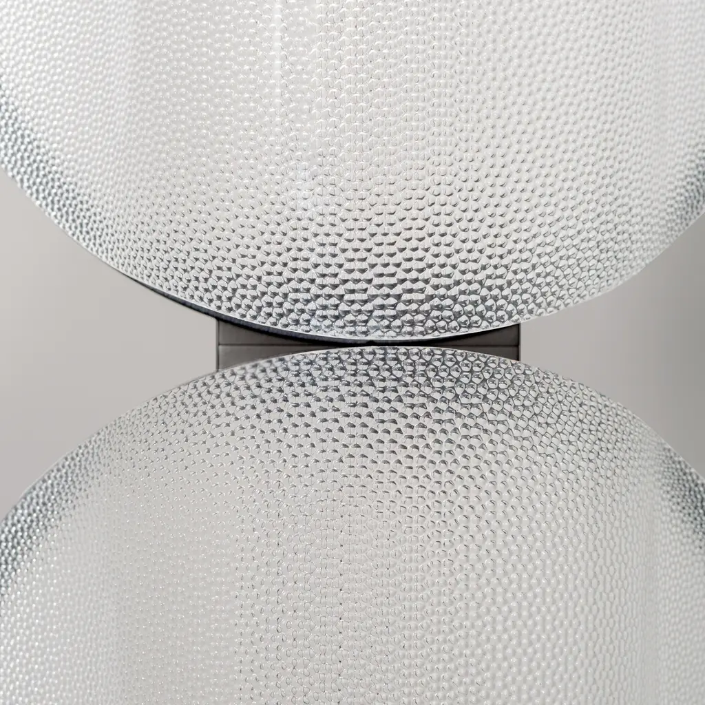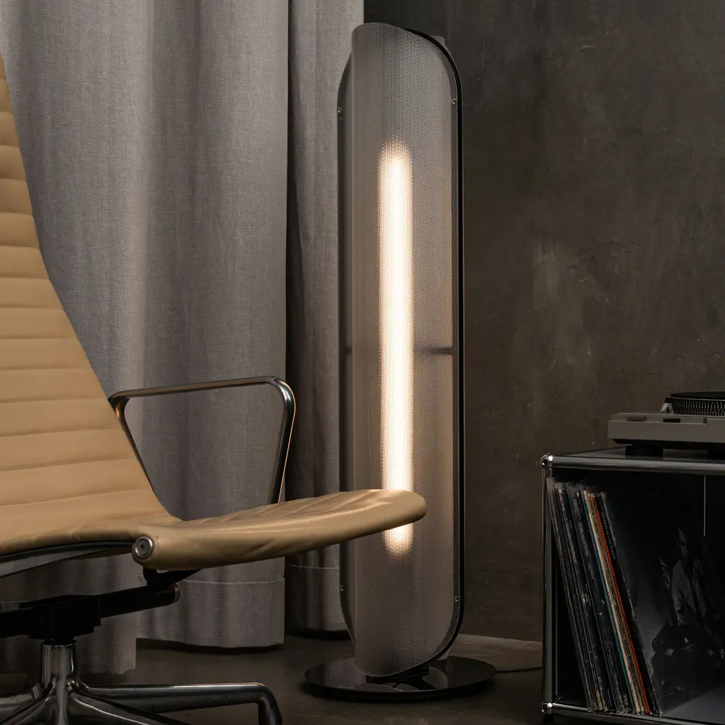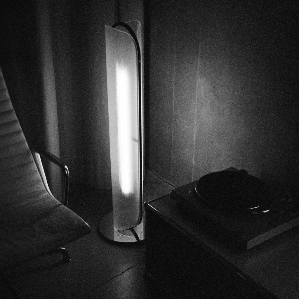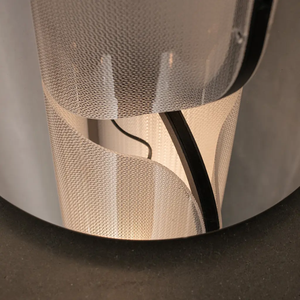 Vale’s thermo-formed curvilinear profile gets amplified in the polished reflection at the base of its floor lamp version, with single or double-stacked modules standing on the weighted mirror disc. With its delicate frame in a choice of metal finishes, the undulating profile of the lens creates a soft hue and ambient diffusion that can be adjusted by a dimmer.