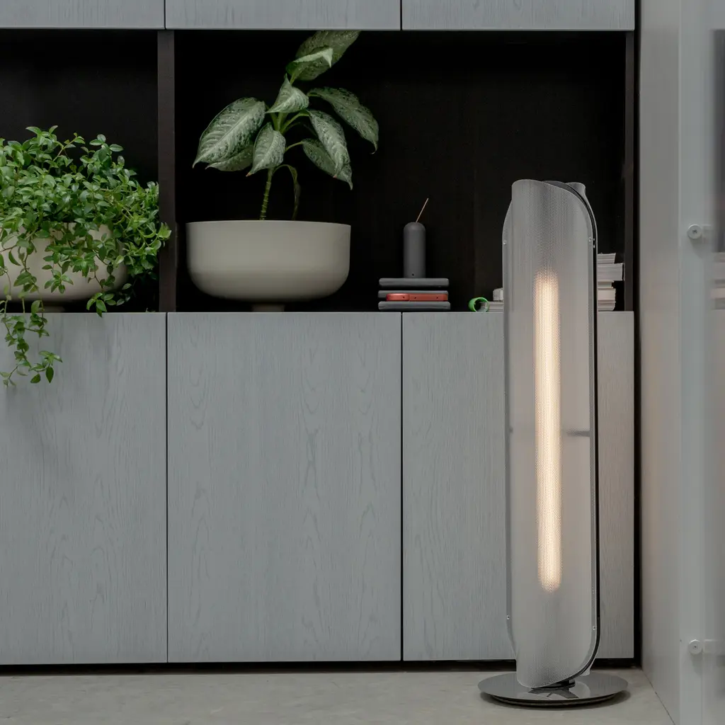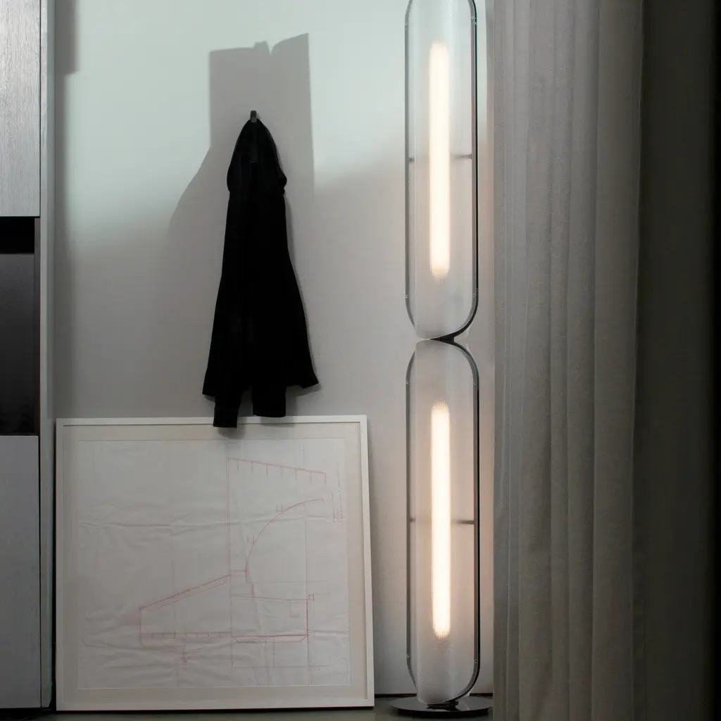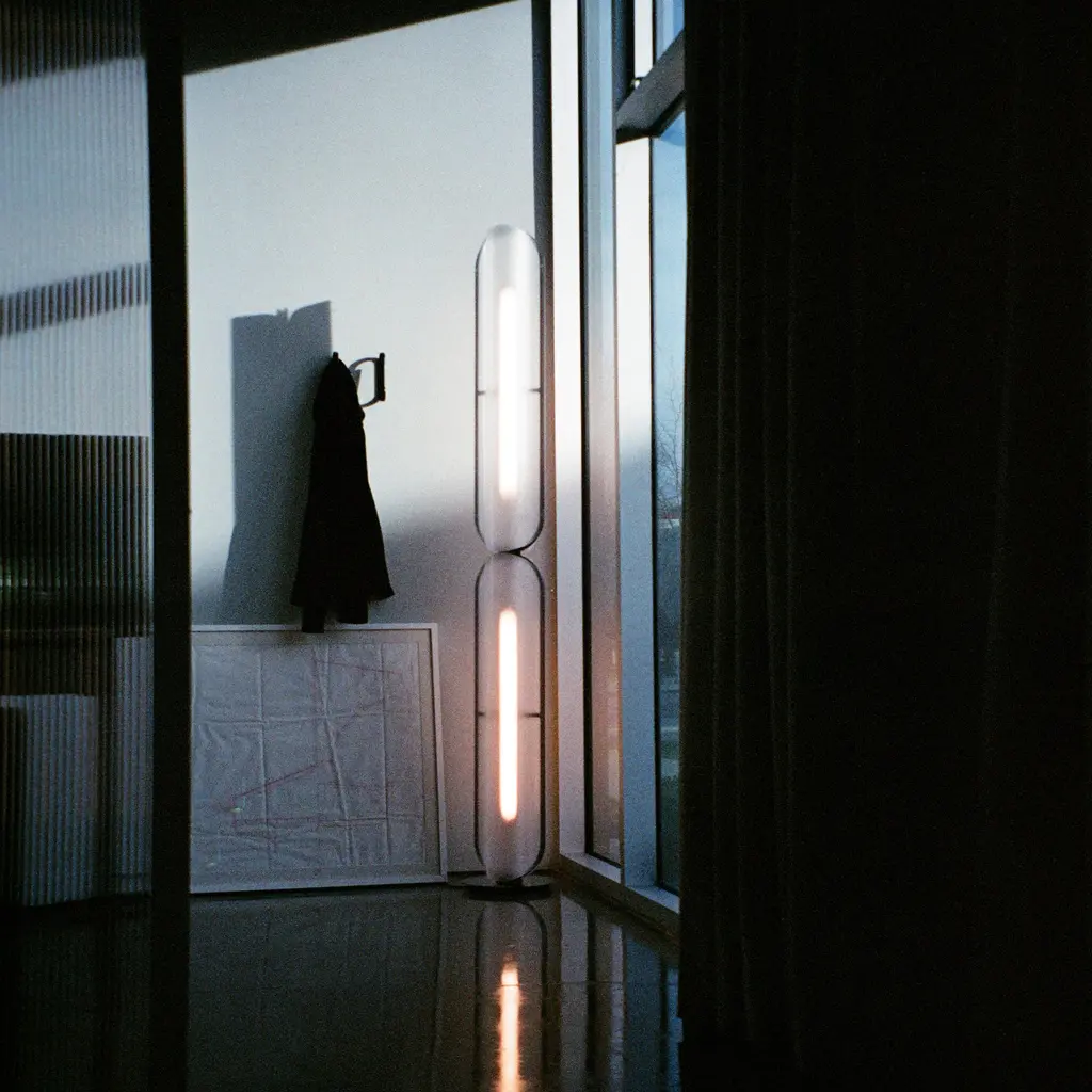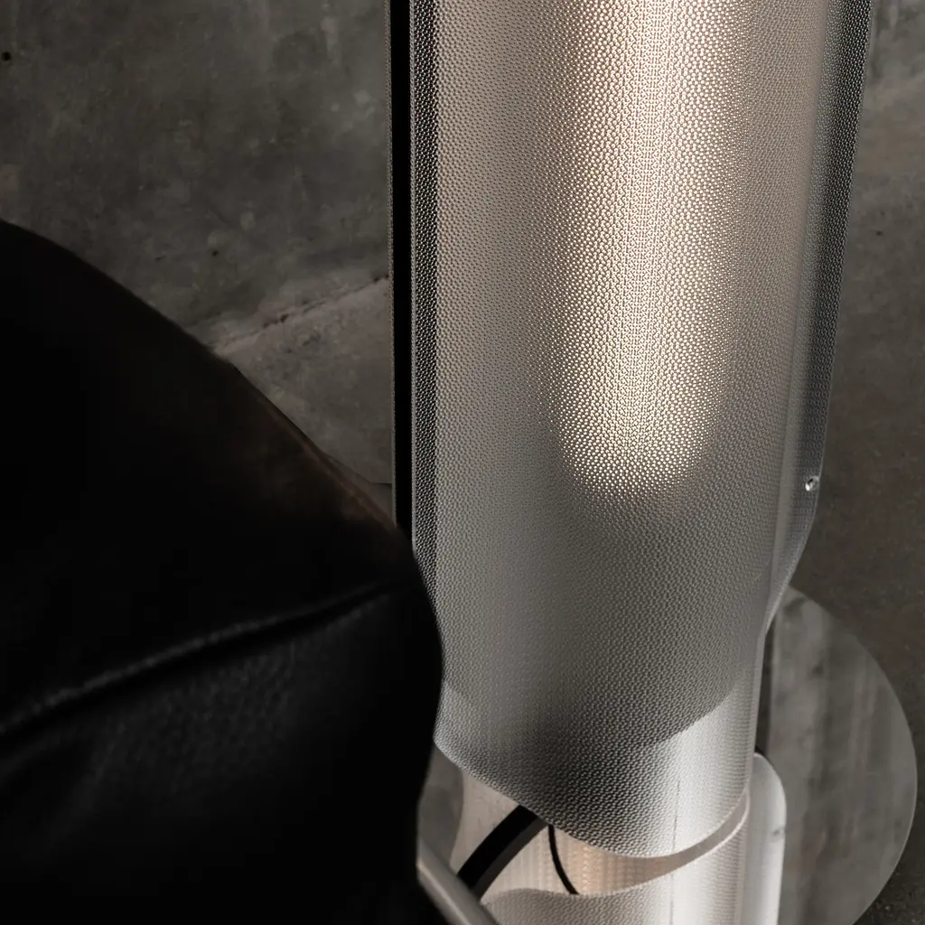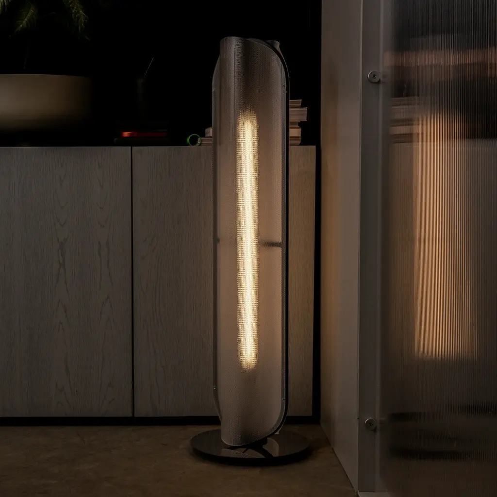 Vale’s thermo-formed curvilinear profile gets amplified in the polished reflection at the base of its floor lamp version, with single or double-stacked modules standing on the weighted mirror disc. With its delicate frame in a choice of metal finishes, the undulating profile of the lens creates a soft hue and ambient diffusion that can be adjusted by a dimmer.