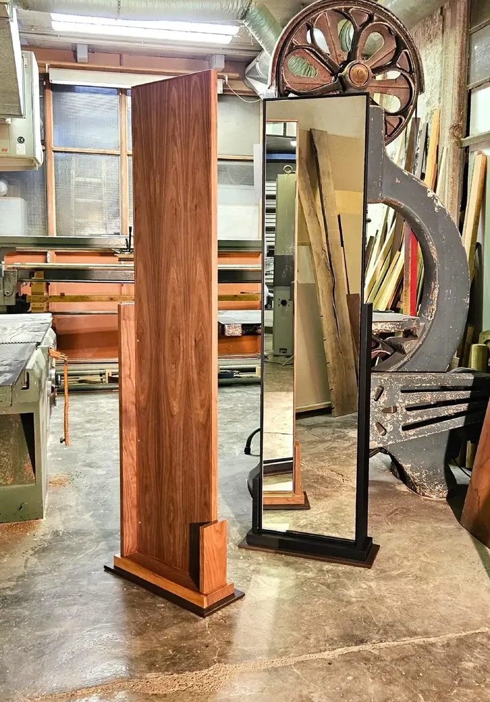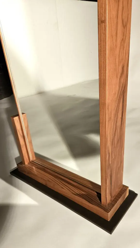 Floor mirror made of Canaletto walnut. Mirror on the front, the back in the same essence. Base with metal weighting plates.